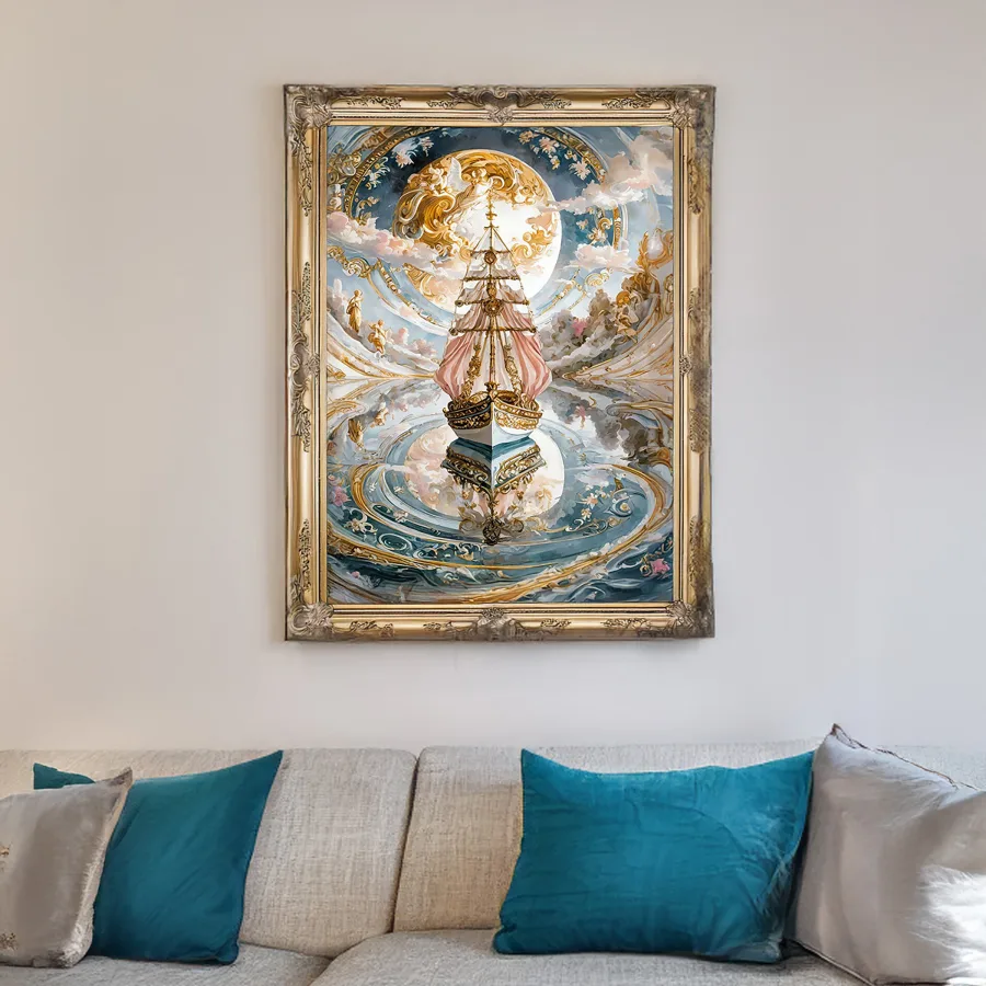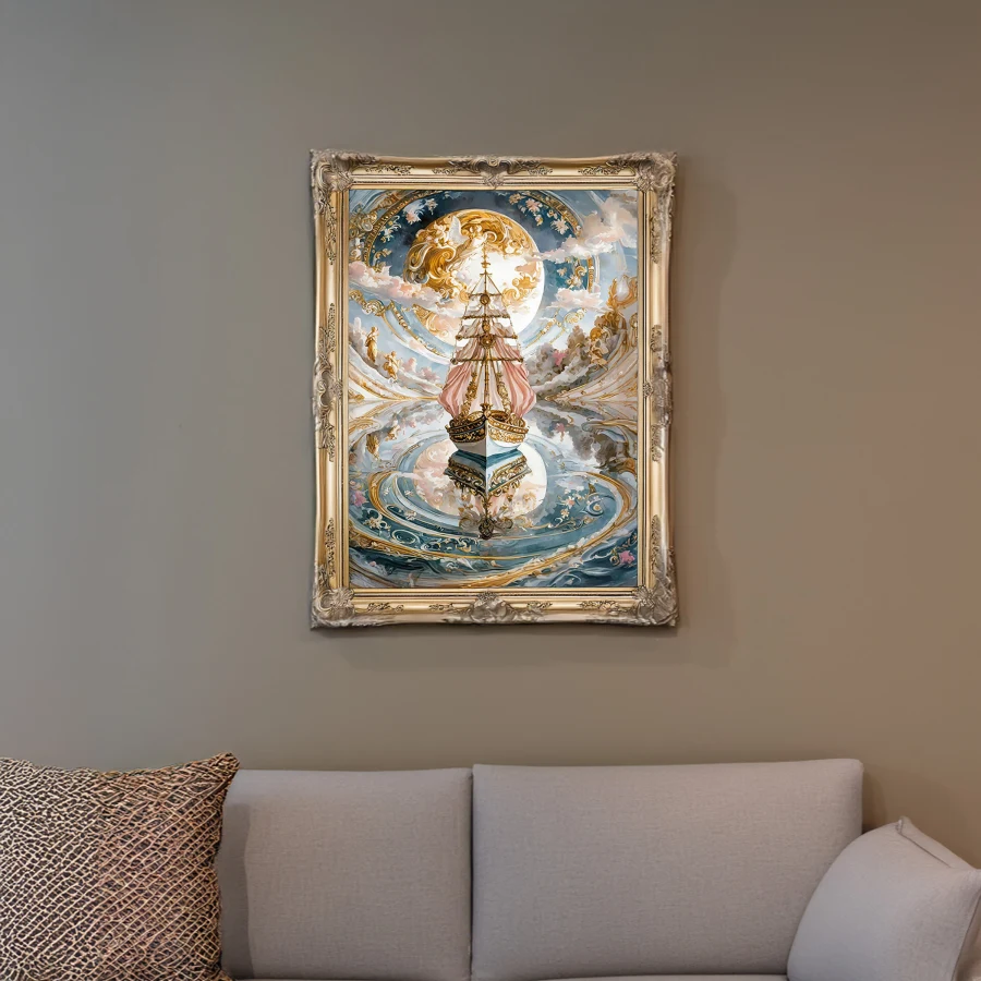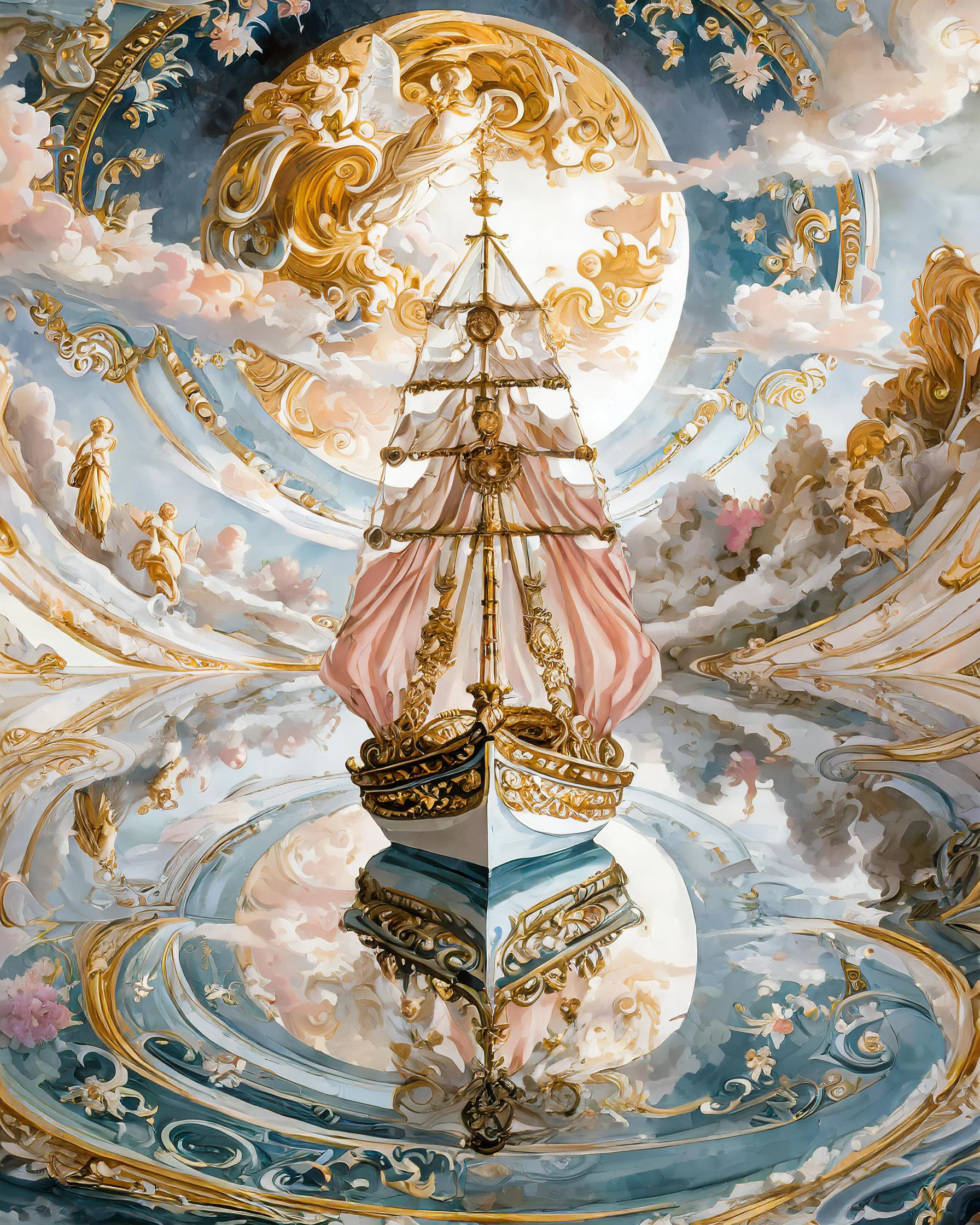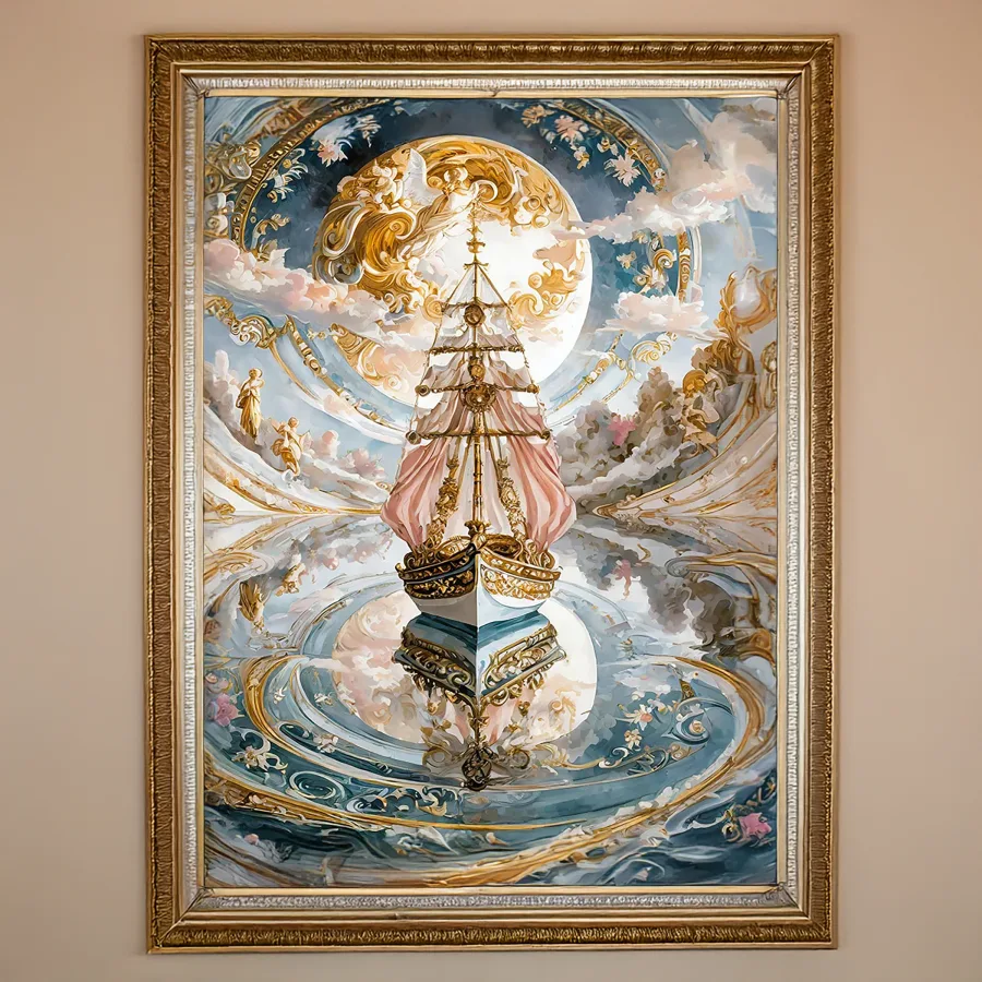 A magnificent galleon defies gravity as it glides through cotton-candy clouds, its gilded sails billowing with impossible grace and crystalline dewdrops trailing in its wake. The piece masterfully blends baroque extravagance with ethereal rococo whimsy, creating a dreamy fusion where every swirl and flourish seems to dance between renaissance grandeur and fairy tale enchantment. Listen, if you're not immediately imagining yourself as some sort of celestial pirate captain living your best afterlife while sailing through this sparkly wonderland, we clearly need to have a serious conversation about your imagination goals.