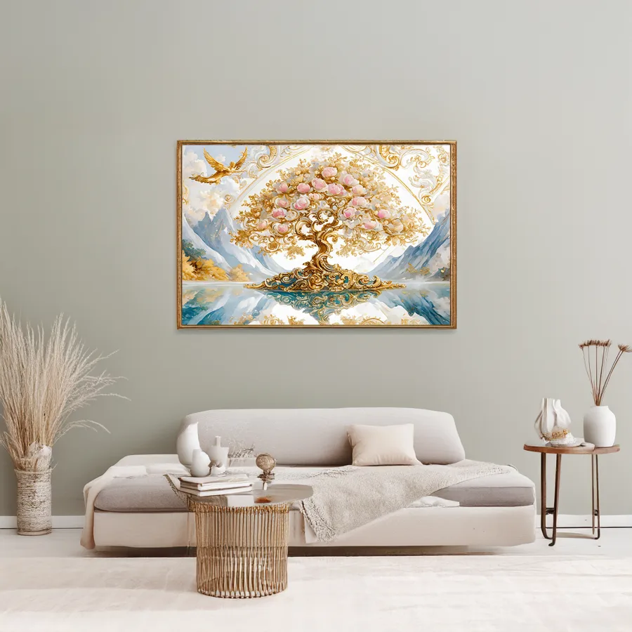 A magnificent golden tree pulses with otherworldly light, its branches dripping with crystalline roses that seem to catch and amplify every ethereal gleam. Like some fever dream lovechild of a baroque palace and a Final Fantasy cutscene, the scene marries rococo excess with anime's signature impossible beauty. Listen bestie, if your phone background isn't making people gasp and ask if you somehow downloaded a piece of Marie Antoinette's fever dreams, you're honestly doing yourself dirty.
