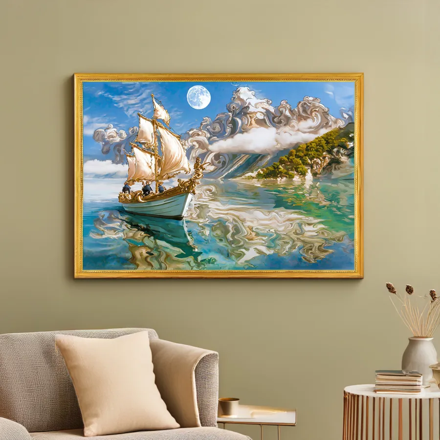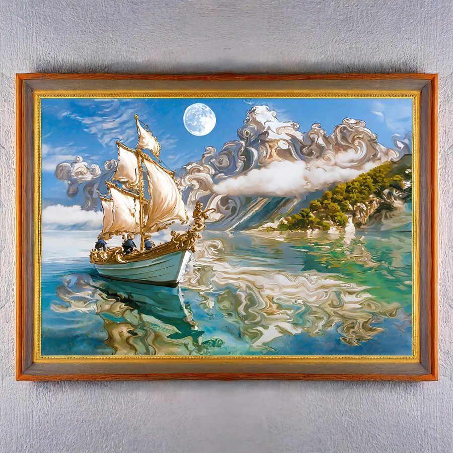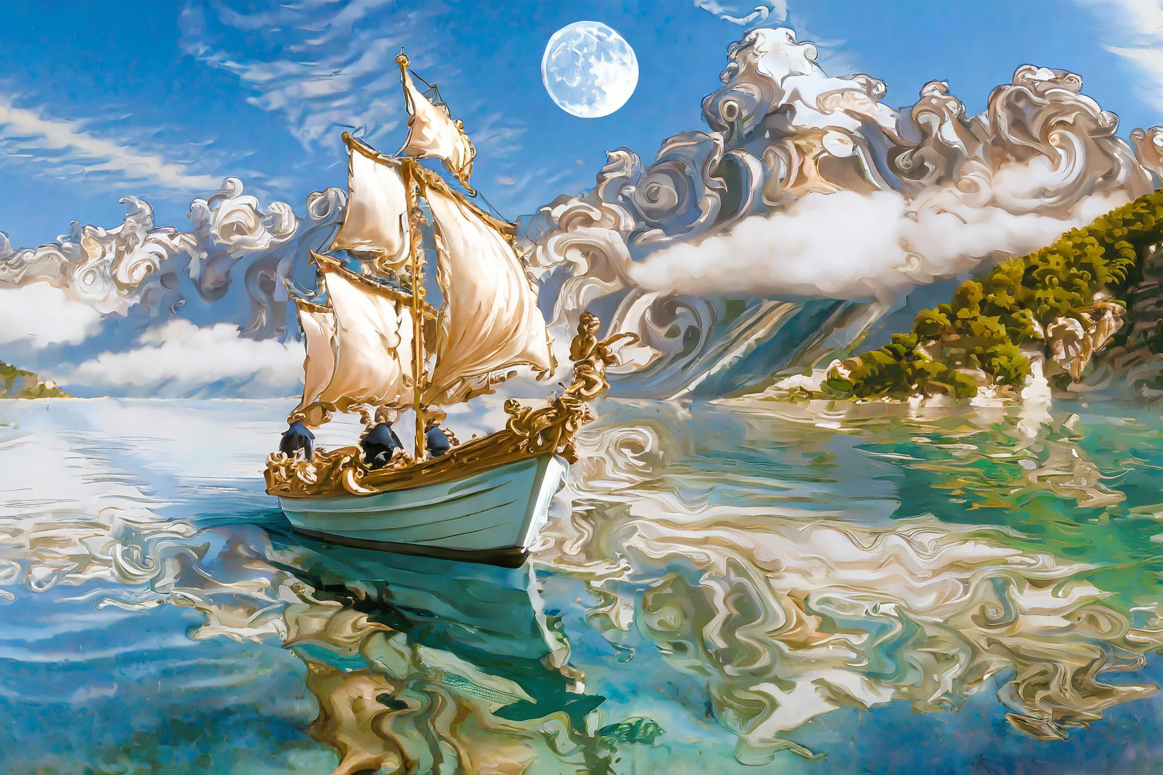 Moonlit clouds spiral and dance above a solitary sailboat like some cosmic Van Gogh fever dream, threatening to pull the entire scene into their hypnotic vortex. This ethereal seascape merges whimsical turquoise waters with wind-swept sails in a style that feels like Pirates of the Caribbean stumbled into an impressionist painting and decided to stay awhile. Look, if you're not already imagining yourself as the protagonist of some magical seafaring adventure while staring at this piece, you might need to check your pulse - or at least your sense of wonder.