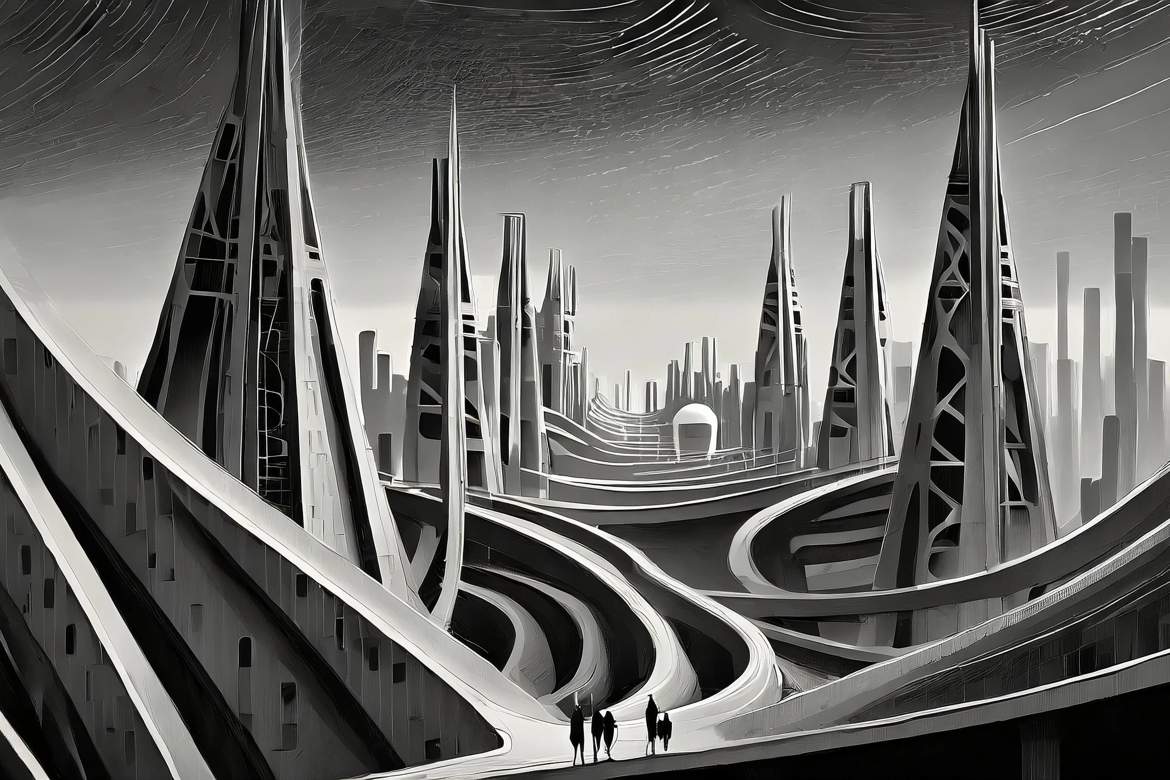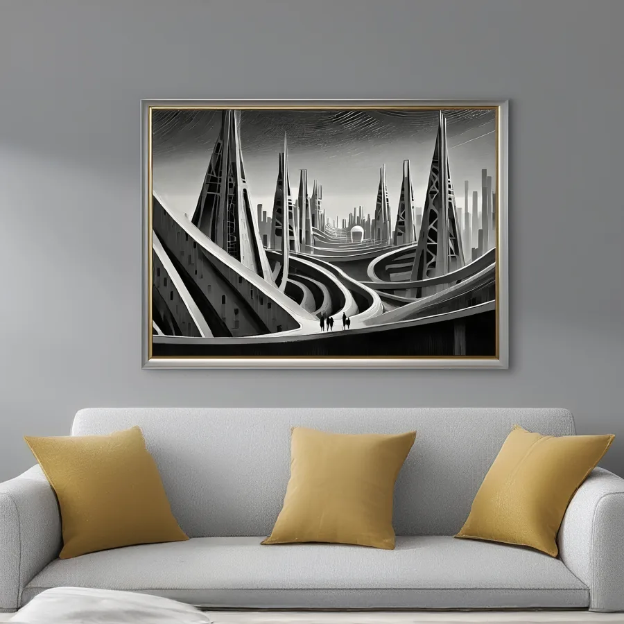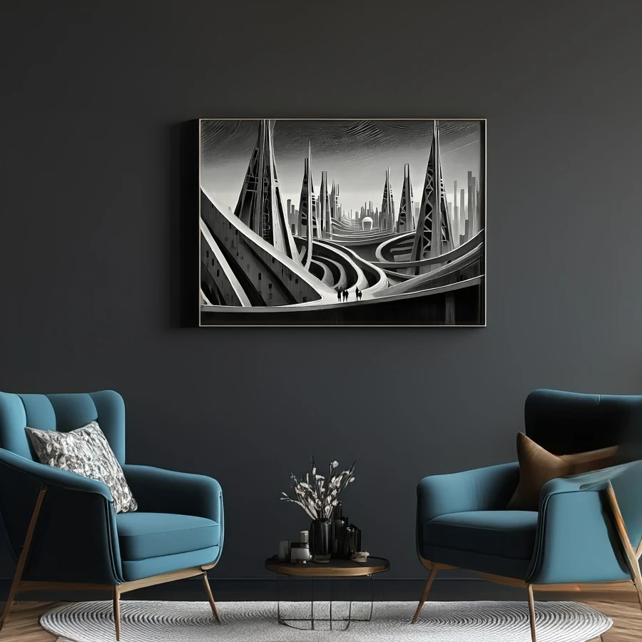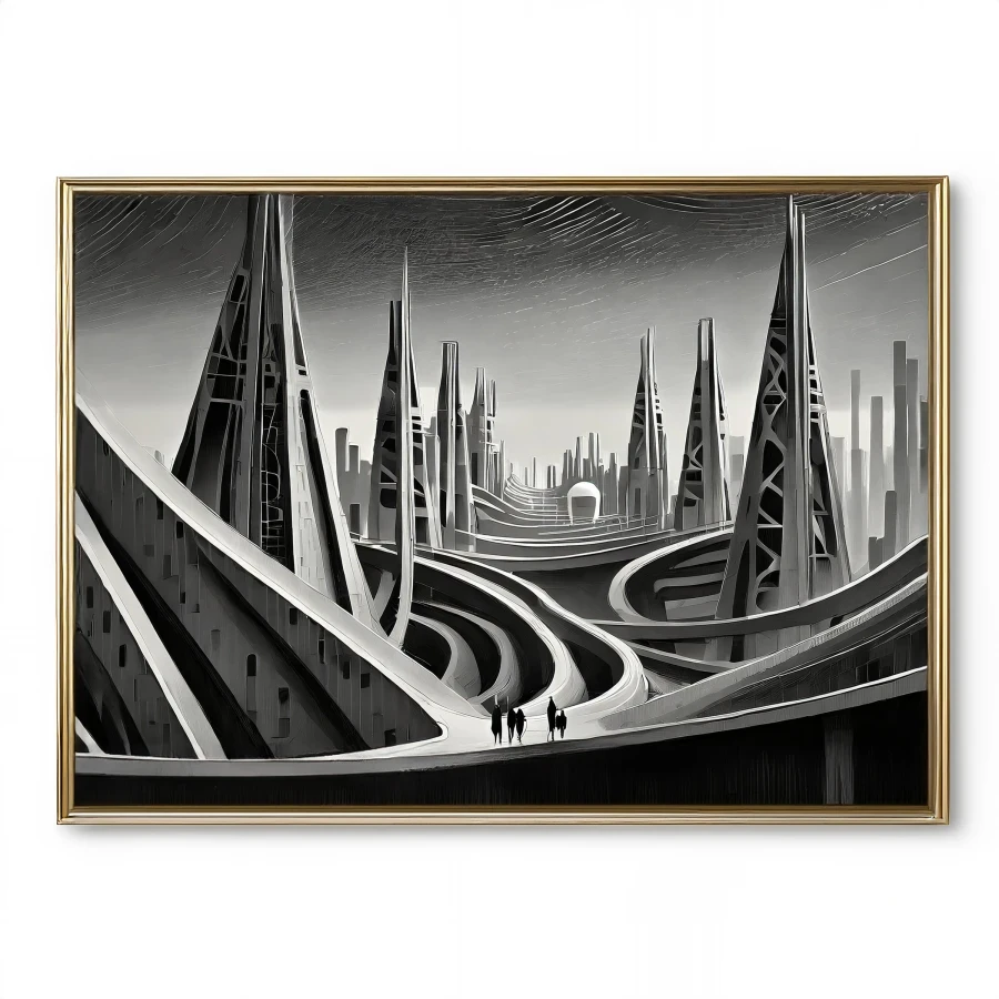 Towering crystalline megastructures pierce the smog-filled sky like obsidian needles, their impossible curves defying both gravity and sanity. The stark monochromatic palette creates a retro-futuristic fever dream where Art Deco meets cyberpunk, all clean lines and dramatic shadows that would make both Fritz Lang and Ridley Scott weep with joy. Look, if this doesn't make you question your life choices while simultaneously wanting to hang it in your stupidly expensive minimalist apartment, I don't know what will.