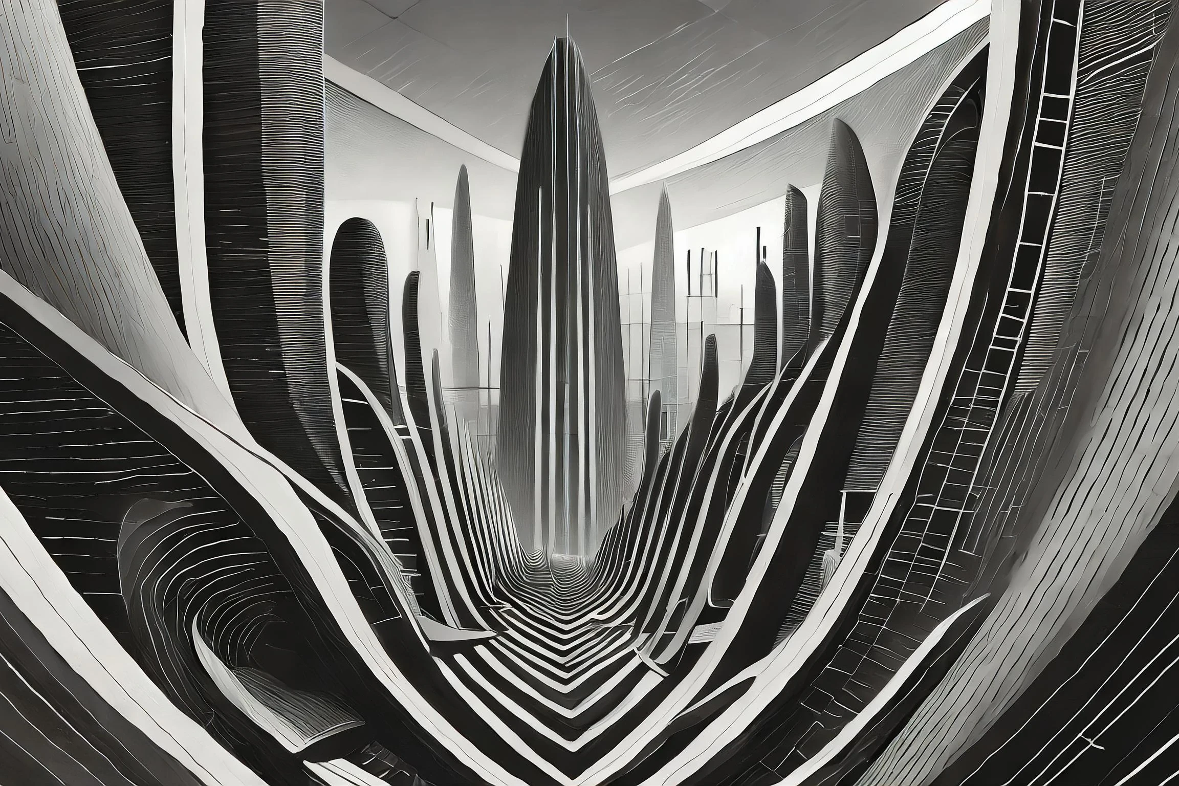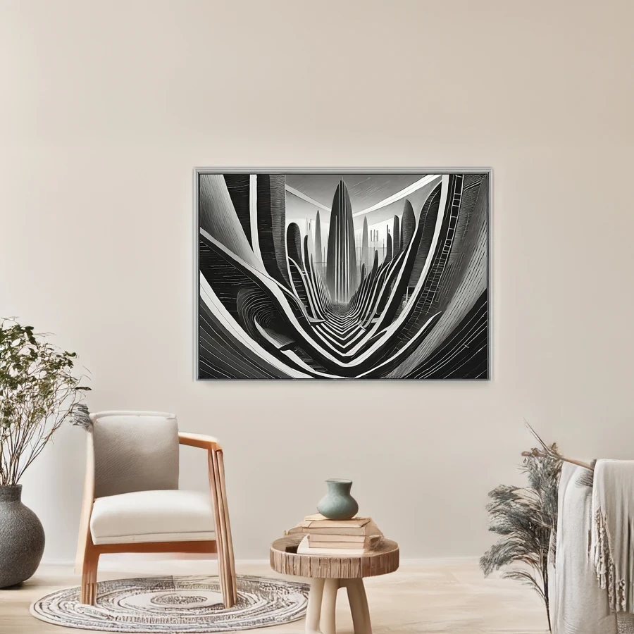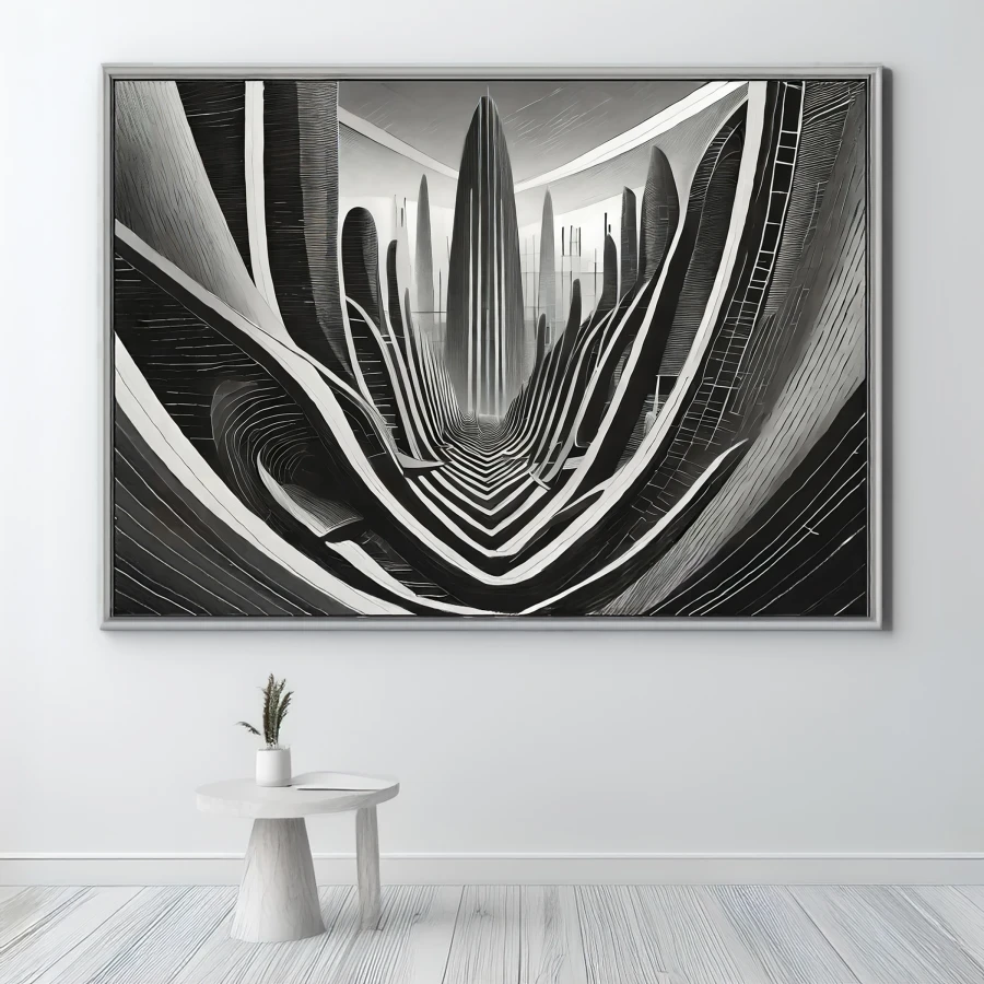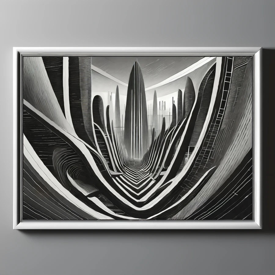 A dizzying monochromatic maze of impossible architecture warps and folds into itself like a geometric origami nightmare having an existential crisis. The piece masterfully blends Art Deco's bold symmetrical patterns with dystopian sci-fi aesthetics, creating a mind-bending visual that makes M.C. Escher look like he was drawing with crayons. Look, if you want to make your architect friends simultaneously jealous and question their grip on reality, this is definitely the piece to casually display in your minimalist office space.