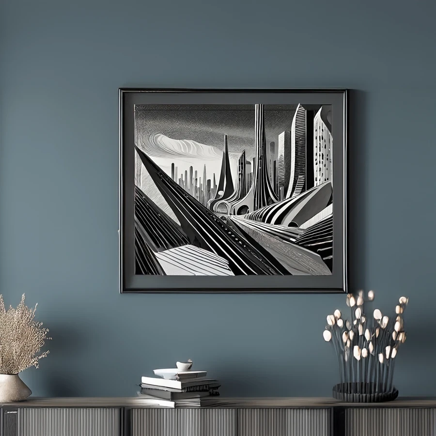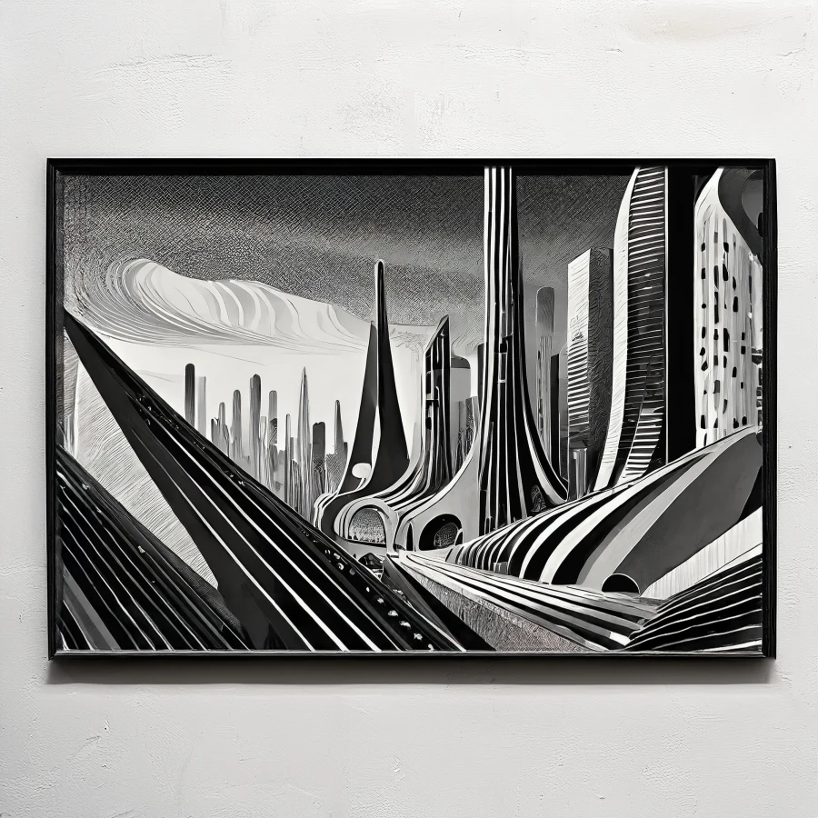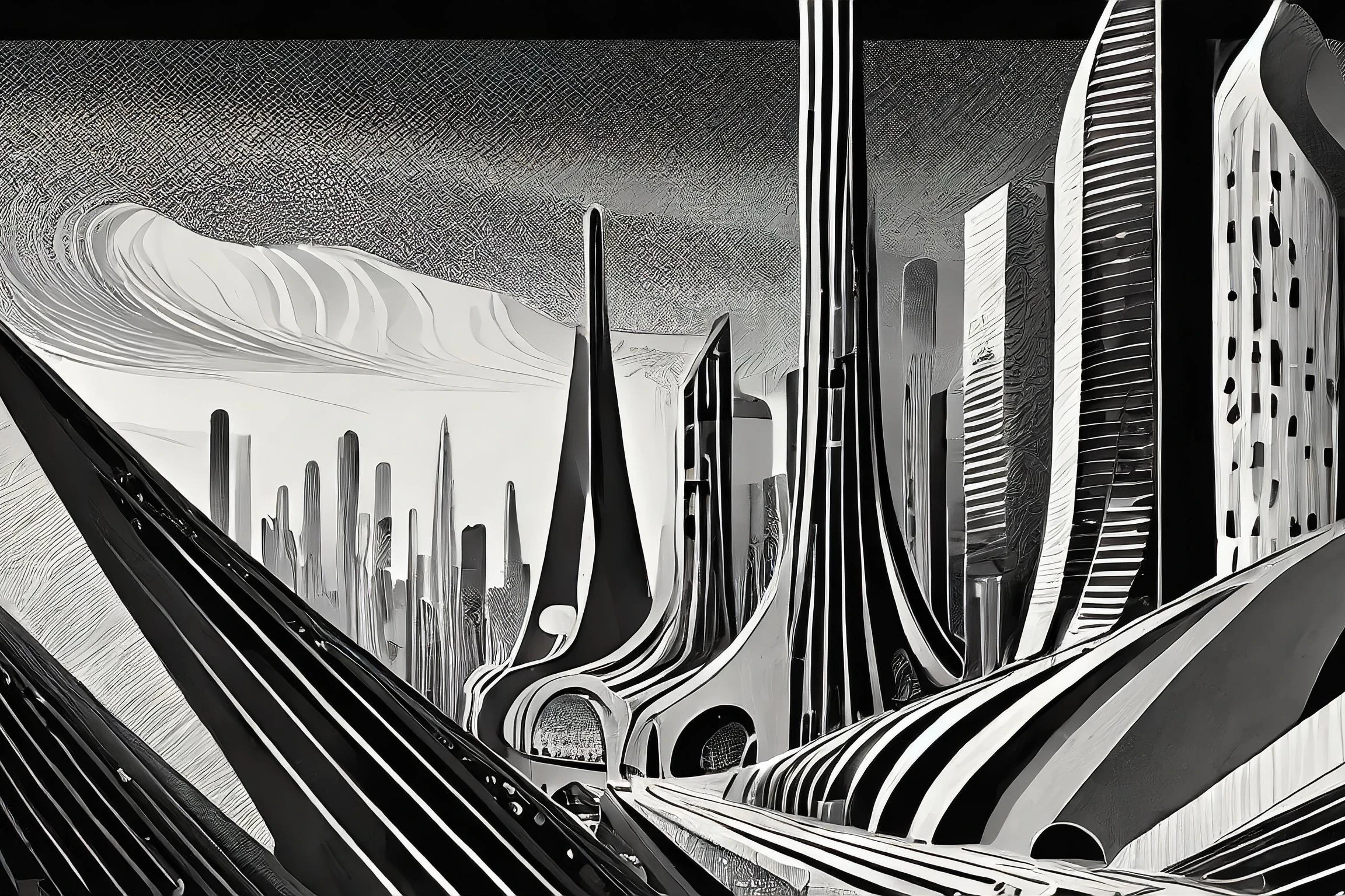 Towering crystalline spires pierce through dense fog banks, their obsidian surfaces reflecting nothing but the void in this monochromatic fever dream of a metropolis. Drawing heavily from Zaha Hadid's fluid geometries but cranked up to eleven, these impossible structures flow and twist like liquid metal frozen in time, creating a retro-futuristic skyline that makes Dubai look like a LEGO set. Listen, if you don't immediately want to paper your entire office with this dystopian architectural acid trip, we probably can't be friends.