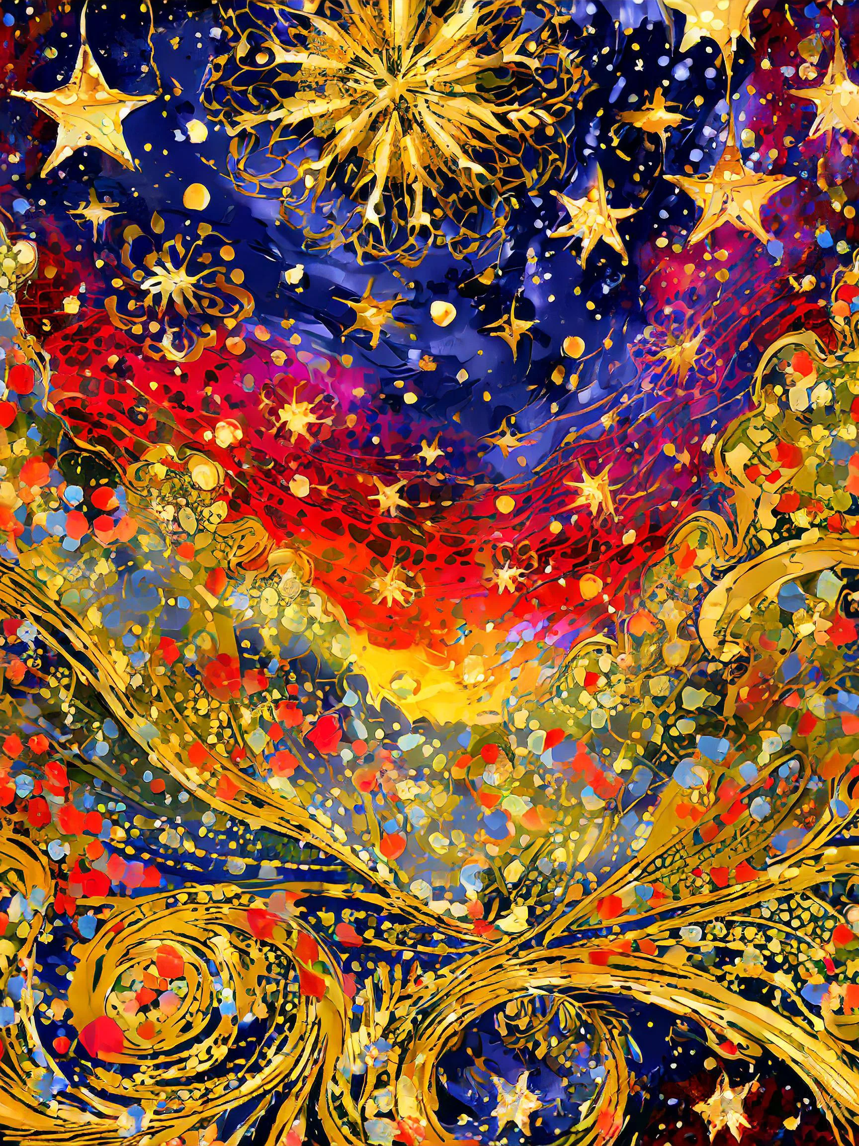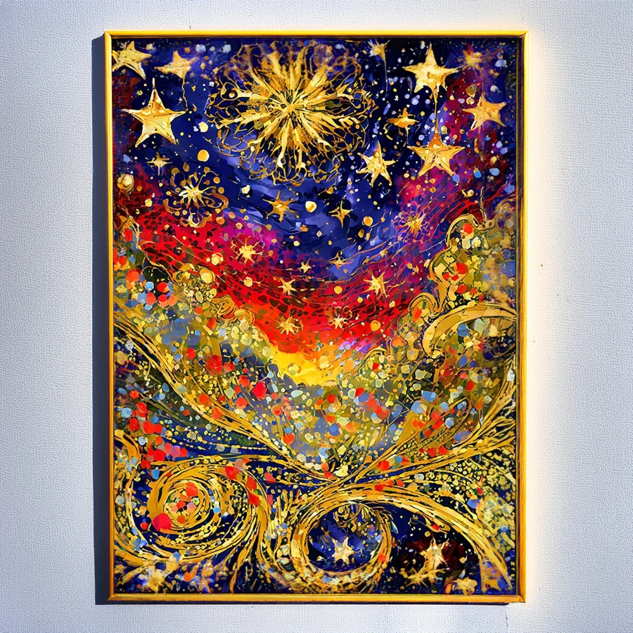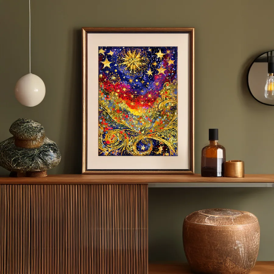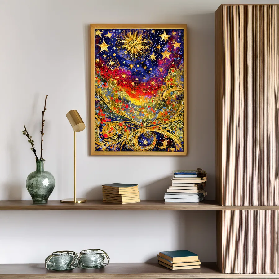 Luminous swirls of cosmic energy explode across the midnight canvas like Van Gogh had a fever dream after eating magic mushrooms. The iconic Starry Night gets a psychedelic makeover, with golden stars morphing into spiritual fireworks that dance through mystical indigo spirals. Listen, if you're not planning to stare at this while lying on your yoga mat at 3 AM questioning the entire universe, you're honestly doing it wrong.