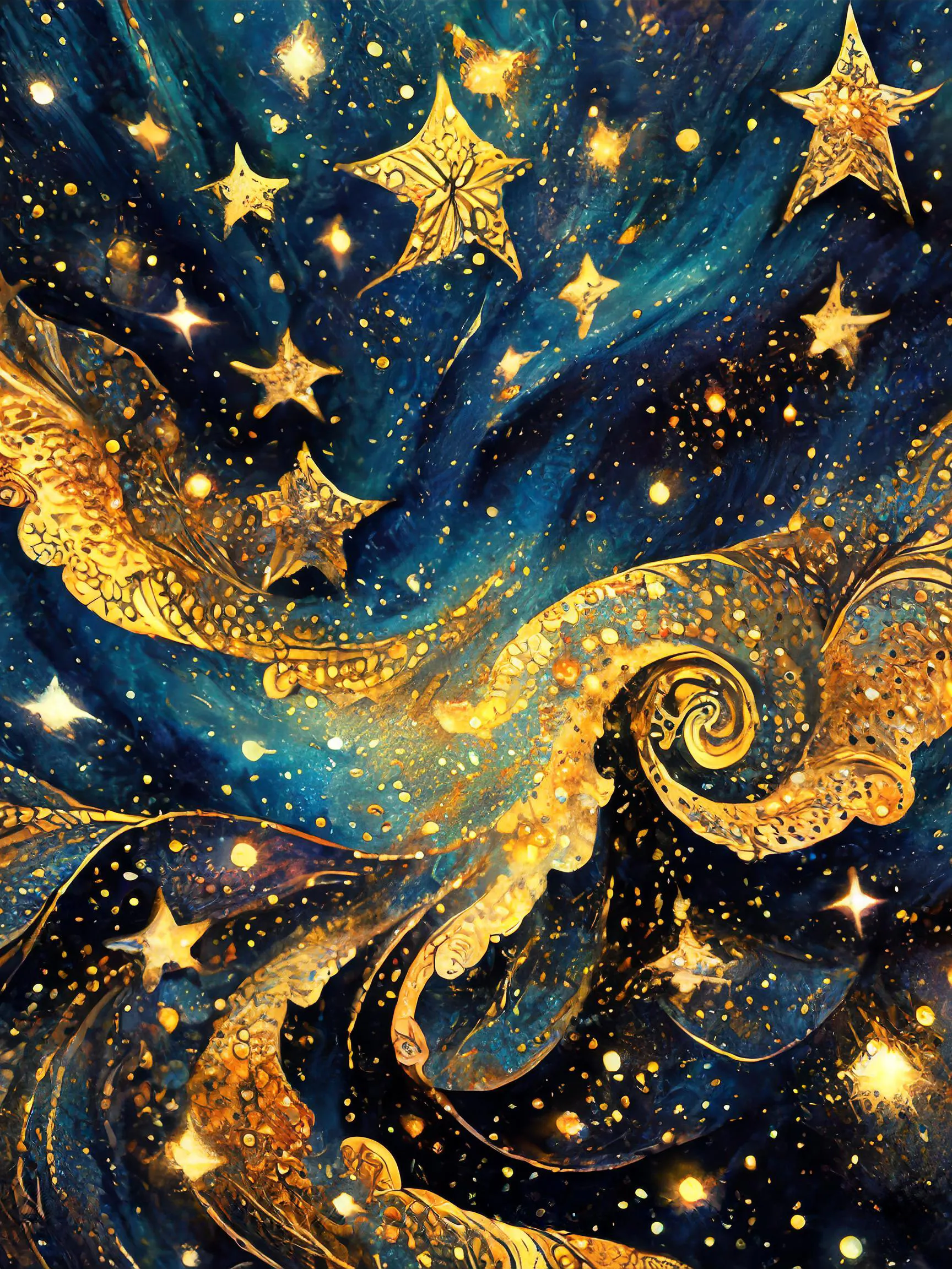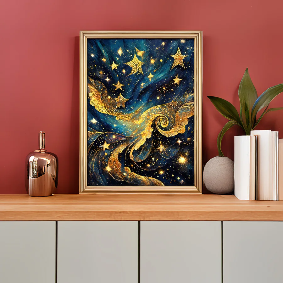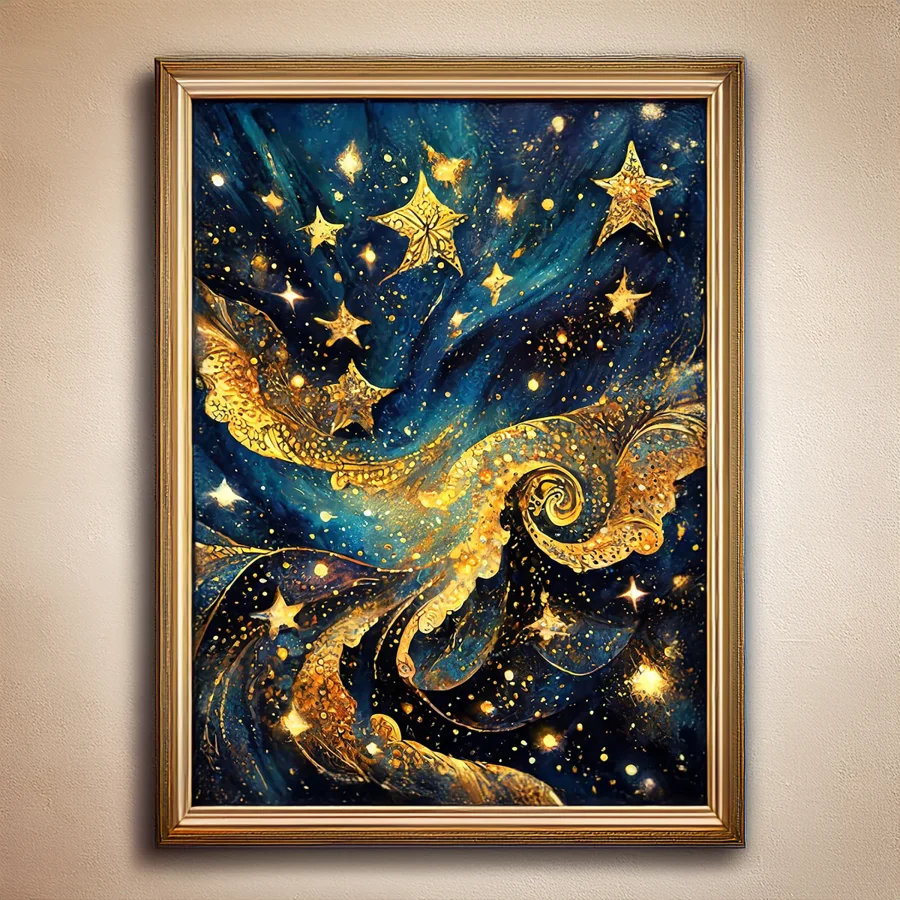 The swirling cosmos erupts in a hypnotic dance of metallic gold spirals against deep navy depths, making you question if you're looking at actual stardust or just really excellent art. These Van Gogh-inspired celestial patterns create a mystical meditation space that screams "yes, I'm totally connected to the universe" without saying a word. Perfect for that friend who won't shut up about their rising sign and has definitely tried to read your palm at least once.