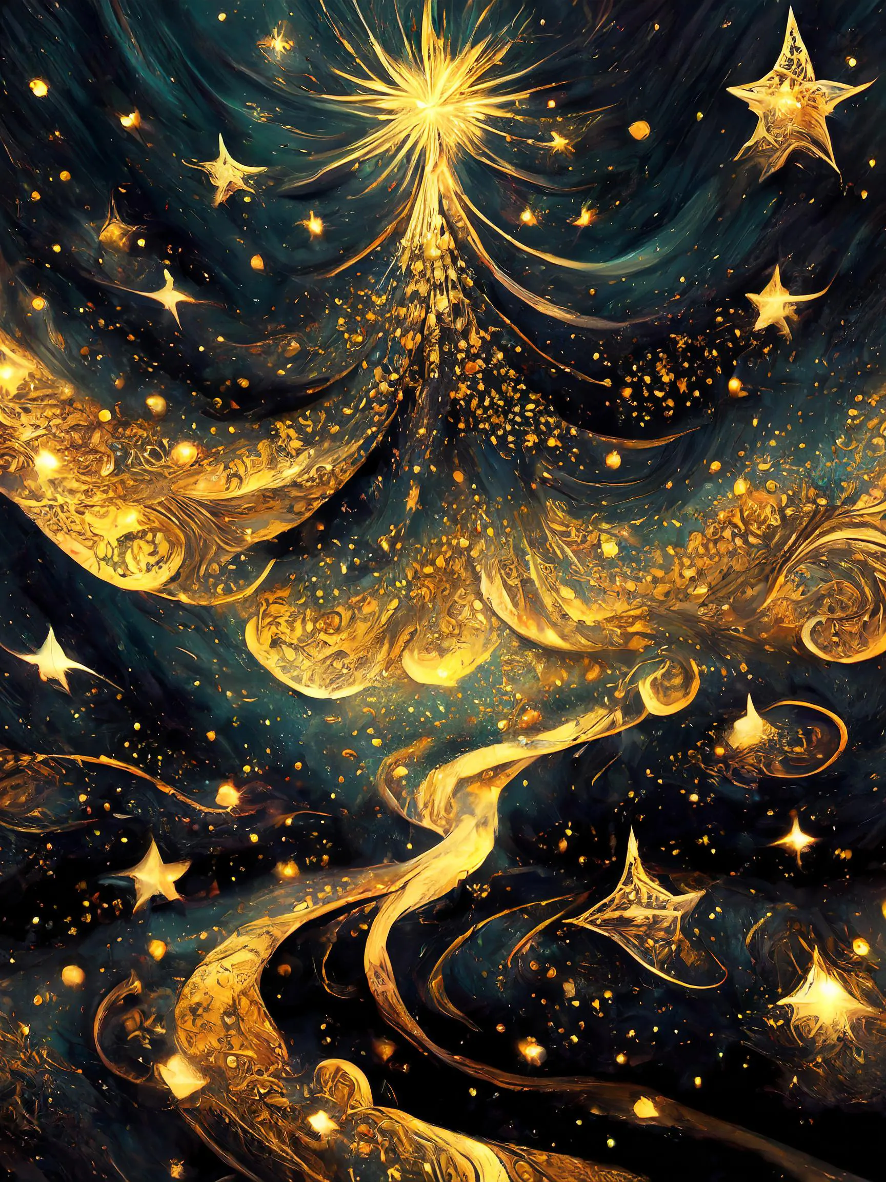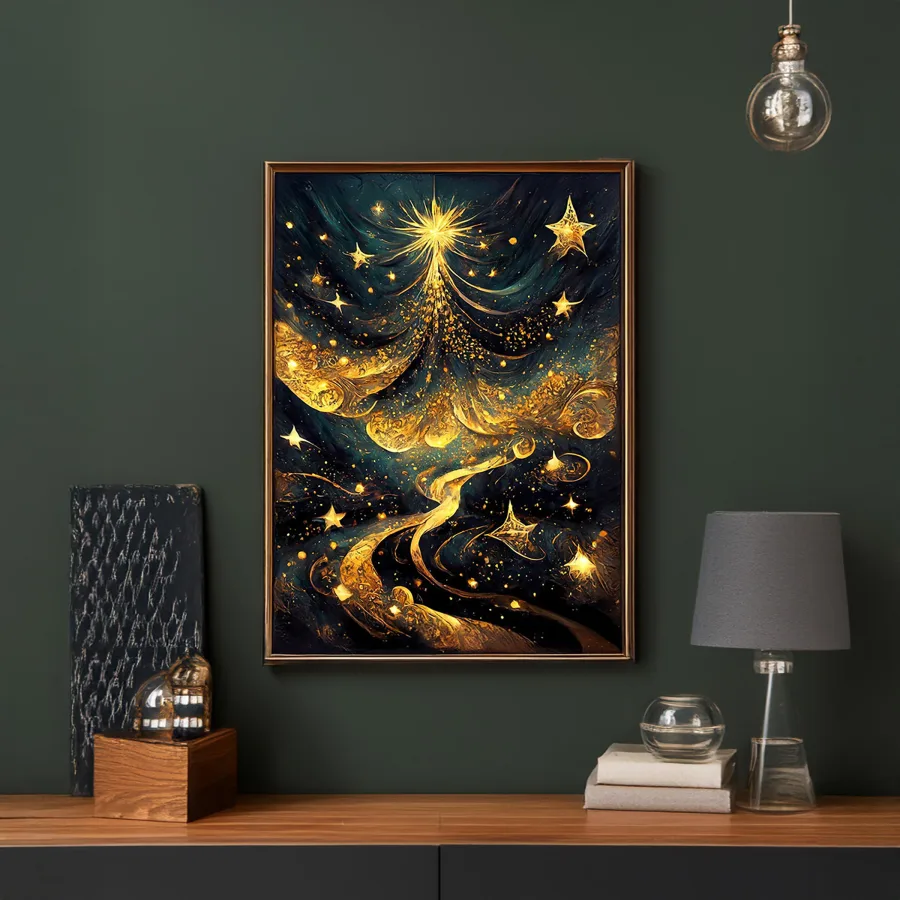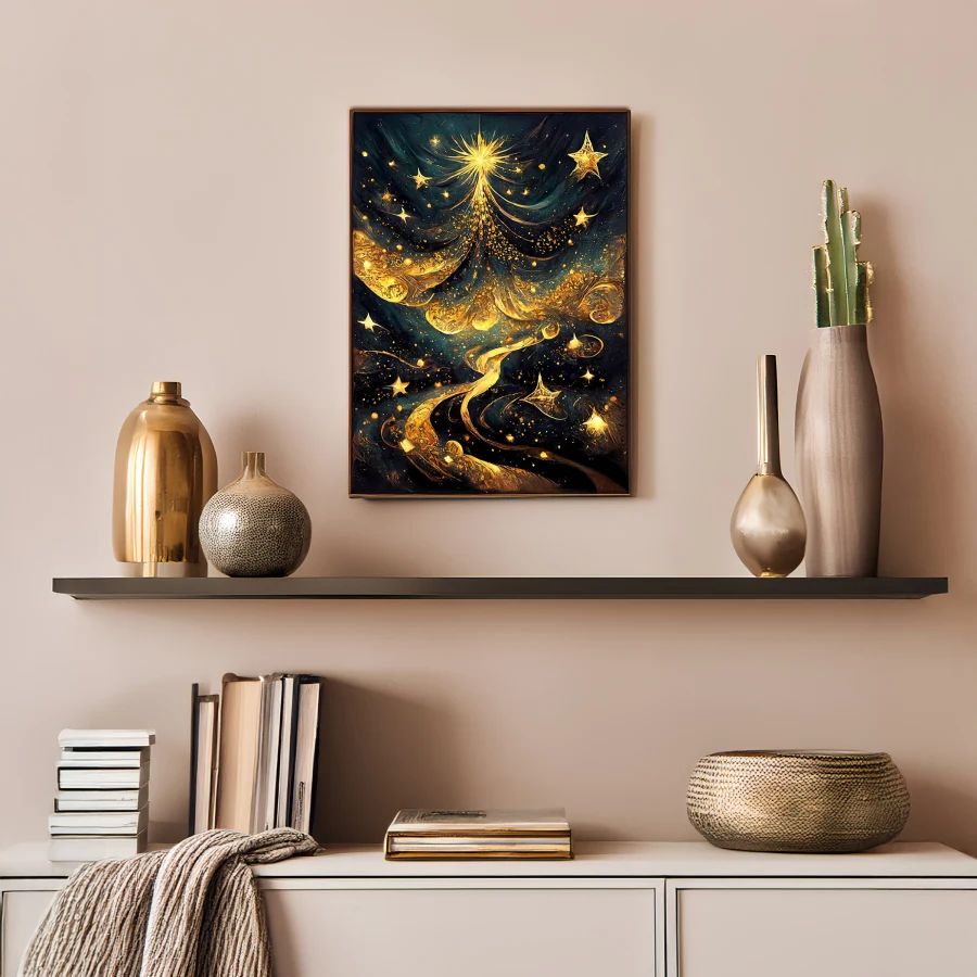 A mesmerizing explosion of liquid gold stardust erupts across the canvas, swirling and melting like Van Gogh had a fever dream in deep space. The ethereal fusion of teal cosmic waves and crystalline sparkles creates a spiritual dreamscape that's equal parts Final Fantasy cutscene and metaphysical gift shop aesthetic. Perfect for that friend who won't shut up about their crystal collection but honestly, this time they might be onto something because this art is actually transcendent AF.