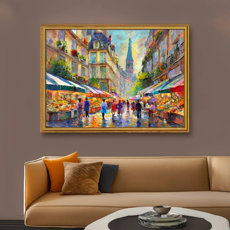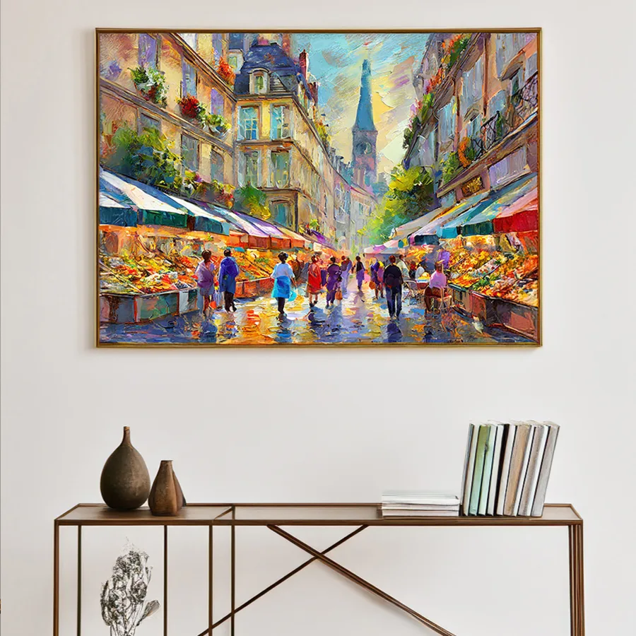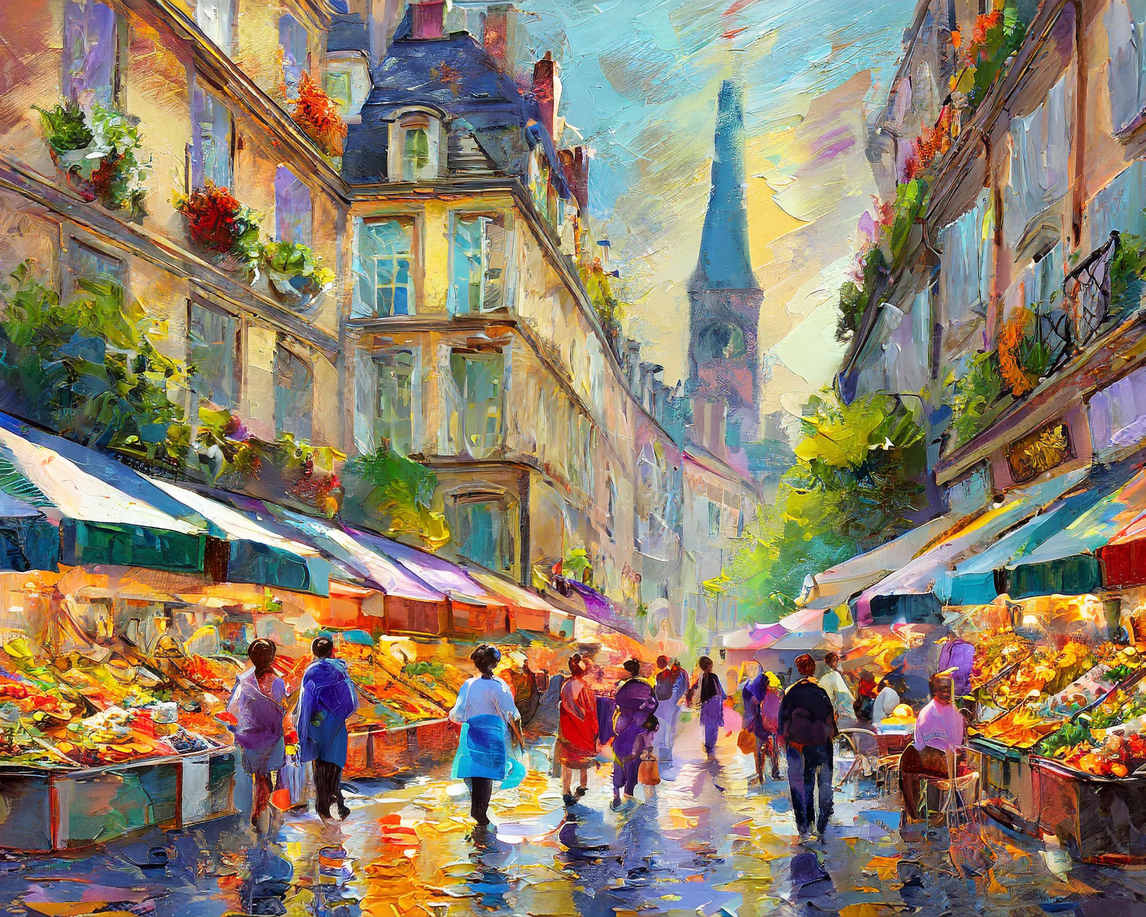 The kaleidoscope of rainbow-drenched market stalls practically explodes off the canvas, with every umbrella and awning competing to out-colorful the next in this rain-kissed Parisian street scene. The loose, impressionist brushstrokes create that perfect dreamy atmosphere where you can almost smell the fresh baguettes and hear the melodic chatter of vendors hawking their wares beneath the distant silhouette of the Eiffel Tower. Listen, if you're not already planning to hang this in your apartment while pretending you're the main character in your own French romantic comedy, I don't even know what to tell you.
