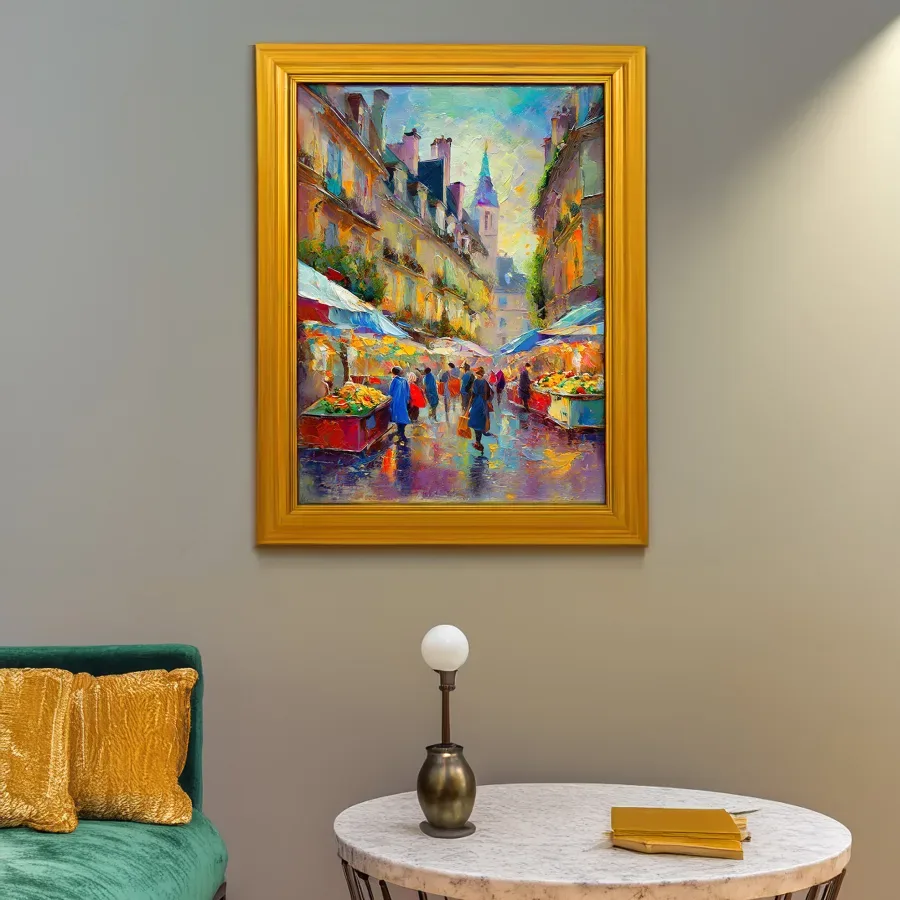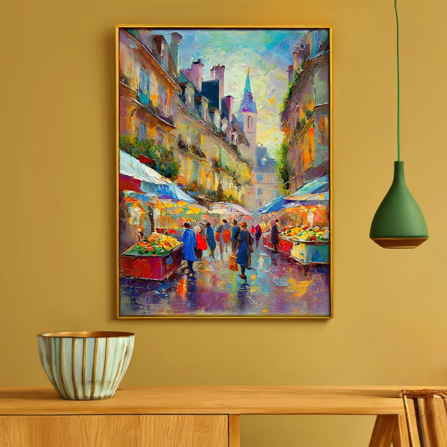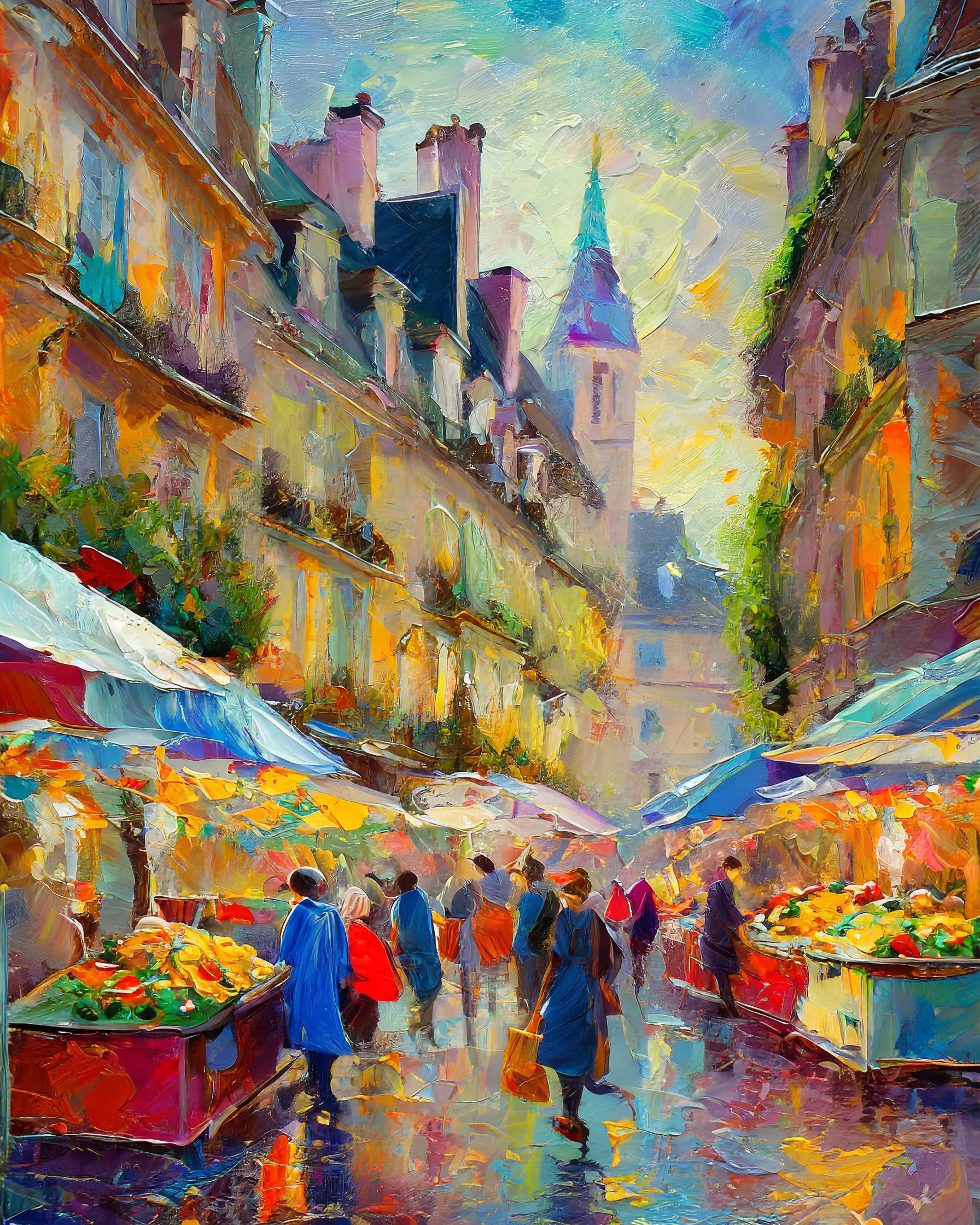 Umbrellas bob like tipsy jellyfish through a rain-soaked Parisian market, creating a kaleidoscope of reds and blues that practically dance off the canvas. The artist's bold palette knife work transforms an ordinary street scene into a modern impressionist fever dream, where produce stands blur into jewel-toned watercolor soup against rain-slicked cobblestones. Let's be honest - this is exactly the kind of painting that'll make your dinner guests pretend they know something about art while they're secretly wondering if those blurry shapes are actually bananas or just very yellow pigeons.