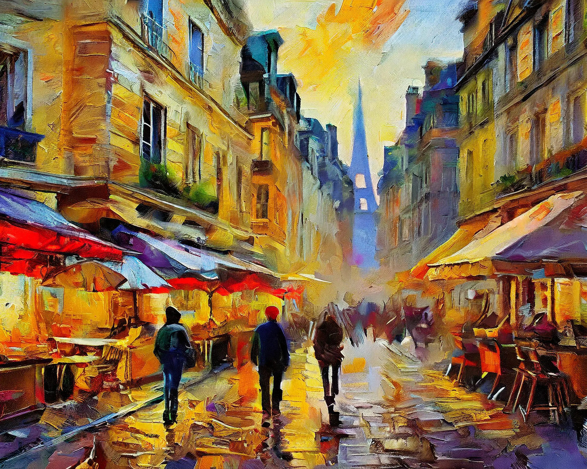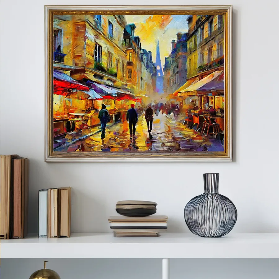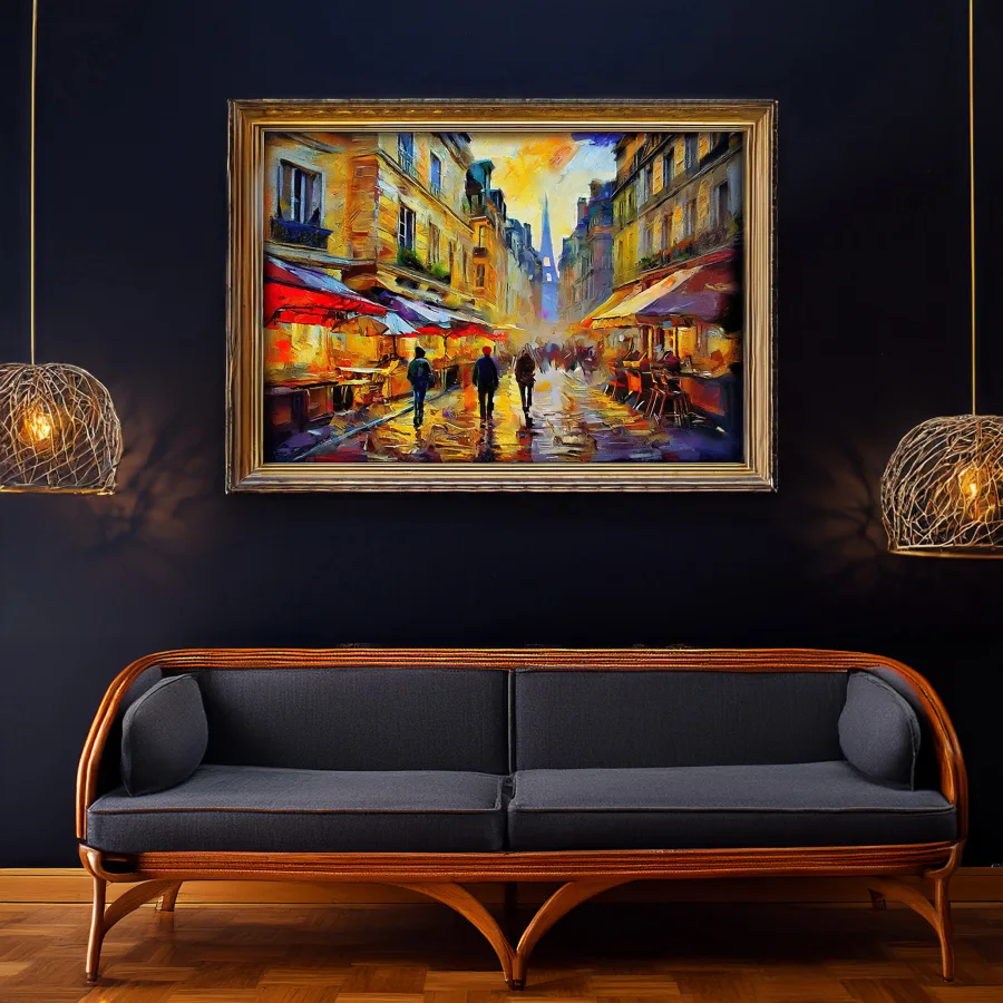 Umbrellas bloom like neon mushrooms across the glistening cobblestones of this rain-soaked Parisian street market, their reflections creating a kaleidoscope of electric colors in every puddle. The piece channels pure midnight-in-Paris energy with its moody impressionist strokes and that deeply romantic way the café lights blur into golden halos through the rain. Listen, if this painting doesn't make you want to immediately book a flight to France and dramatically twirl an umbrella while pretending you're the main character in your own French art film, I don't know what will.