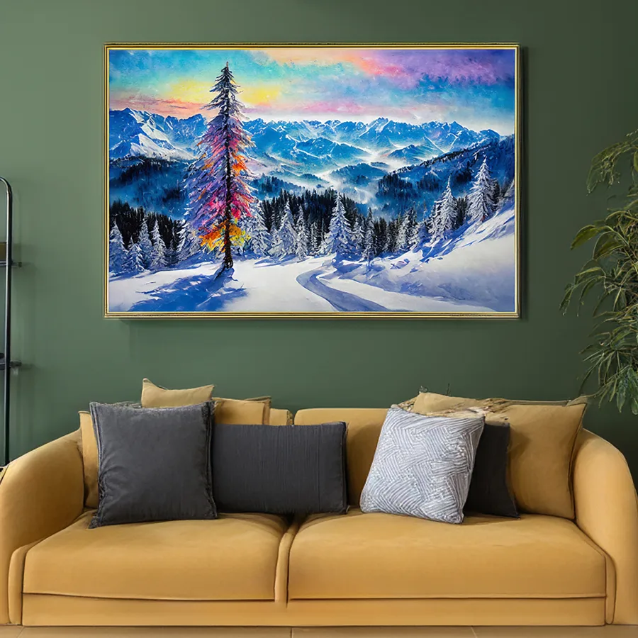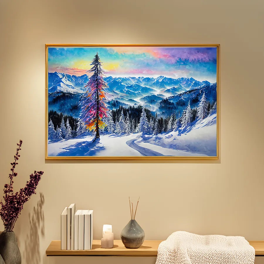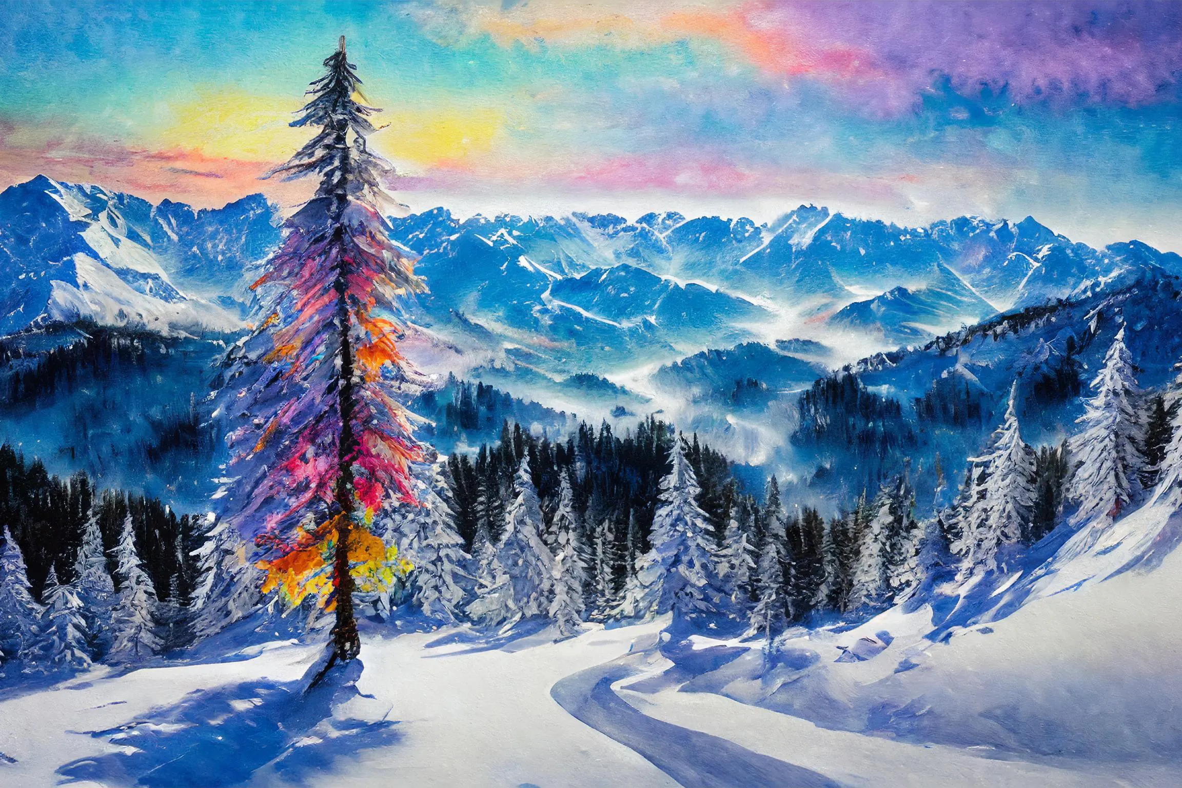 A majestic pine tree blazes with impossible rainbow hues against pristine snow-covered mountains, like nature decided to throw an impromptu light show in the dead of winter. The dreamlike scene merges Bob Ross's peaceful mountain aesthetic with Lisa Frank's unapologetically psychedelic color palette, creating a cottagecore fever dream that somehow works perfectly. Listen, if you're not immediately imagining yourself wrapped in a cozy blanket, sipping hot cocoa, and staring at this while questioning reality, we can't be friends.