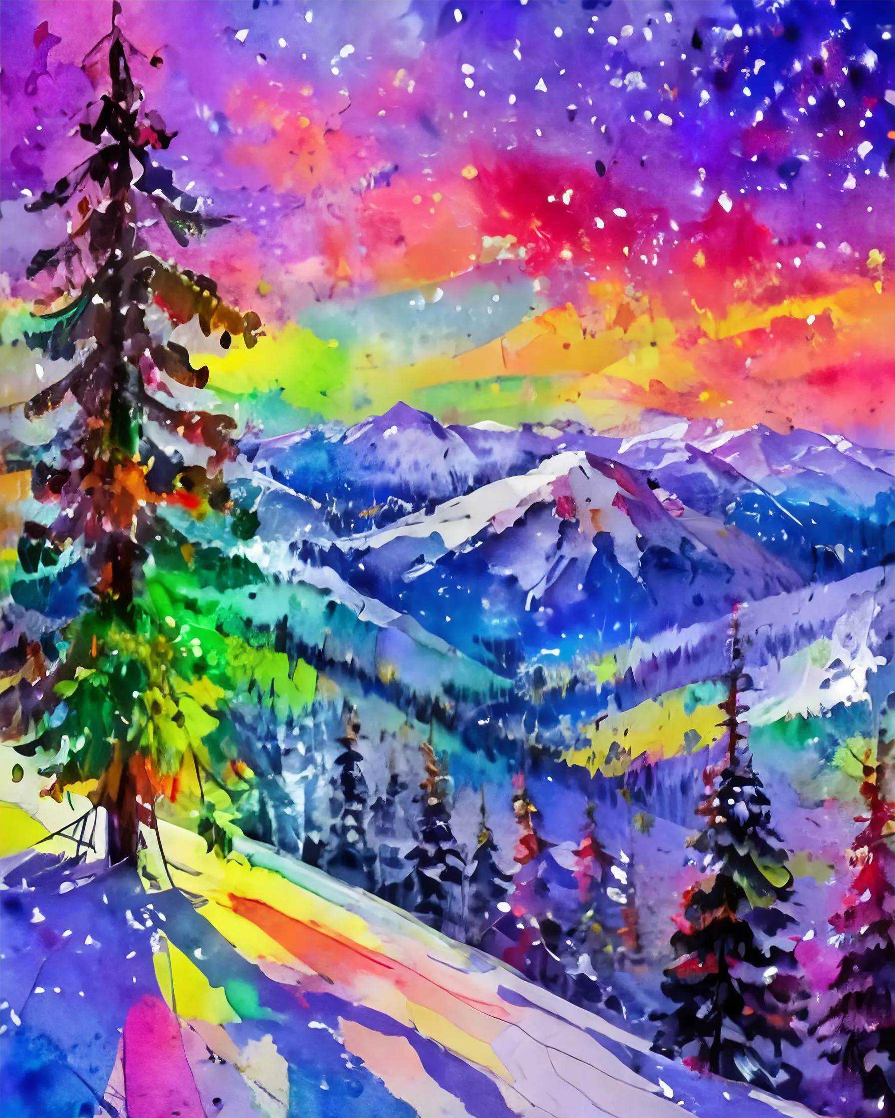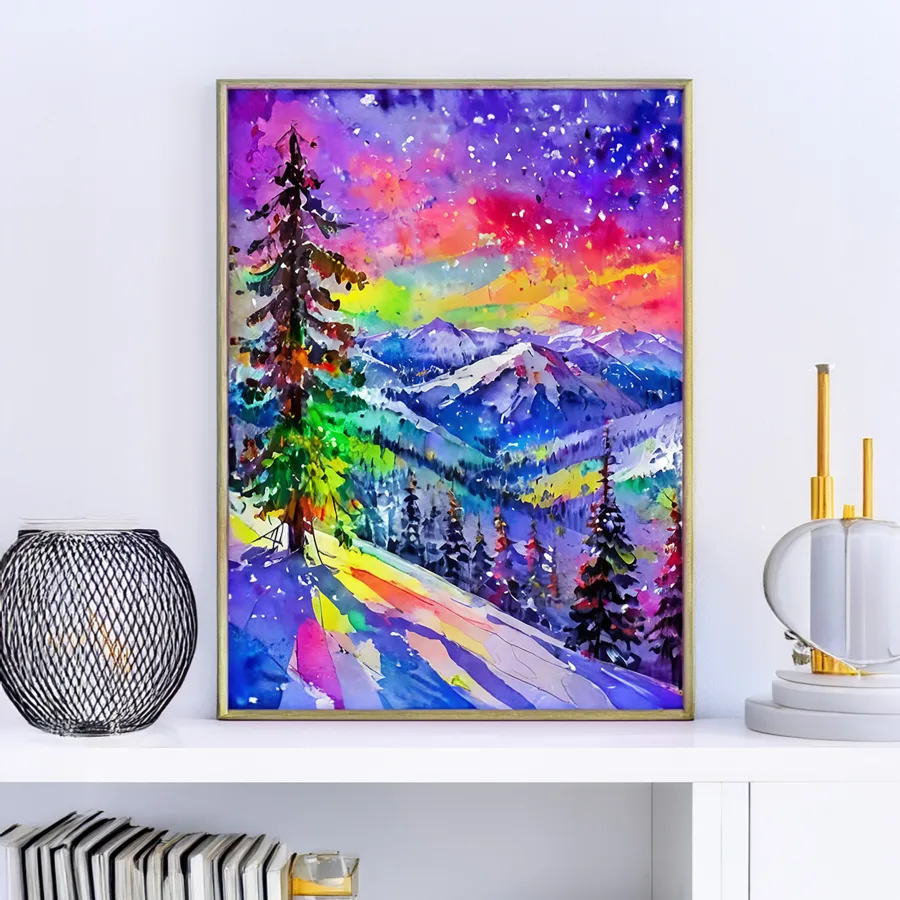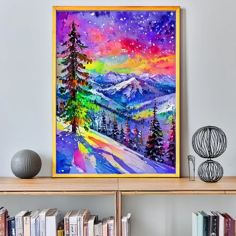 Swirling ribbons of neon color dance across snow-capped peaks, creating an otherworldly landscape that would make Lisa Frank drop her unicorn in shock. This psychedelic winter wonderland masterfully blends traditional mountain scenery with an acid-trip color palette, somehow maintaining a delicate balance between peaceful meditation vibes and total chromatic chaos. If you've ever wanted your cozy cabin decor to scream "Bob Ross went to Burning Man and came back forever changed," this piece is definitely your jam.