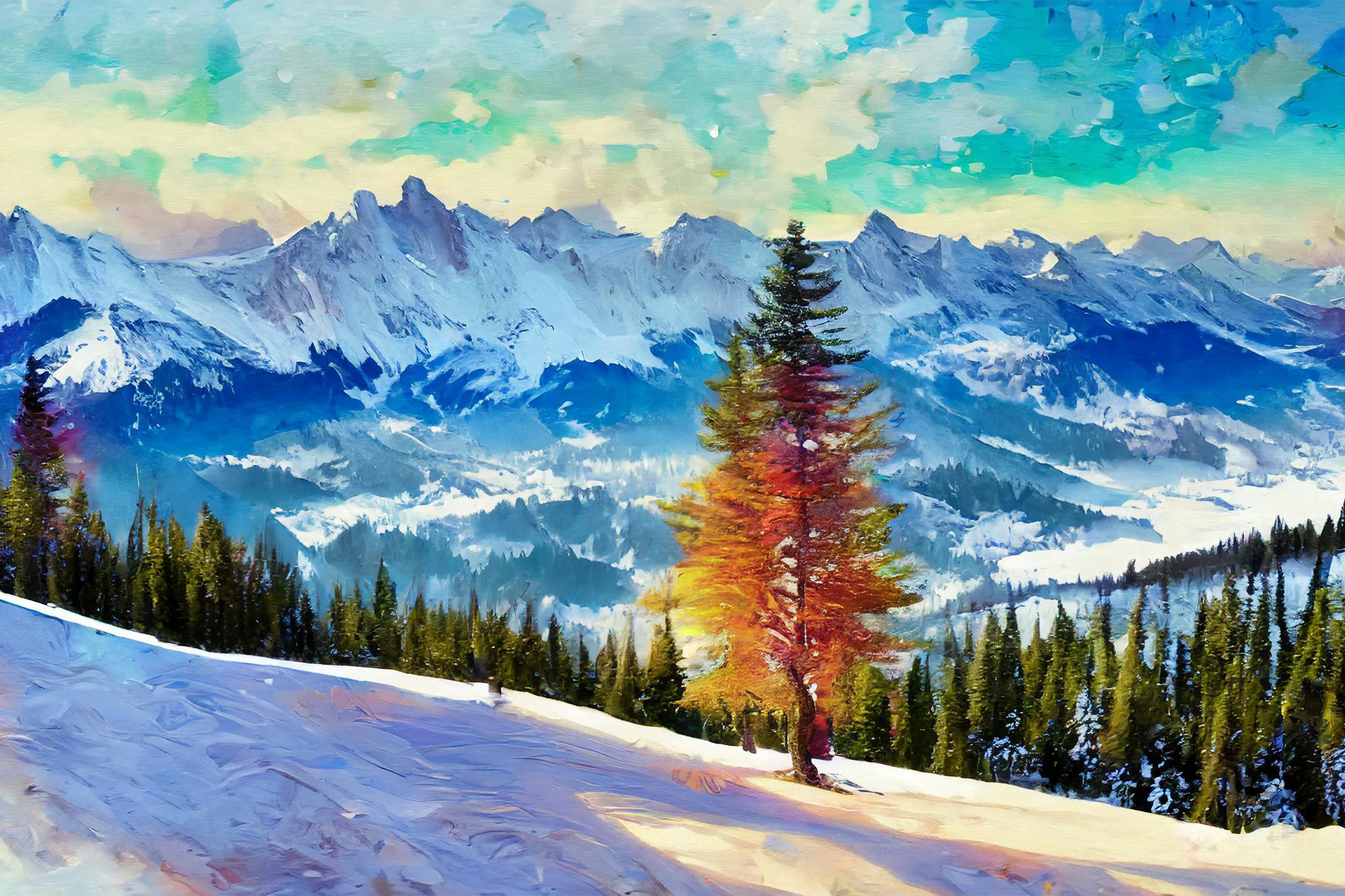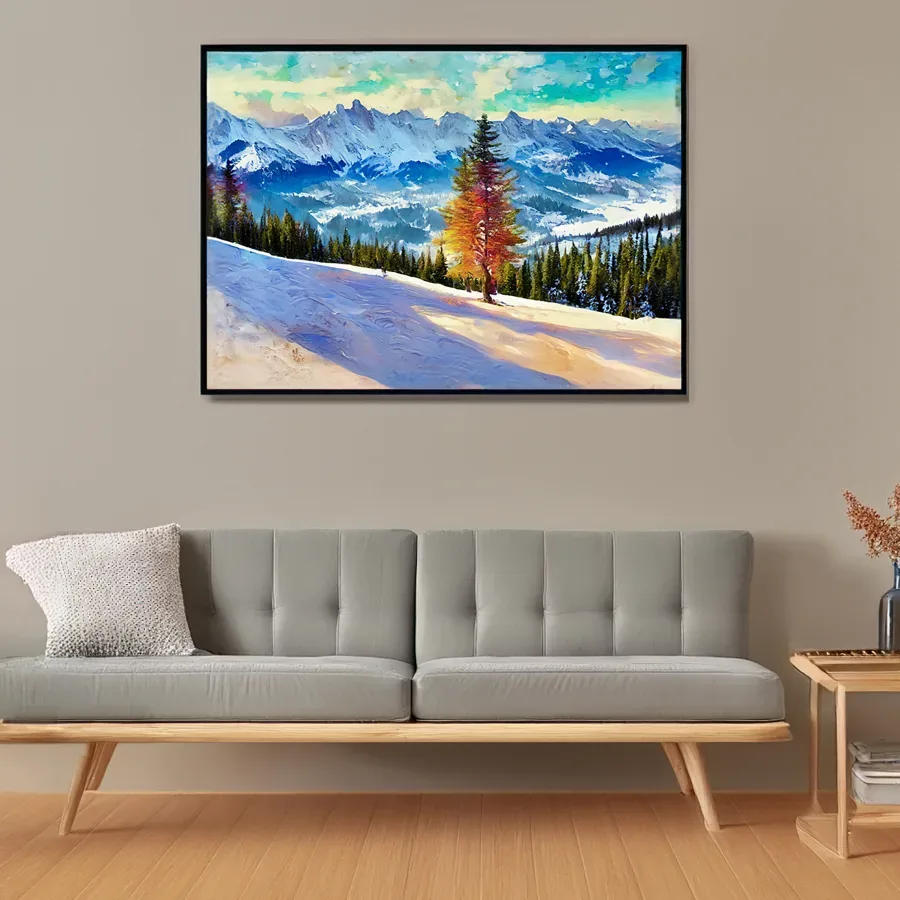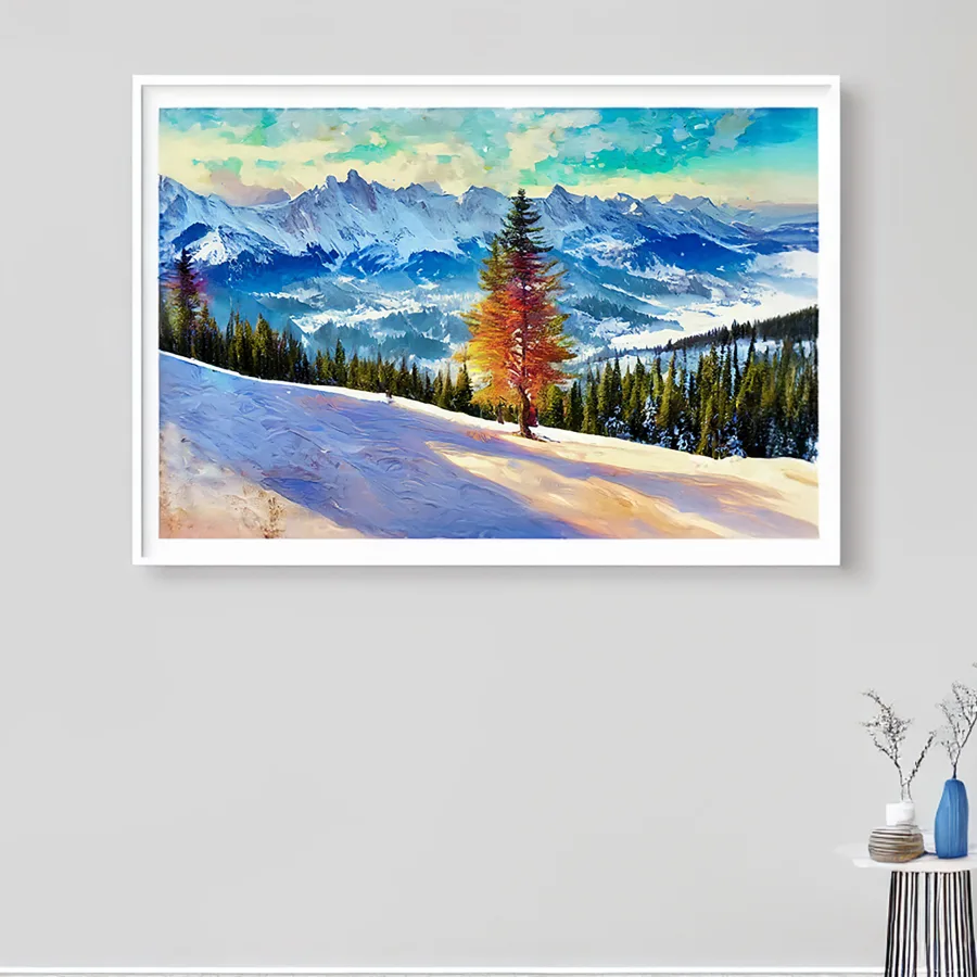 A solitary pine tree erupts in neon flames against a majestic snow-covered mountain range, creating an impossible but mesmerizing focal point that screams "nature meets digital apocalypse." The piece merges Bob Ross's peaceful alpine serenity with an electric synthwave color palette, resulting in a dreamy digital landscape that would make both wilderness painters and cyberpunk artists weep. Look, if you're trying to make your mountain cabin look like it belongs in a retro-futuristic ski resort from an alternate dimension, this is absolutely the vibe you need.