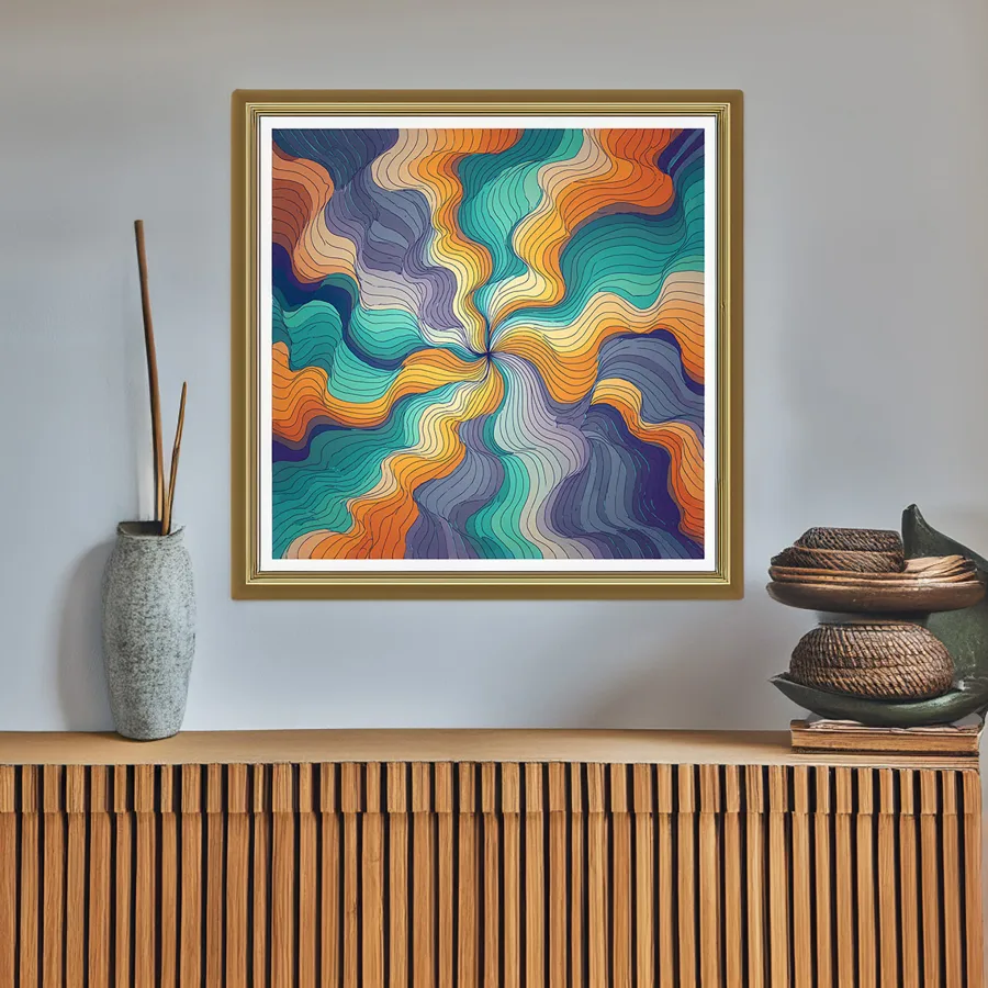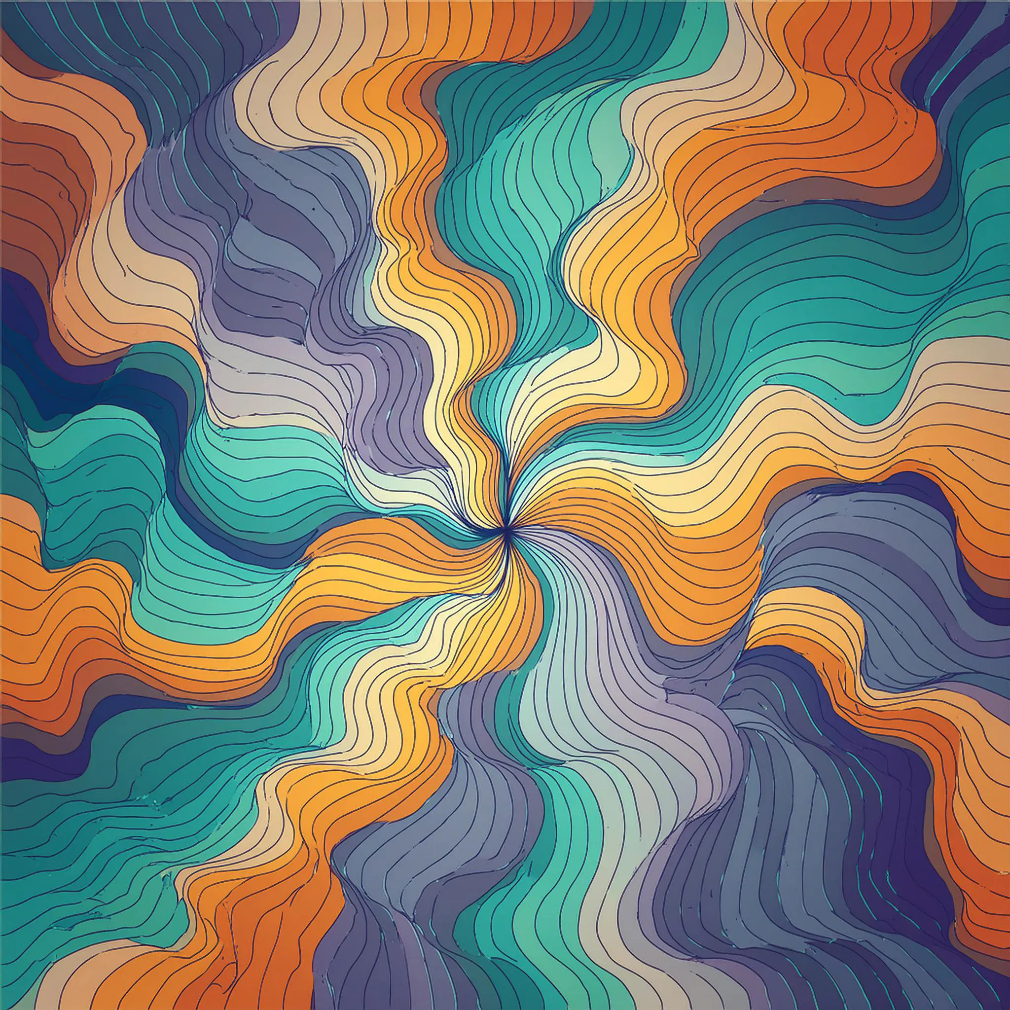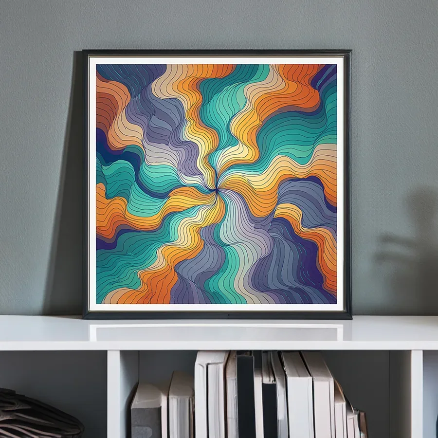 Concentric waves of teal, orange and purple spiral infinitely inward like you're being sucked into the most aesthetically pleasing black hole ever created. The retro 70s color palette and perfectly symmetrical line work merge to create that classic psychedelic poster vibe your hippie aunt definitely had in her meditation room. If you stare at this too long, you'll either achieve enlightenment or convince yourself you can taste colors - either way, totally worth it.