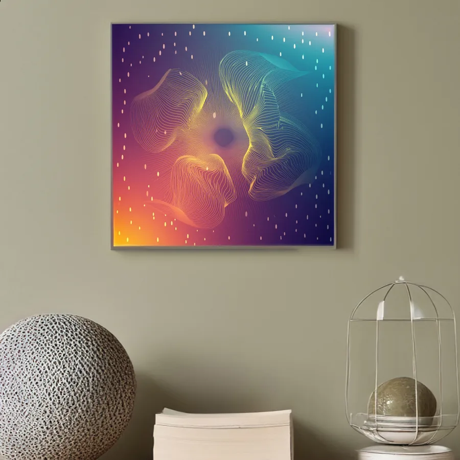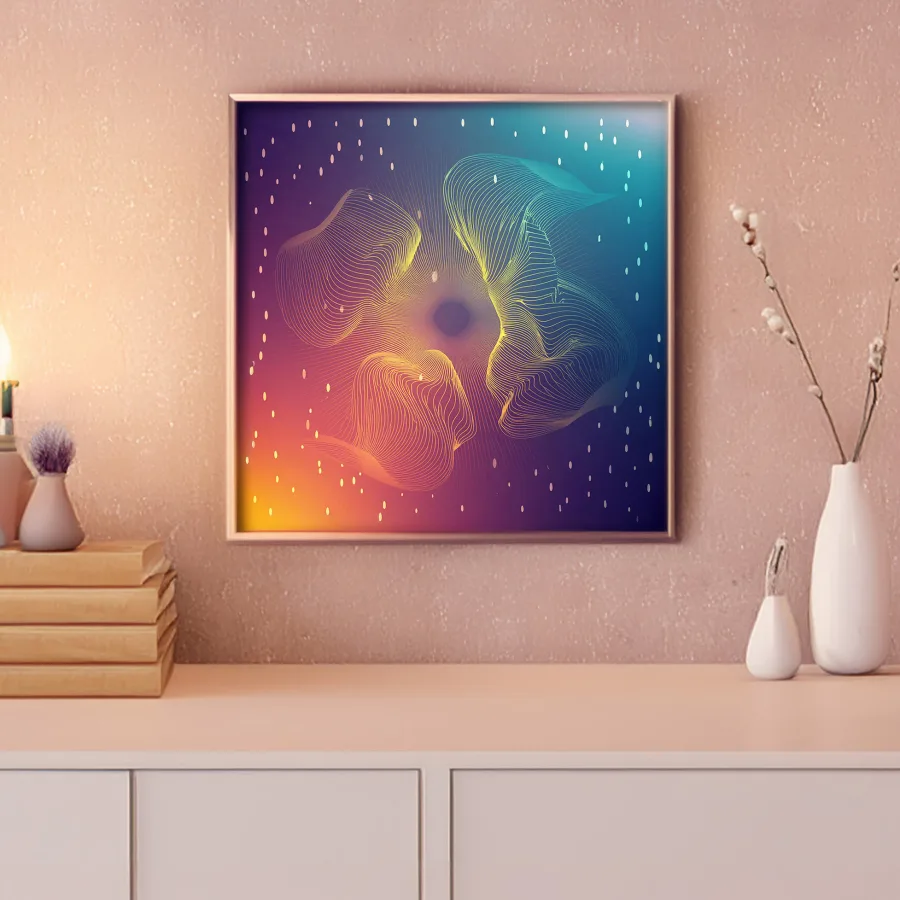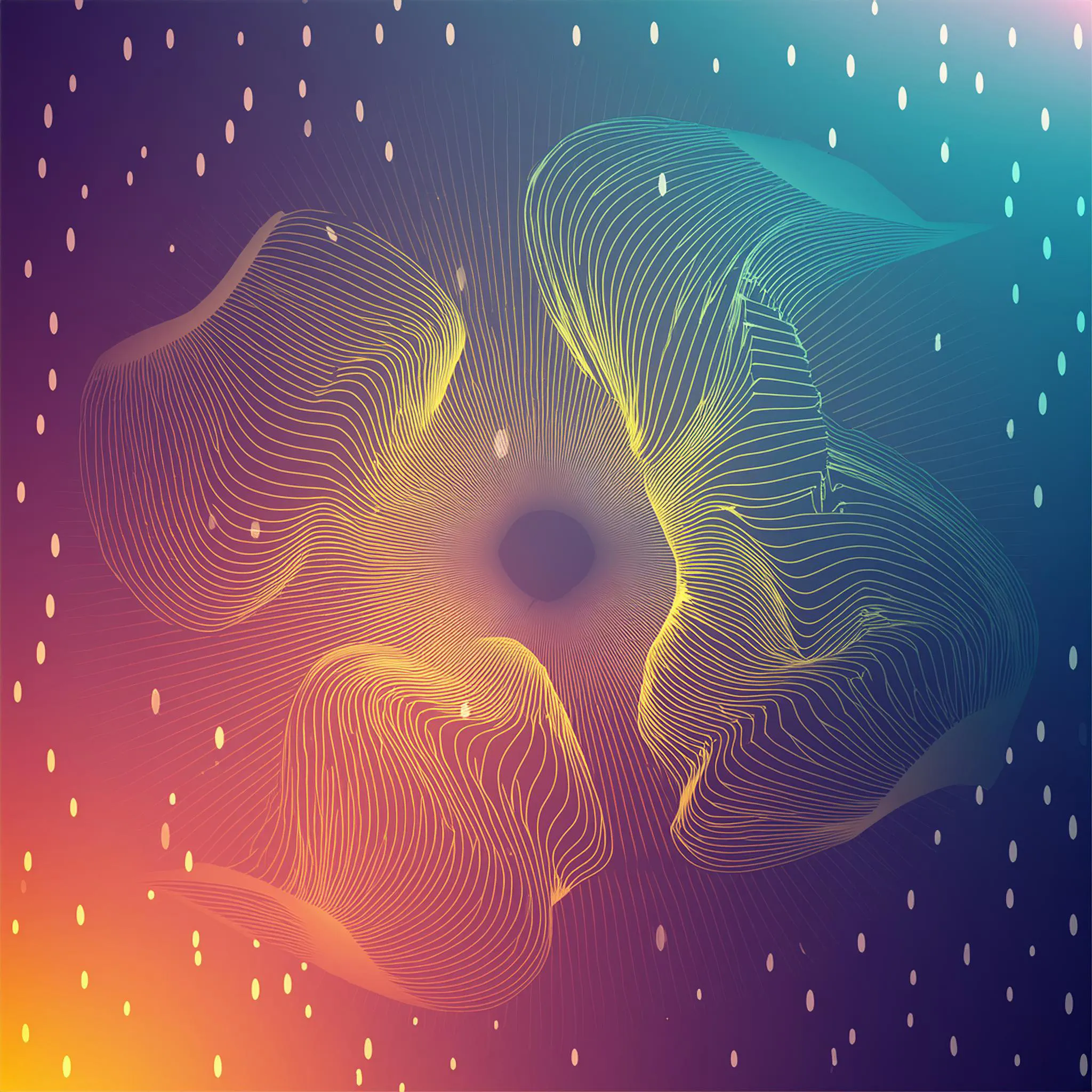 Hypnotic ribbons of light dance and ripple across the canvas like some kind of digital aurora borealis having an existential crisis. The piece merges sacred geometry's mathematical precision with neural network unpredictability, creating an aesthetic that sits somewhere between ancient temple wisdom and that time your GPU started melting. Look, I'm not saying this artwork will solve all your problems, but staring at it while sprawled on your meditation cushion at 2 AM might just reveal the secrets of the universe - or at least convince you that you've found them.