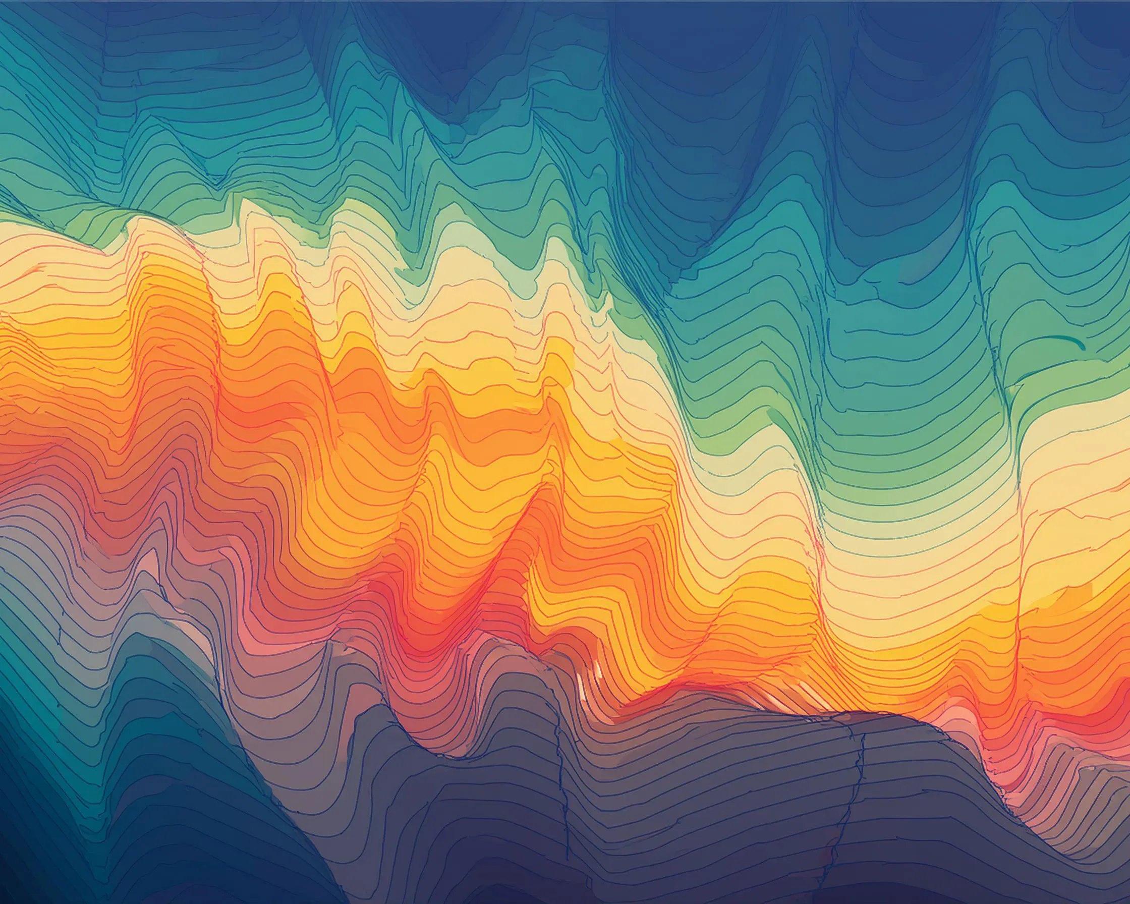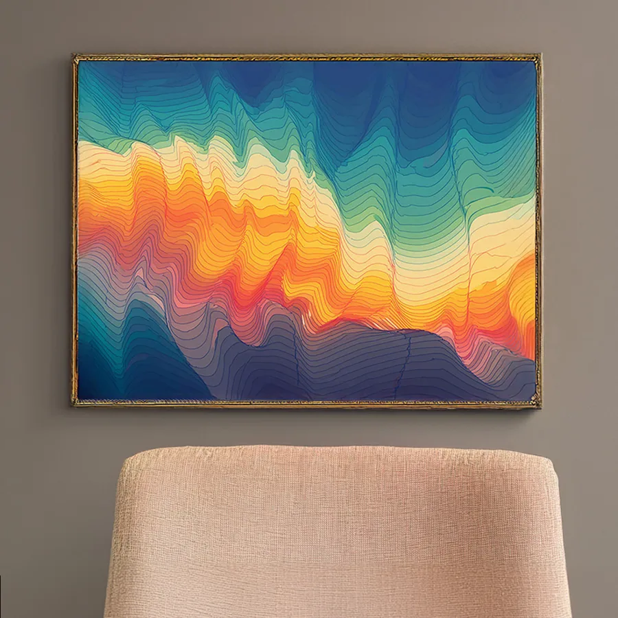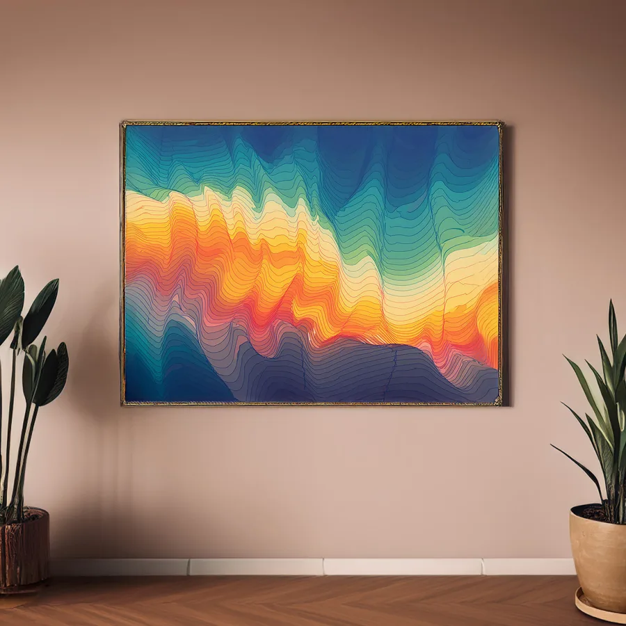 Undulating waves of color cascade across the canvas like a digital topographic map having an existential crisis in a sunset dimension. The mathematical precision of each gradient ridge creates a mesmerizing dance between data visualization and pure aesthetic bliss, turning cold calculations into a warm embrace of algorithmic art. Perfect for that corner of your tech office where you pretend to be deep in thought about disrupting paradigms, but you're actually just zoning out to these hypnotic waves while your code compiles.