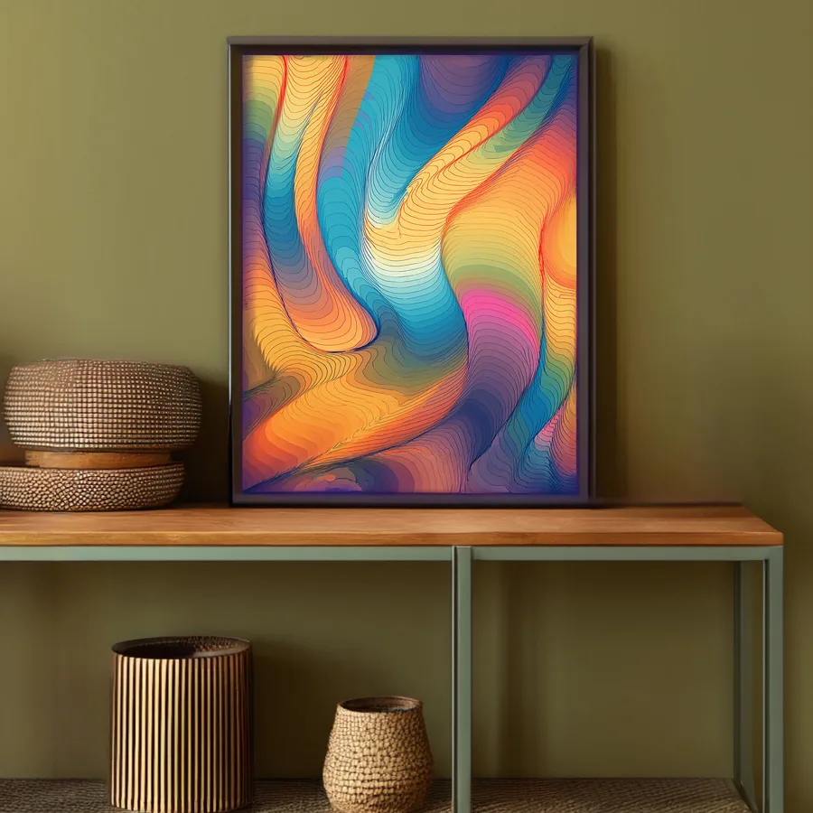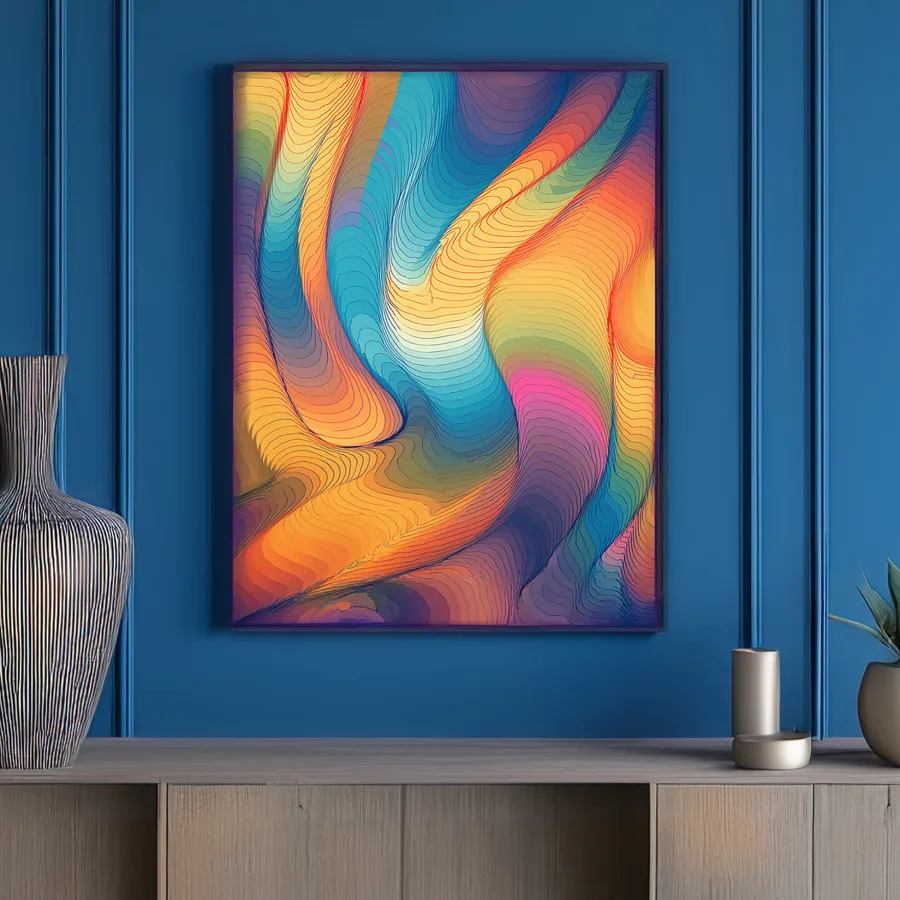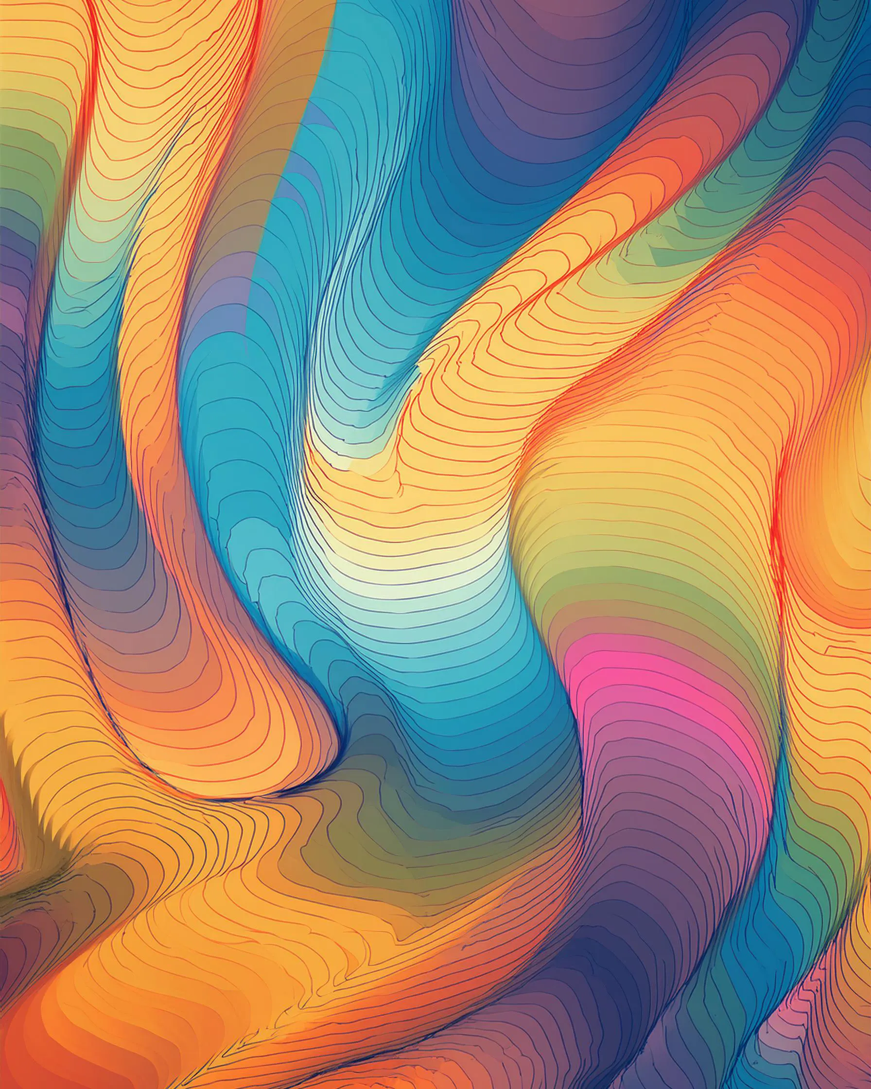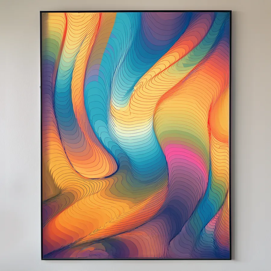 Undulating waves of impossibly saturated rainbow hues ripple across the canvas like a topographic acid trip of the digital age. The mathematically precise contour lines create a hypnotic terrain map that somehow manages to be both analytically satisfying and psychedelically mind-bending at the same time. Listen, if your startup office walls aren't already covered in this kind of data-meets-DMT aesthetic, are you even really disrupting anything?