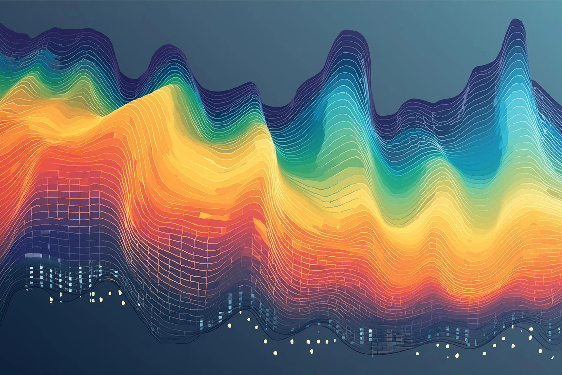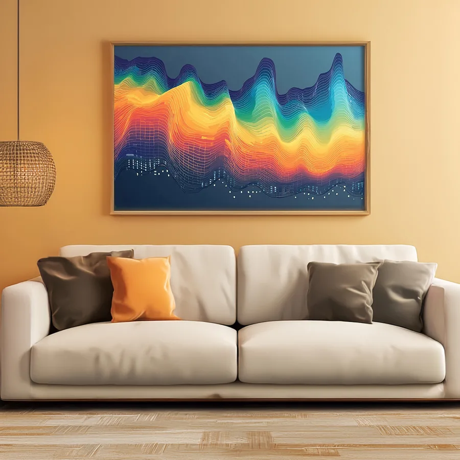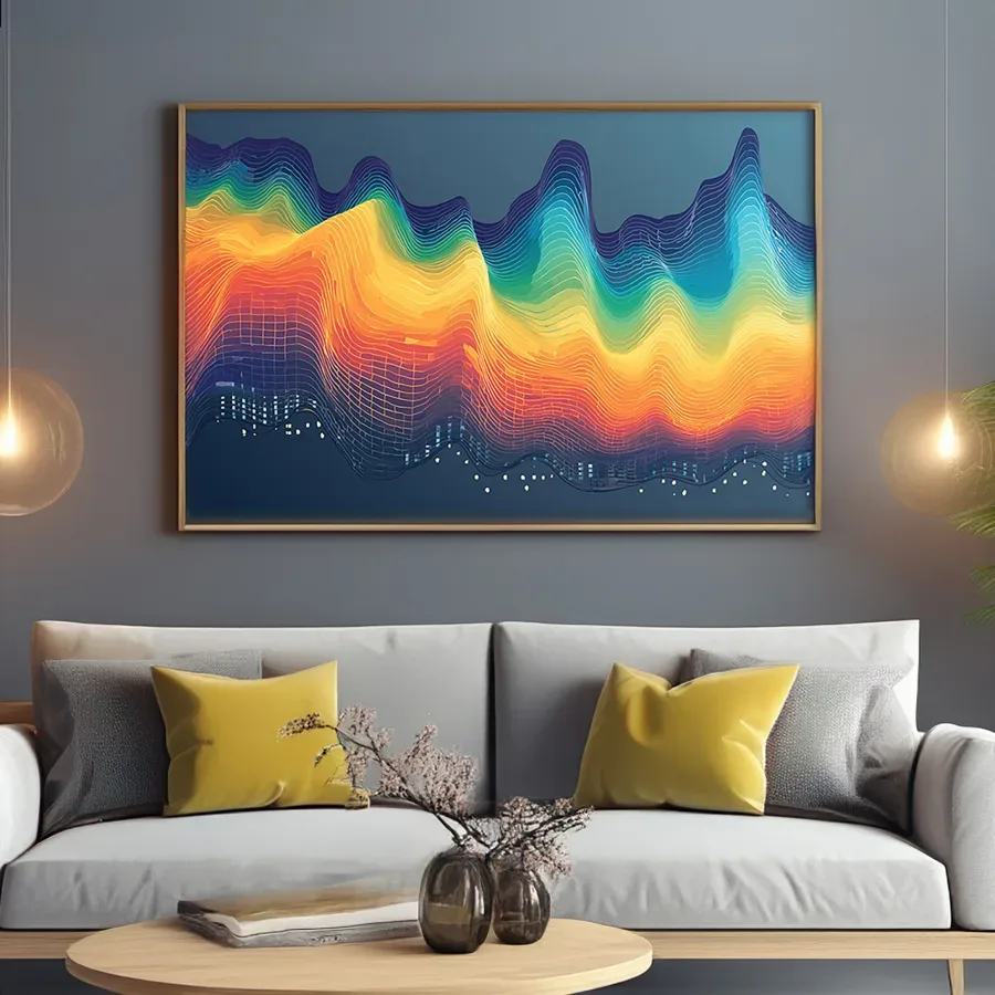 Undulating waves of neon data crash and flow across the canvas like a digital aurora borealis having an existential crisis. The piece merges synthwave aesthetics with data visualization principles, creating a hypnotic gradient that would make both a Silicon Valley algorithm and a vaporwave DJ weep with joy. Listen, if you don't immediately want this as your Zoom background to convince your coworkers you're living in some kind of cyberpunk utopia, I honestly don't know what to tell you.