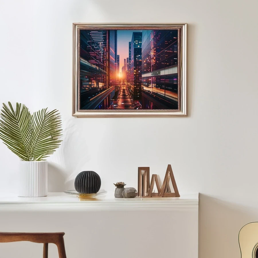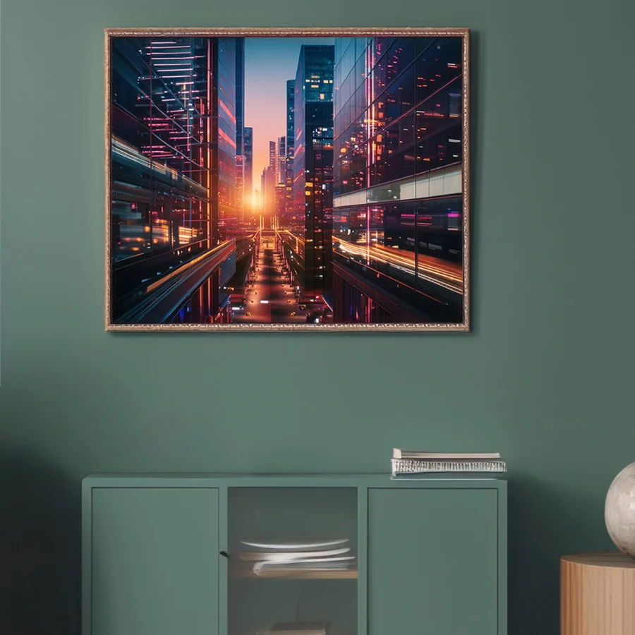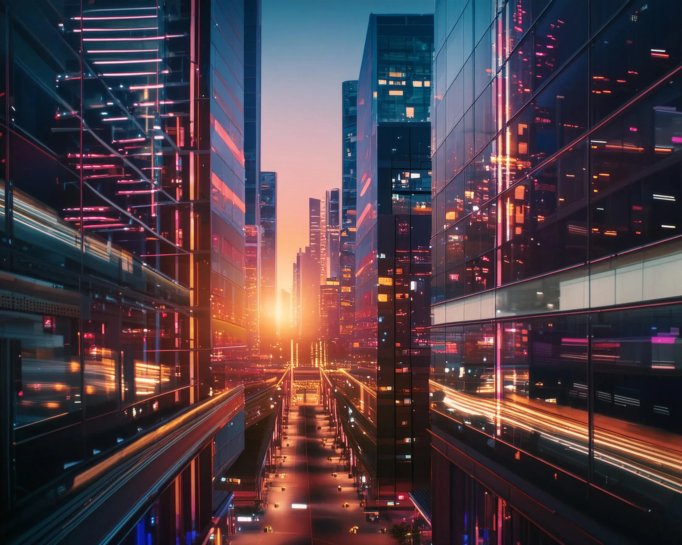 Molten orange sunlight bleeds between glossy skyscrapers, painting the rain-slicked streets in a surreal display of nature meets neon dystopia. The composition masterfully blends cyberpunk aesthetics with real urban photography, creating a synthwave fever dream where every reflection and light trail feels like a glimpse into tomorrow's megalopolis. Listen, if you don't immediately make this your ultrawide monitor background and pretend you're living in some tech noir future where you're definitely a mysterious hacker, we can't be friends anymore.