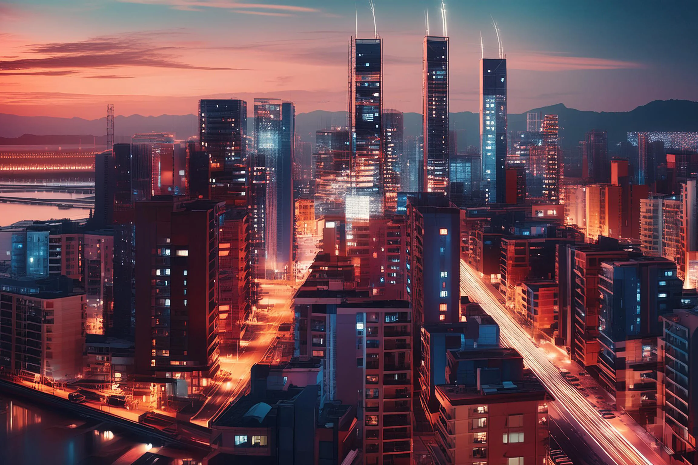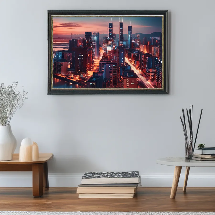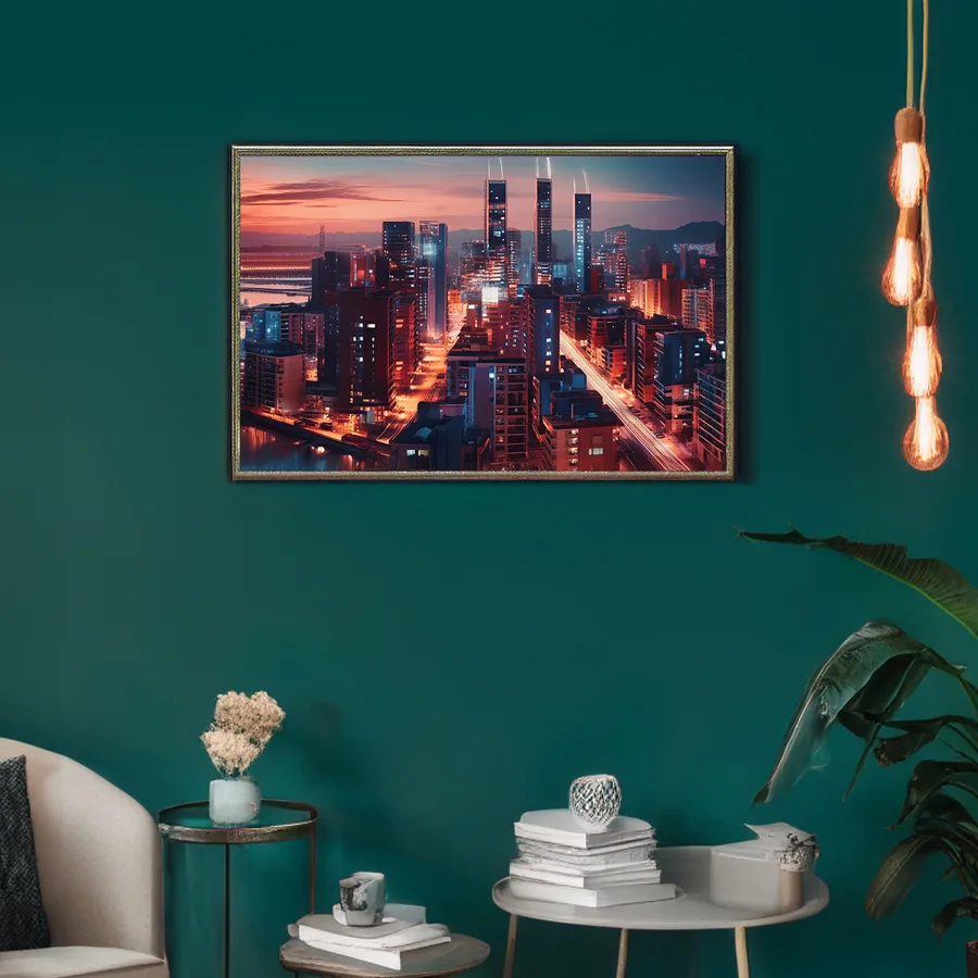 Massive holographic advertisements pierce through a golden smog-filled sky, their neon reflections creating a mesmerizing dance of pink and cyan across rain-slicked streets of this Asian megacity. The composition masterfully blends dystopian urban decay with a minimalist tech-noir aesthetic, channeling serious Blade Runner energy while maintaining its own unique identity. Look, if you're not immediately making this your phone wallpaper and pretending you're a brooding cyberpunk detective while scrolling through social media, we can't be friends.