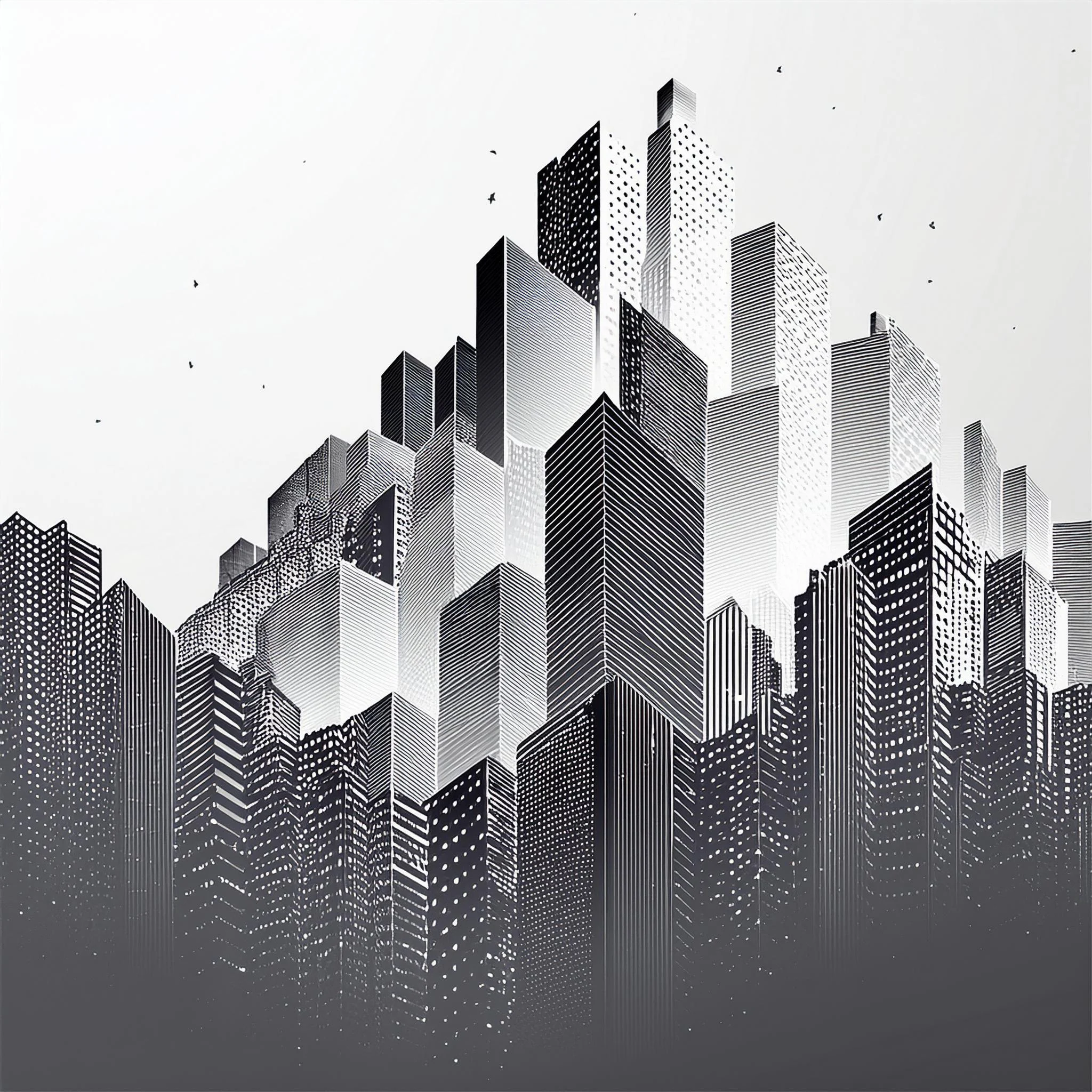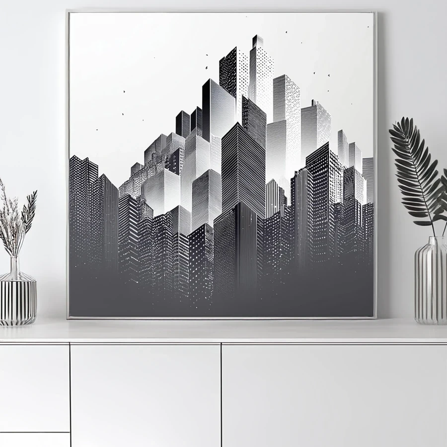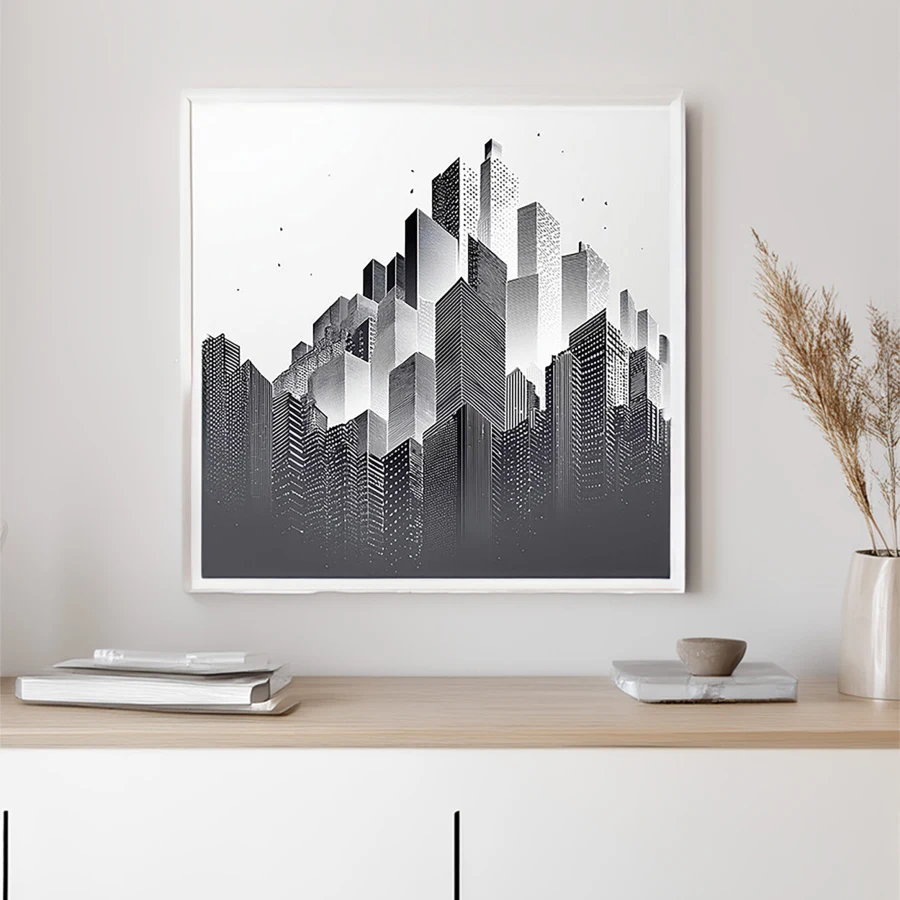 Towering skyscrapers dissolve into digital static, their once-solid forms melting like ice cream in August against a pitch-black sky. The piece marries architectural precision with glitch aesthetics, creating a dystopian dance of clean geometric patterns that would make Mies van der Rohe have an existential crisis. Perfect for that one pretentious wall in your office where you pretend to understand brutalism while secretly just vibing with its moody energy.