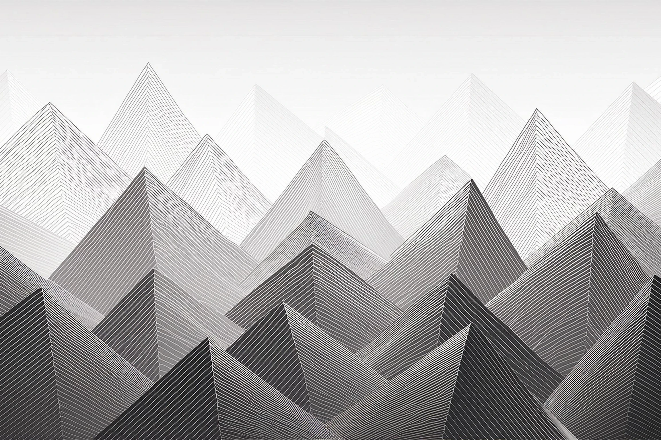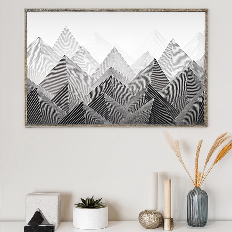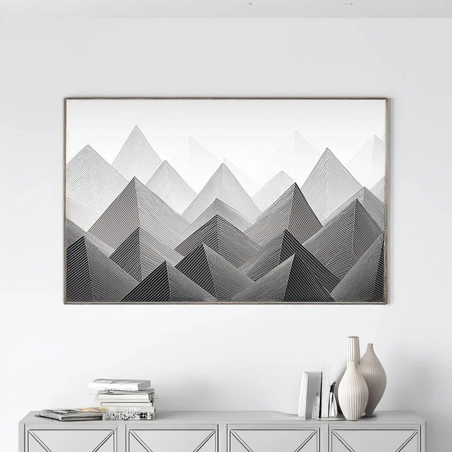 Bold black lines slice across pristine white space to form jagged mountain peaks that command attention like a geometric meditation. The stark monochromatic design strips nature down to its purest mathematical essence, creating a zen-like rhythm that would make both architects and mystics nod in quiet approval. Let's be honest - this is totally the kind of piece you'd hang in your apartment to convince visitors you're a sophisticated minimalist who definitely has their life together.