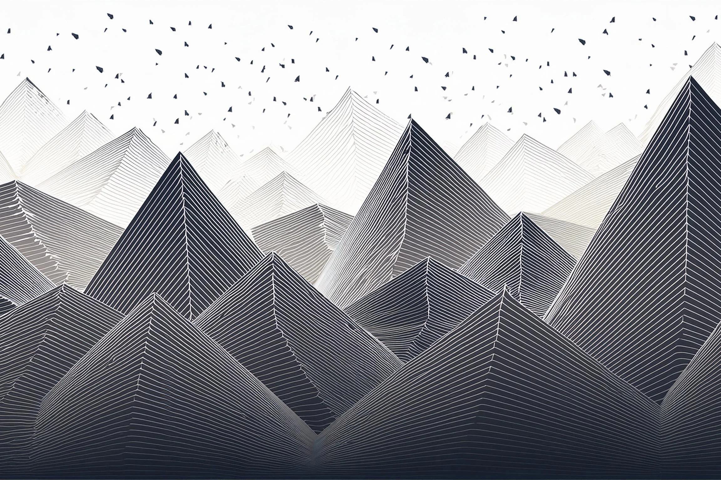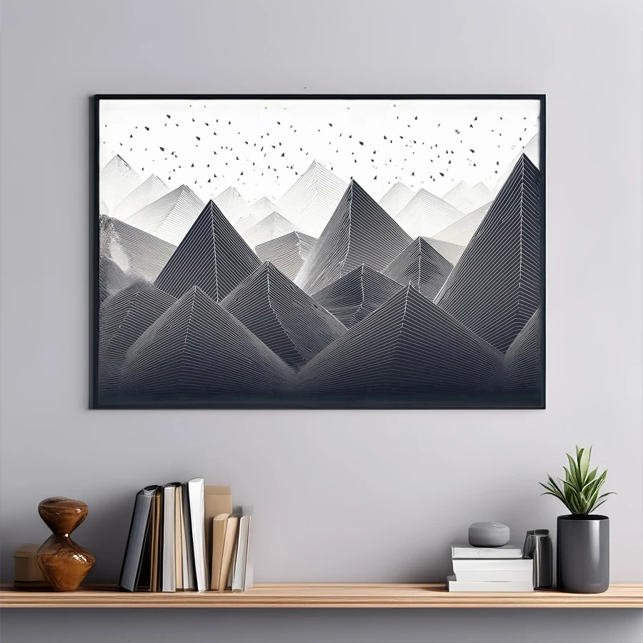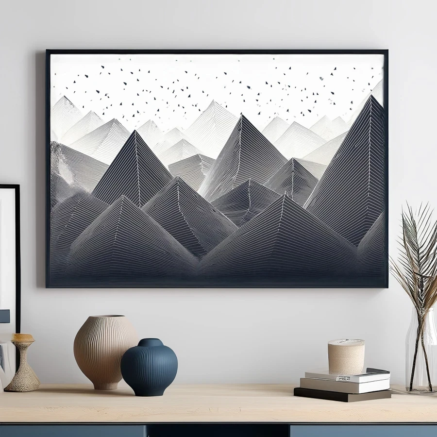 A mesmerizing series of fluid black lines dance across pristine white space, transforming into the essence of a mountain range with birds soaring overhead. The minimalist Scandinavian design brings that perfect balance of geometric precision and organic flow, creating a zen-like atmosphere that would make any architect's heart skip a beat. Look, if you're the type who gets unreasonably excited about perfectly aligned angles and clean aesthetics (guilty as charged), this piece is basically going to be your new obsession.