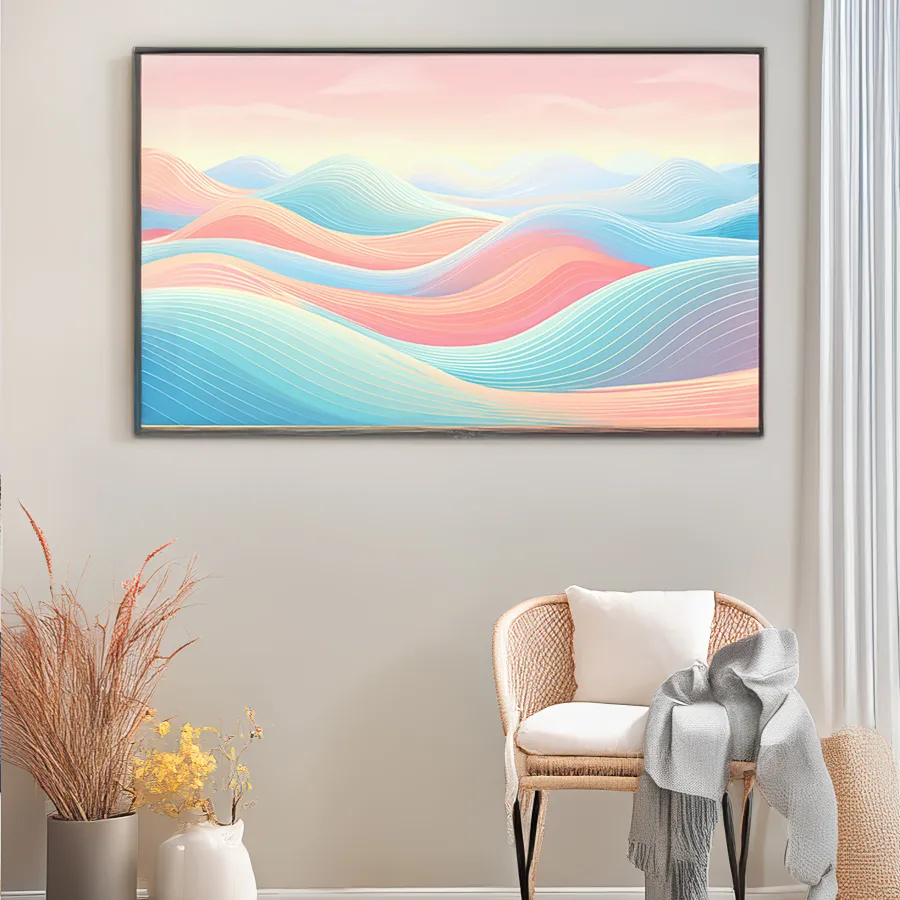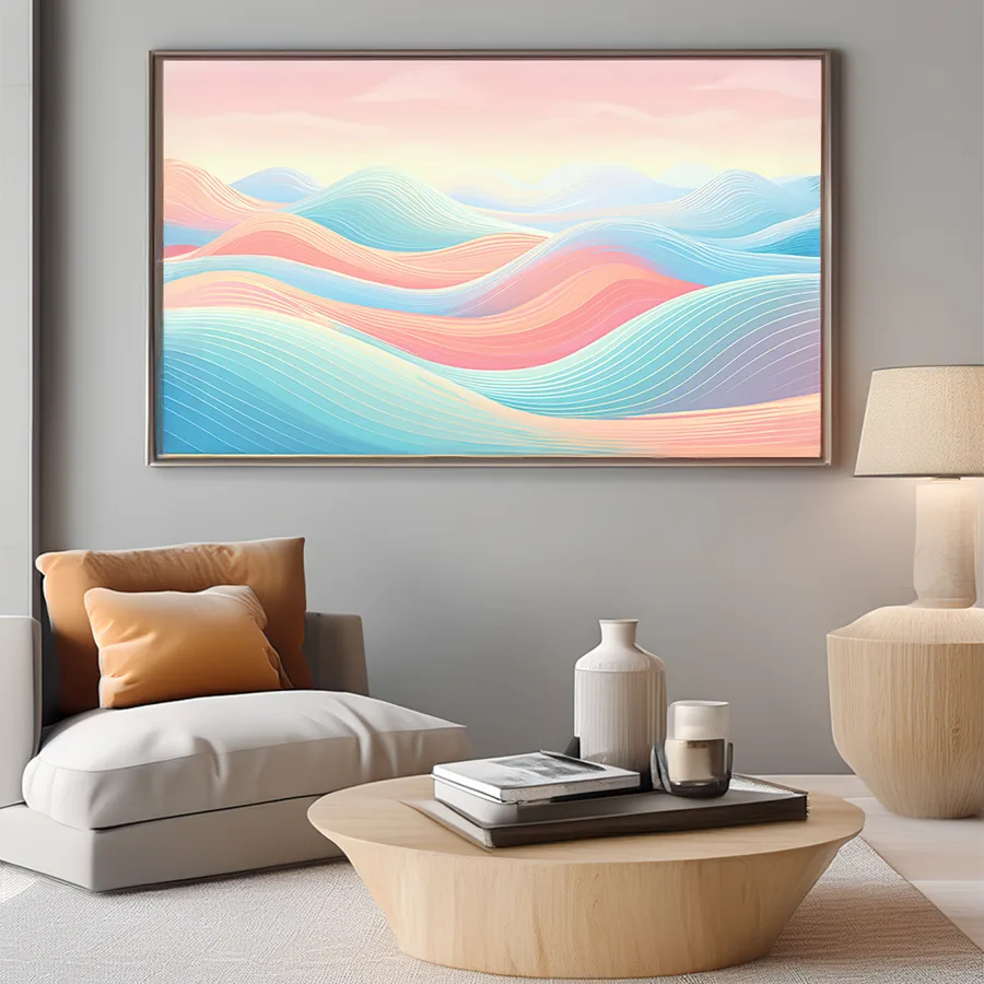 Undulating waves of cotton-candy pinks and dreamy lavenders float across the canvas like some kind of hypnotic screensaver from a parallel universe where everything is made of clouds. These minimalist curves channel serious vaporwave-meets-spa-waiting-room energy, with just enough abstract sophistication to make you question if you're looking at art or having a particularly aesthetic stroke. Perfect for that meditation corner you've been meaning to set up since 2019 but keep using as a dumping ground for Amazon packages instead.