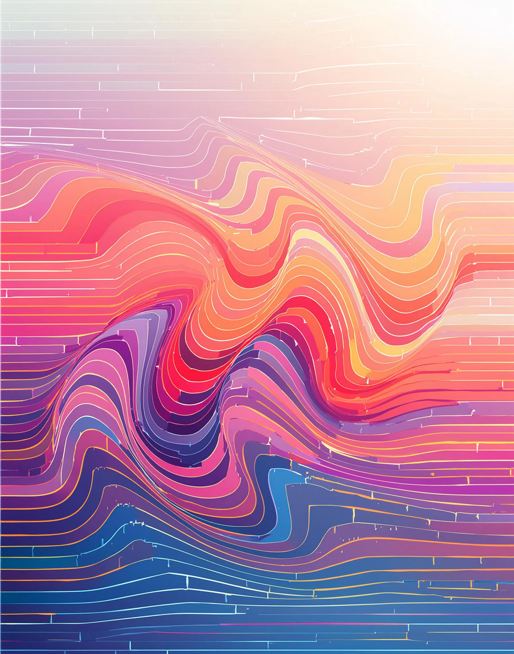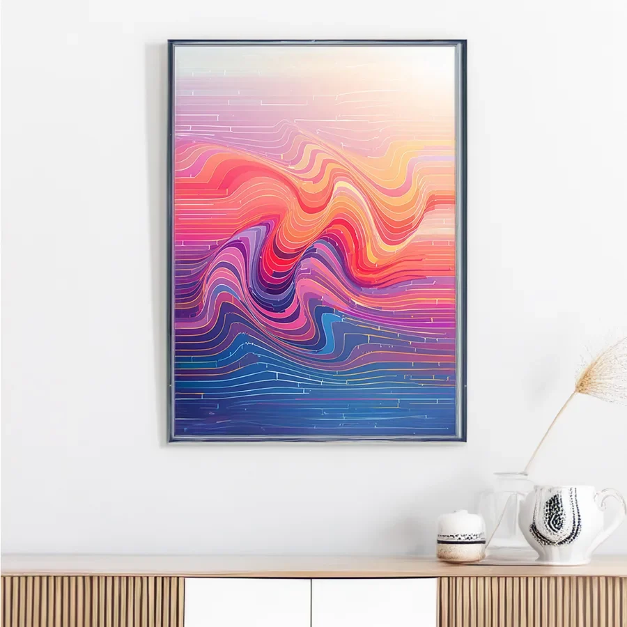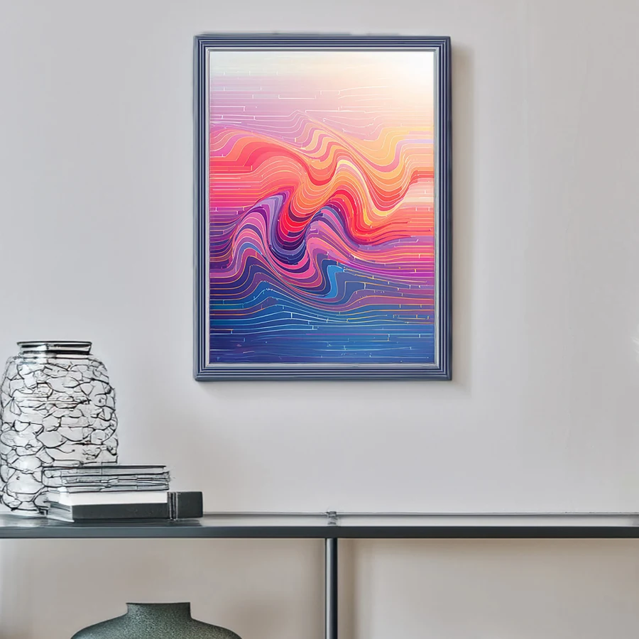Undulating waves of electric sunset hues ripple across the canvas like a topographic acid trip caught in slow motion. The piece masterfully merges vaporwave aesthetics with geological precision, creating a satisfyingly mathematical dance of gradient-soaked contour lines that would make both synthwave producers and geography professors weak in the knees. Look, if you're trying to convince your coworkers you're both professionally put-together AND low-key psychedelic, this is definitely the statement piece your sterile office walls have been begging for.