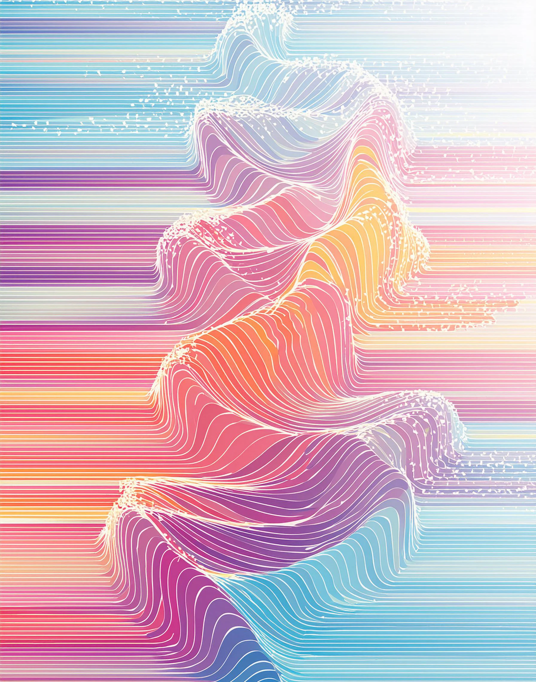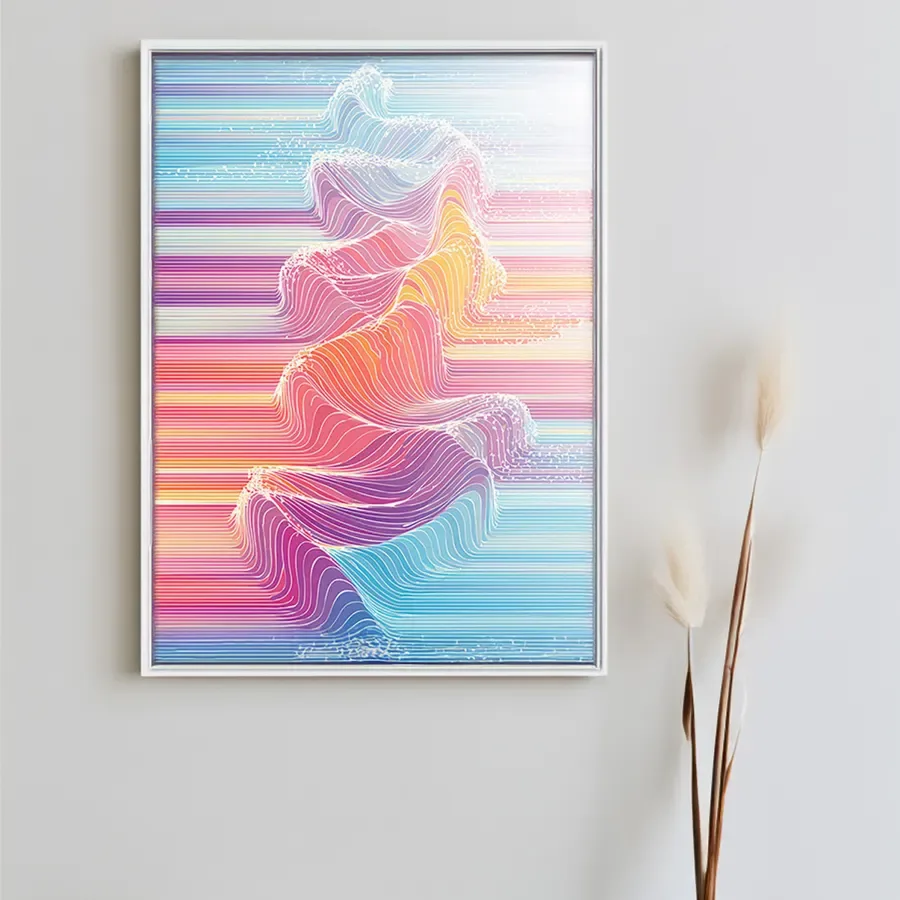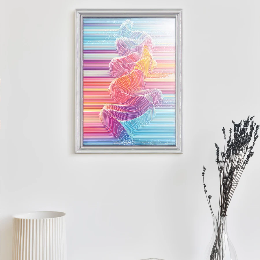 The undulating waves of pastel color dance across the digital canvas like a visual lullaby caught in slow motion, each crest melting seamlessly into the next. This piece masterfully merges vaporwave aesthetics with sacred geometry, creating a mathematically precise yet emotionally fluid composition that wouldn't look out of place in both a meditation app and a synthwave album cover. If you've ever wanted to know what your brain waves look like after drinking three cups of chamomile tea while listening to lo-fi beats, well, this is probably it.
