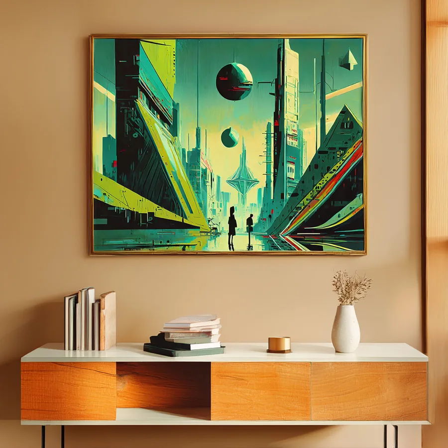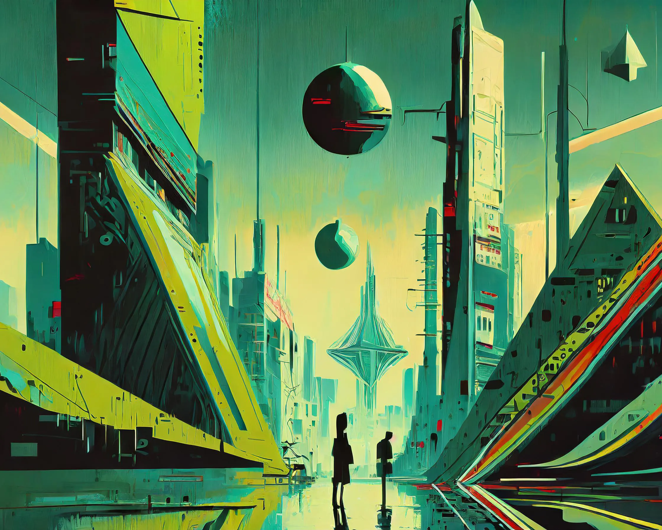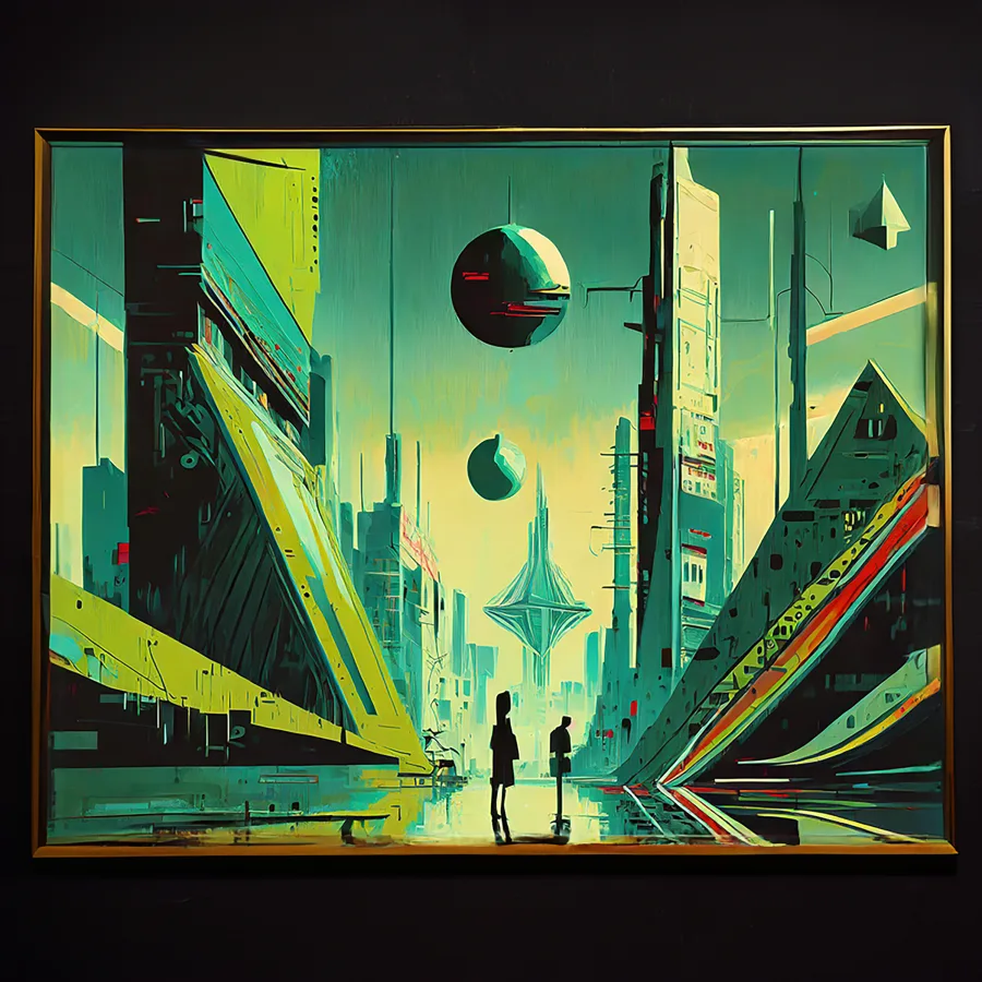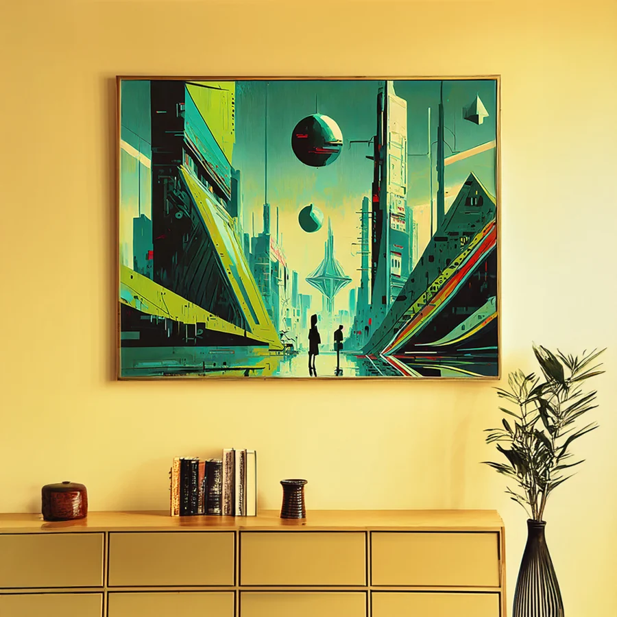 Massive crystalline orbs hover between impossibly tall geometric megastructures, casting ethereal shadows across this neon-drenched cityscape. The whole scene is awash in a fever dream of teal and yellow hues, perfectly capturing that sweet spot where vaporwave aesthetics crash headfirst into retrofuturism. Listen, if you're not already imagining yourself as a brooding cyberpunk protagonist while staring at this piece, you're honestly doing it wrong.