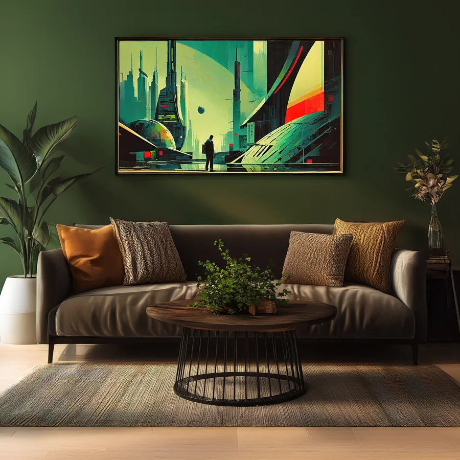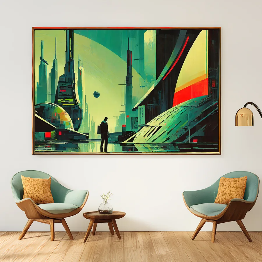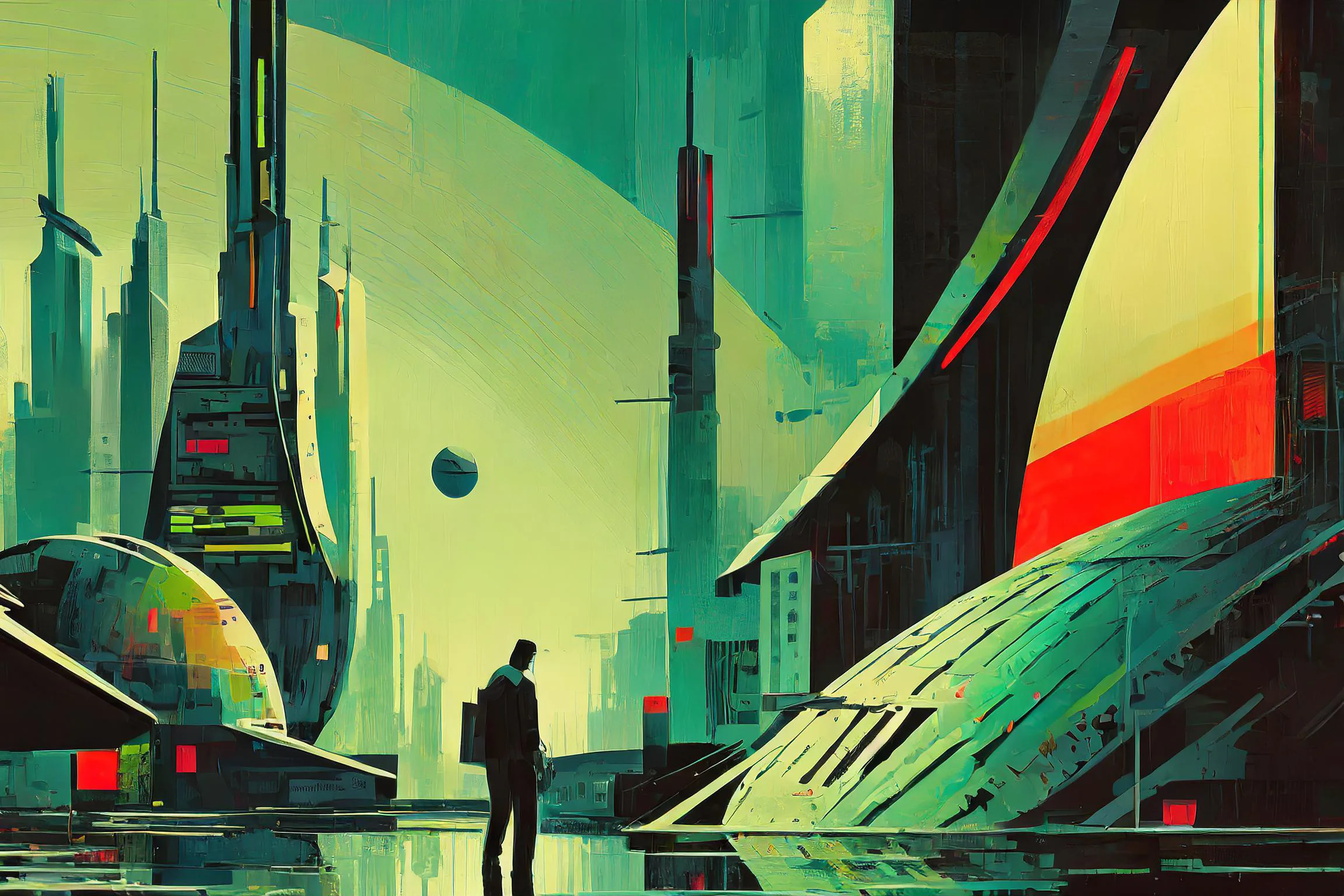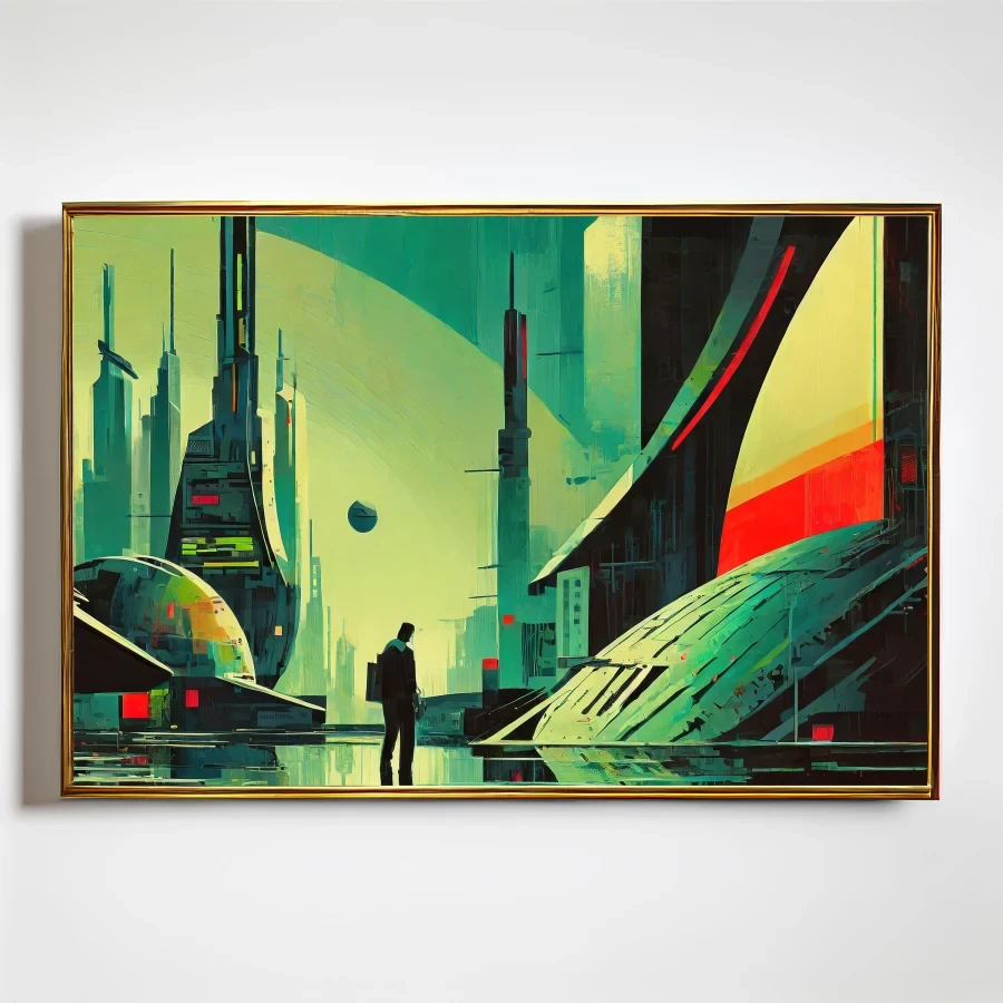 A tiny human silhouette stands utterly alone against a forest of impossibly massive emerald-tinted skyscrapers that pierce the smog-choked heavens like crystalline daggers. The piece masterfully blends retro-futuristic architectural grandiosity with that distinctly crushing 3 AM feeling of being the last person awake in a world that's grown too big for its own good. Look, if you're the kind of person who's ever felt like a cosmic speck while doomscrolling in your apartment at midnight, this artwork is basically your spiritual autobiography.