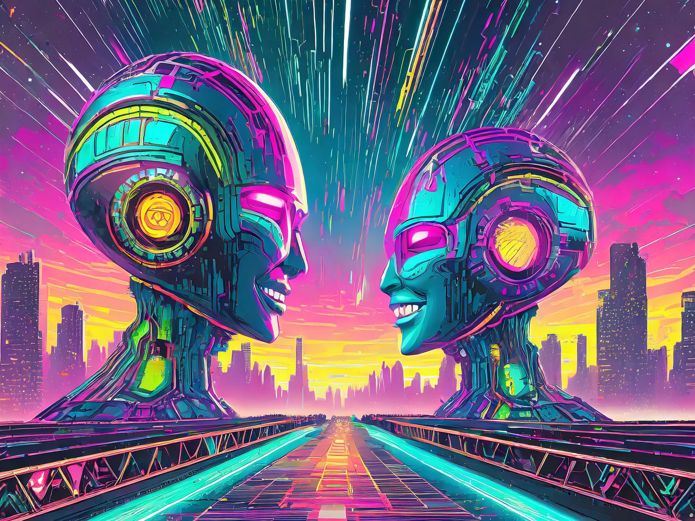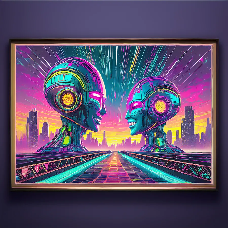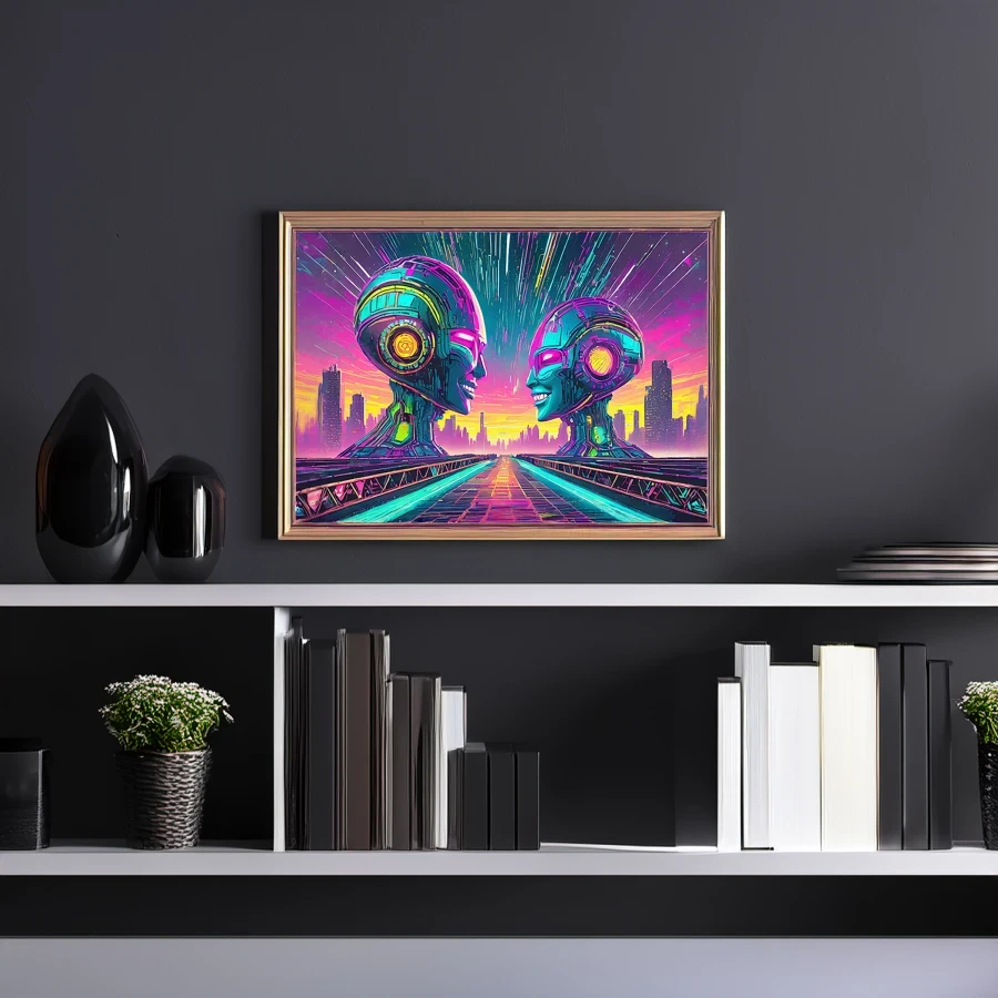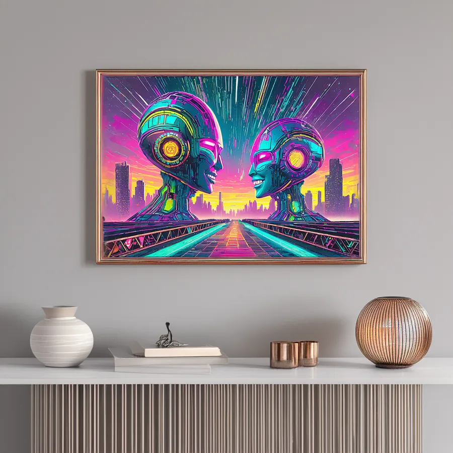 Two luminous android faces emerge from a sea of hot pink and electric blue, their chrome surfaces reflecting the pulsing neon cityscape like technological souls finally finding connection. The piece masterfully blends 80s retrofuturism with modern cyberpunk aesthetics, creating a dreamy synthwave atmosphere that feels like Blade Runner had a baby with a disco ball. Look, if you're not already imagining this as the perfect backdrop for your 3 AM gaming sessions while questioning whether robots can feel love, I don't know what to tell you.