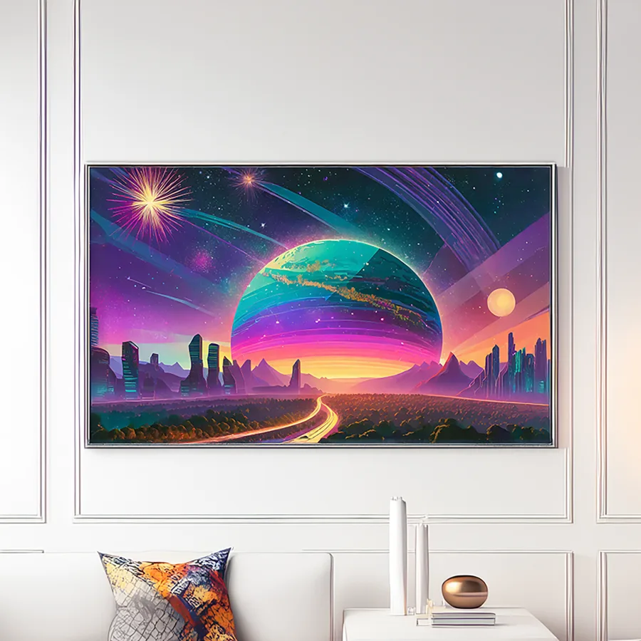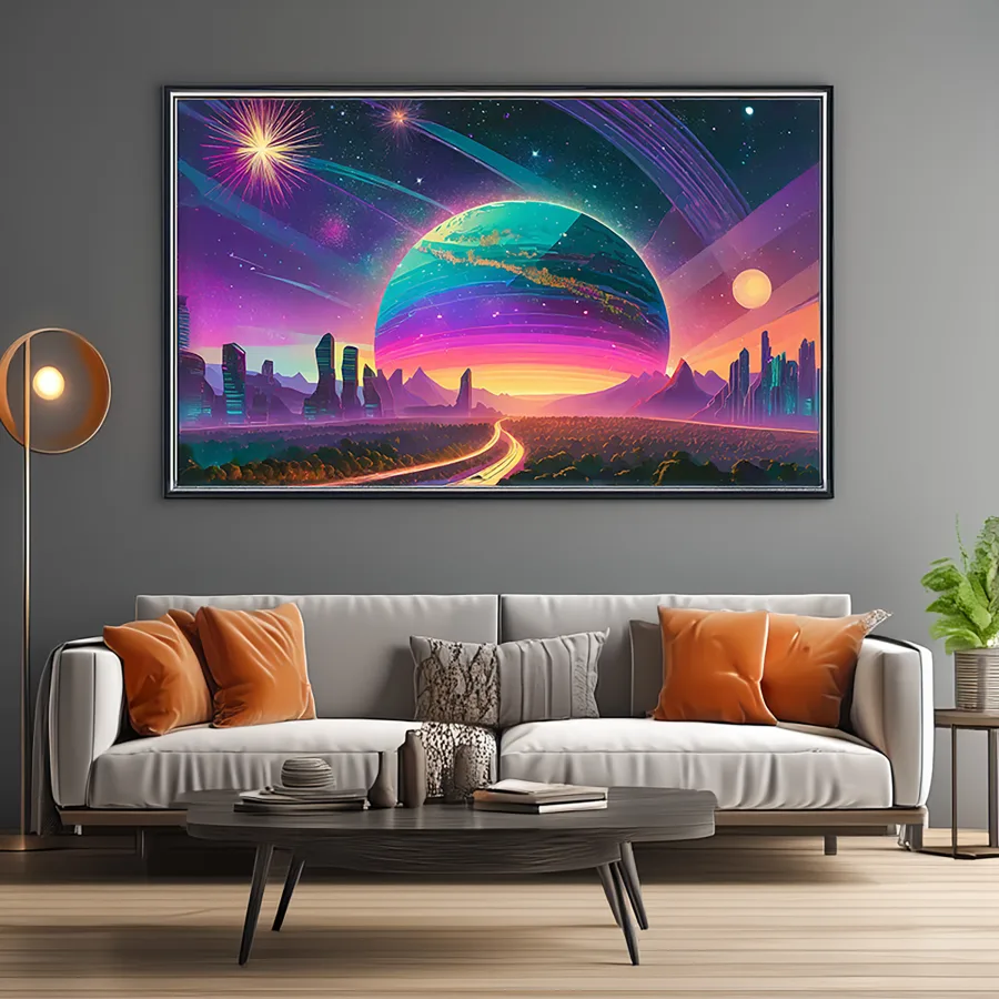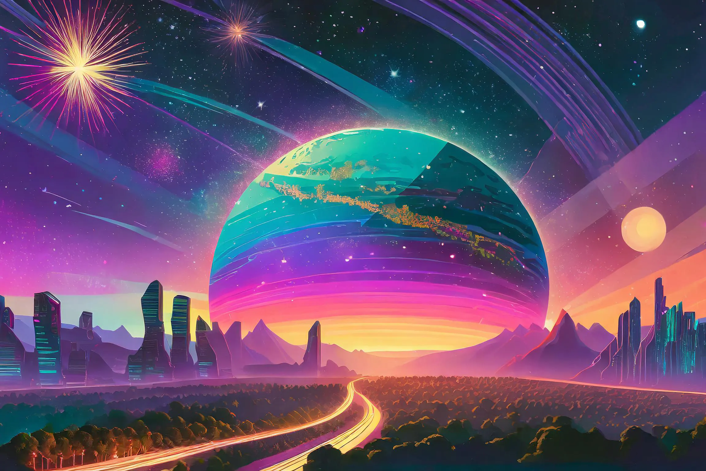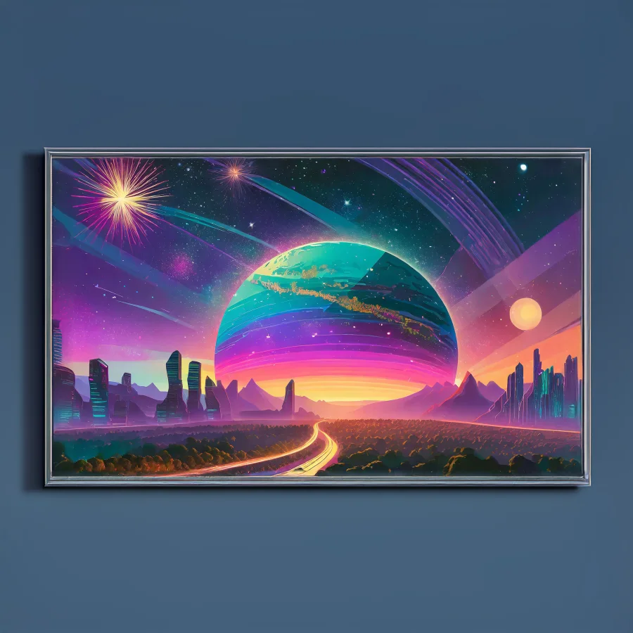 An impossibly massive ringed planet dominates the horizon, its pastel stripes reflecting neon pinks and purples onto a crystalline highway that stretches infinitely into the cosmic void. The entire scene screams classic synthwave aesthetics, with that deliciously retro-futuristic grid pattern merging seamlessly into a vaporwave color palette that would make your 1980s Miami dealer jealous. Look, if you're not already making this your desktop background and pretending you're cruising through space in your DeLorean while blasting some lofi beats, I honestly don't know what you're doing with your life.