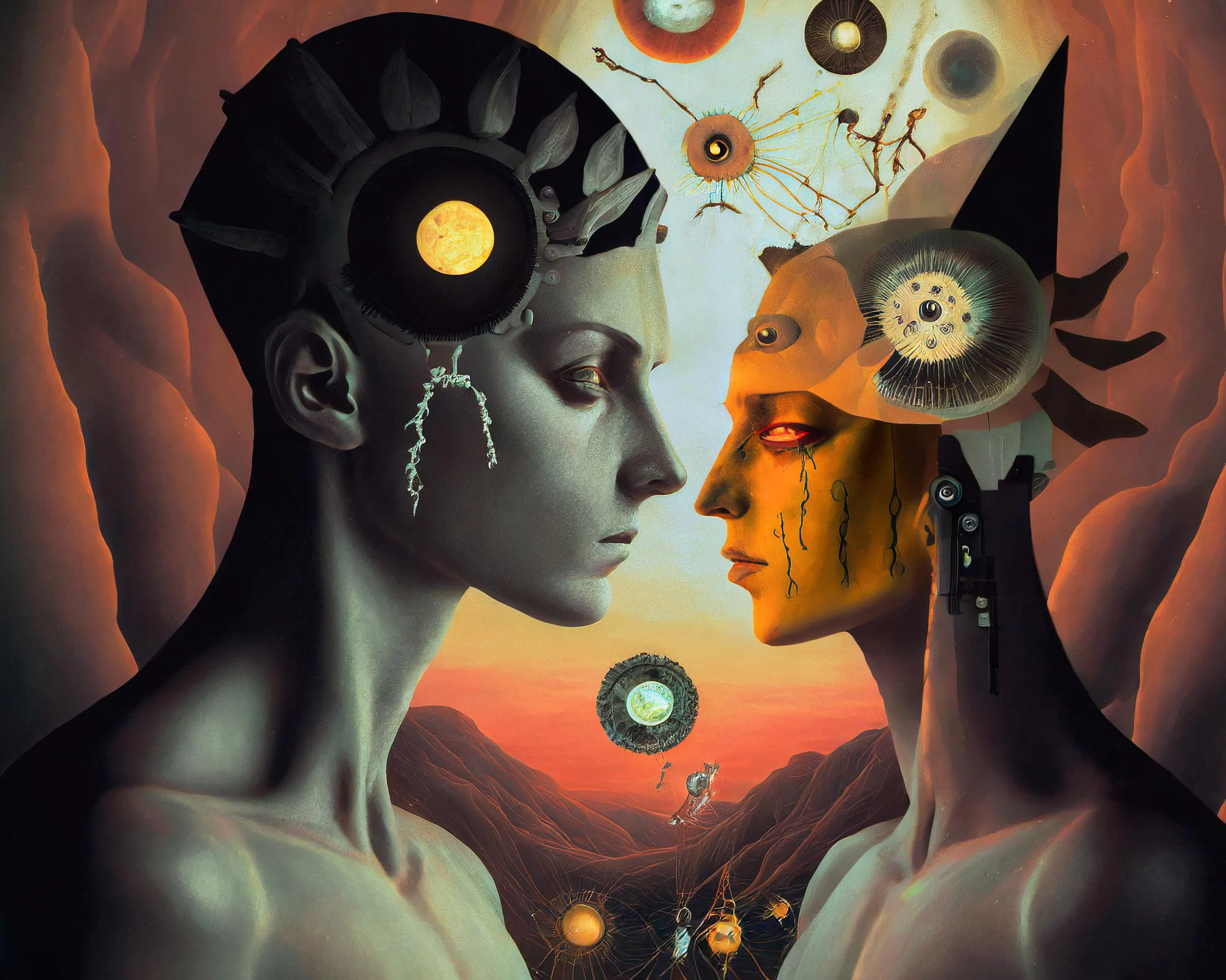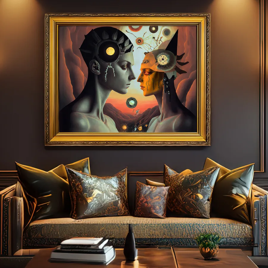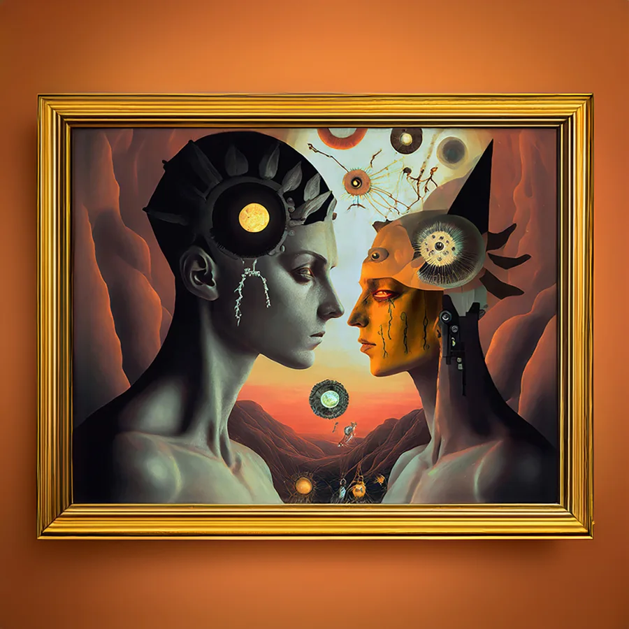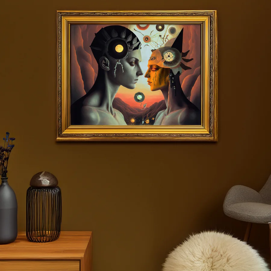 Luminous crystalline orbs hover in zero gravity, pulsing with an inner light that seems to dance between electric blue circuitry and warm organic patterns. The piece merges retrofuturistic android aesthetics with sacred geometry, creating a meditation on what consciousness might look like if you could somehow screenshot your own enlightenment. Look, I'm not saying this artwork will make you achieve robot nirvana, but hanging it in your meditation room might just help you transcend your meat prison and join the silicon singularity.