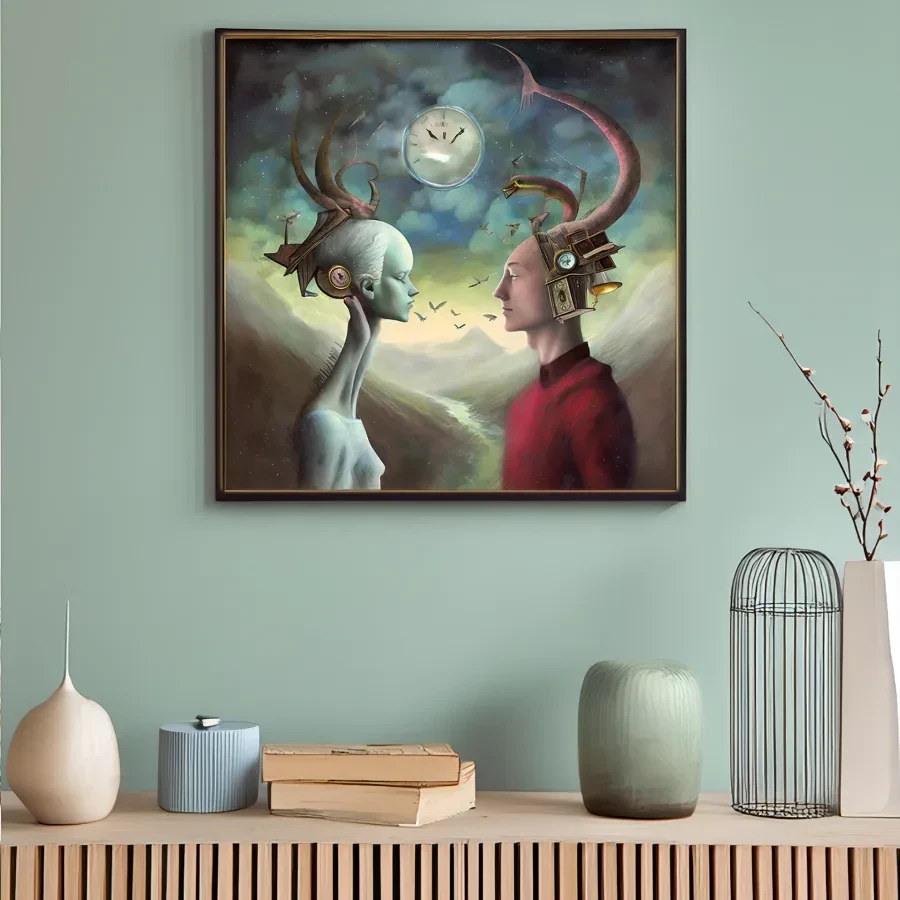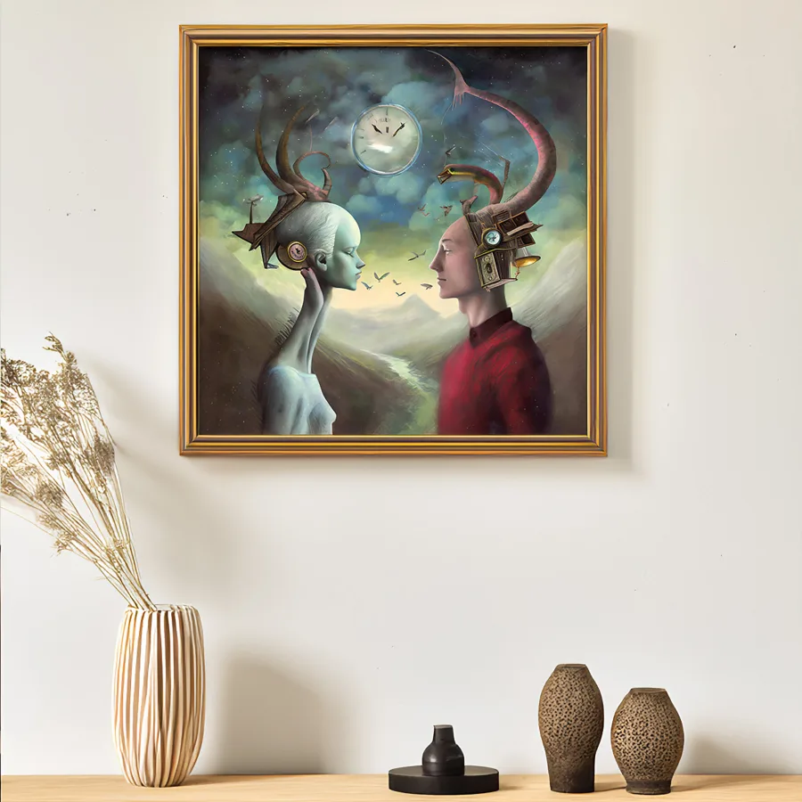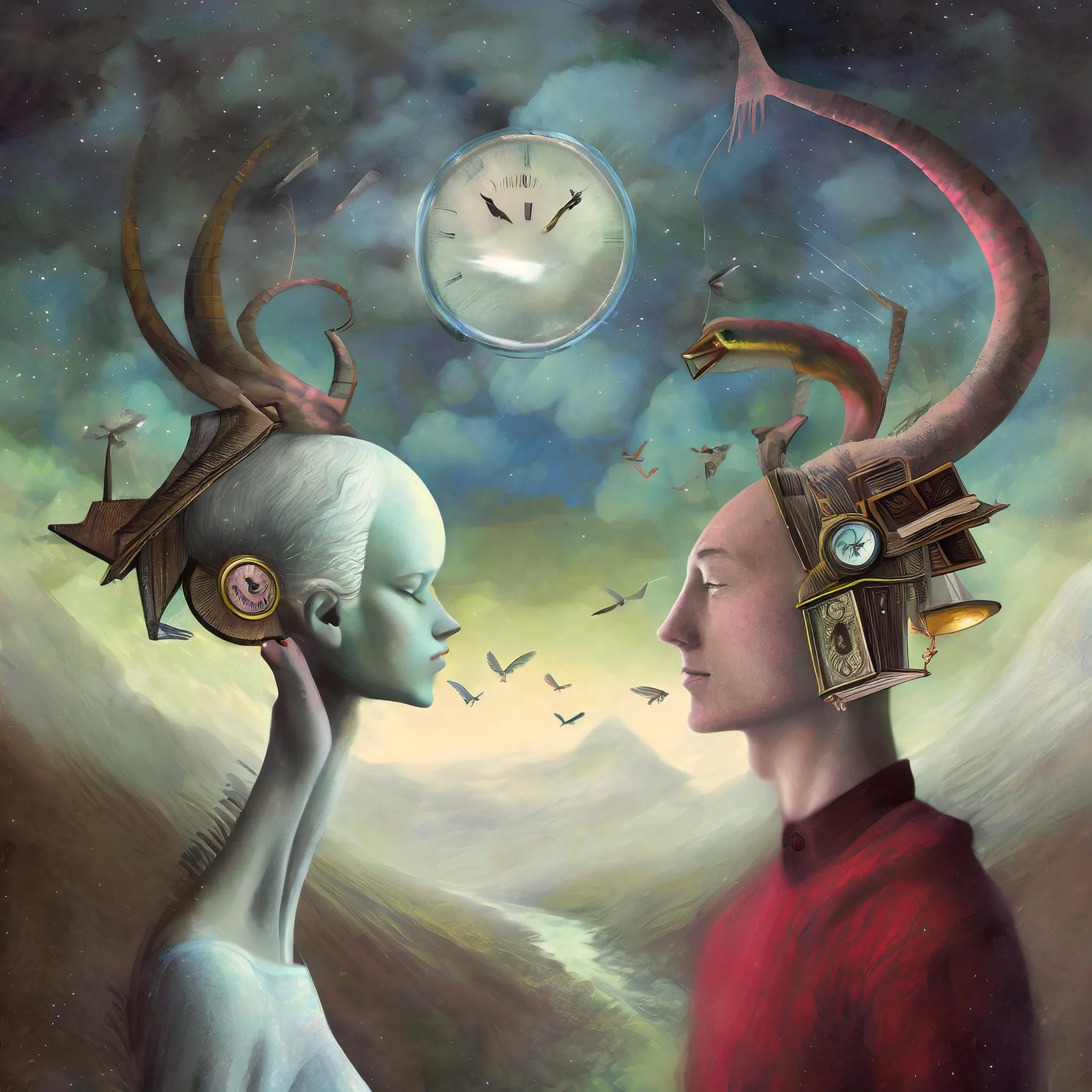 A melancholic alien being reaches across the void to touch fingertips with a human figure, their forms illuminated by a constellation of floating clockwork gears and ethereal light. The dreamlike scene unfolds in rich purples and deep teals, with delicate brass mechanical details threading through both beings' minds like steampunk neural pathways connecting their consciousness. Hey, if you're staring at this at 3 AM questioning your existence while eating cold pizza, you're definitely doing it right.