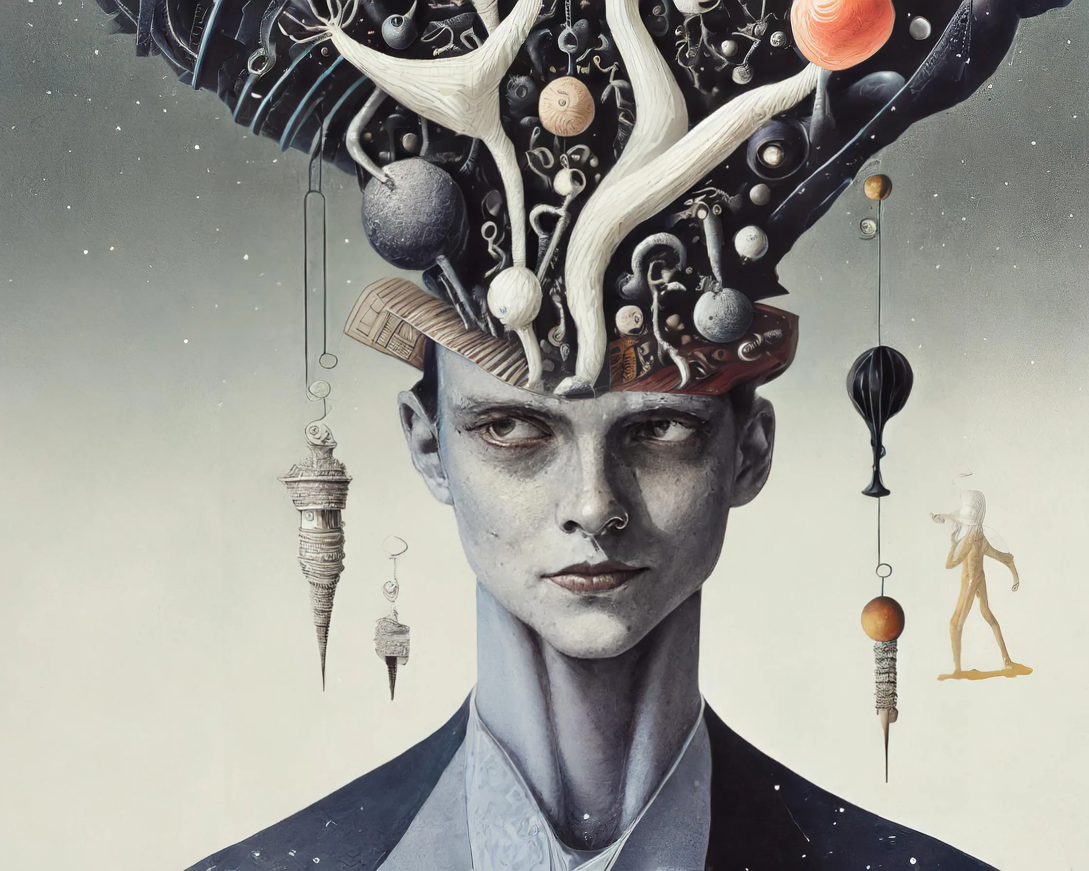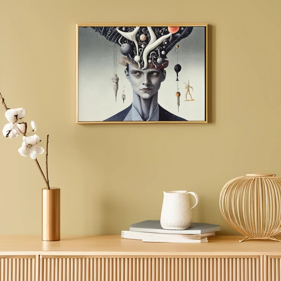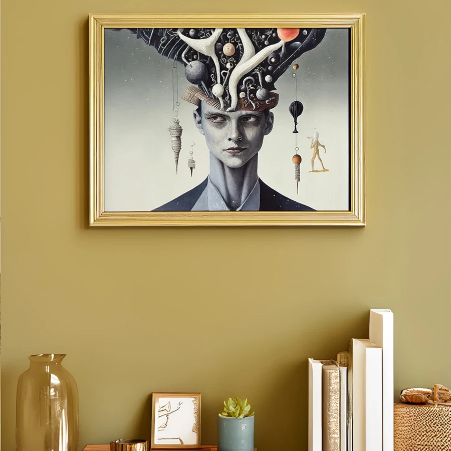 A human head fractures into a cosmic kaleidoscope of swirling galaxies and neural pathways, creating a mesmerizing portal between inner and outer space. The ethereal dreamscape merges sacred geometry with quantum mechanics in a style that would make Salvador Dali drop his melting watches in awe. Look, if you're trying to convince your therapist you're having an existential breakthrough while secretly microdosing, this is definitely the artwork you need on their wall.