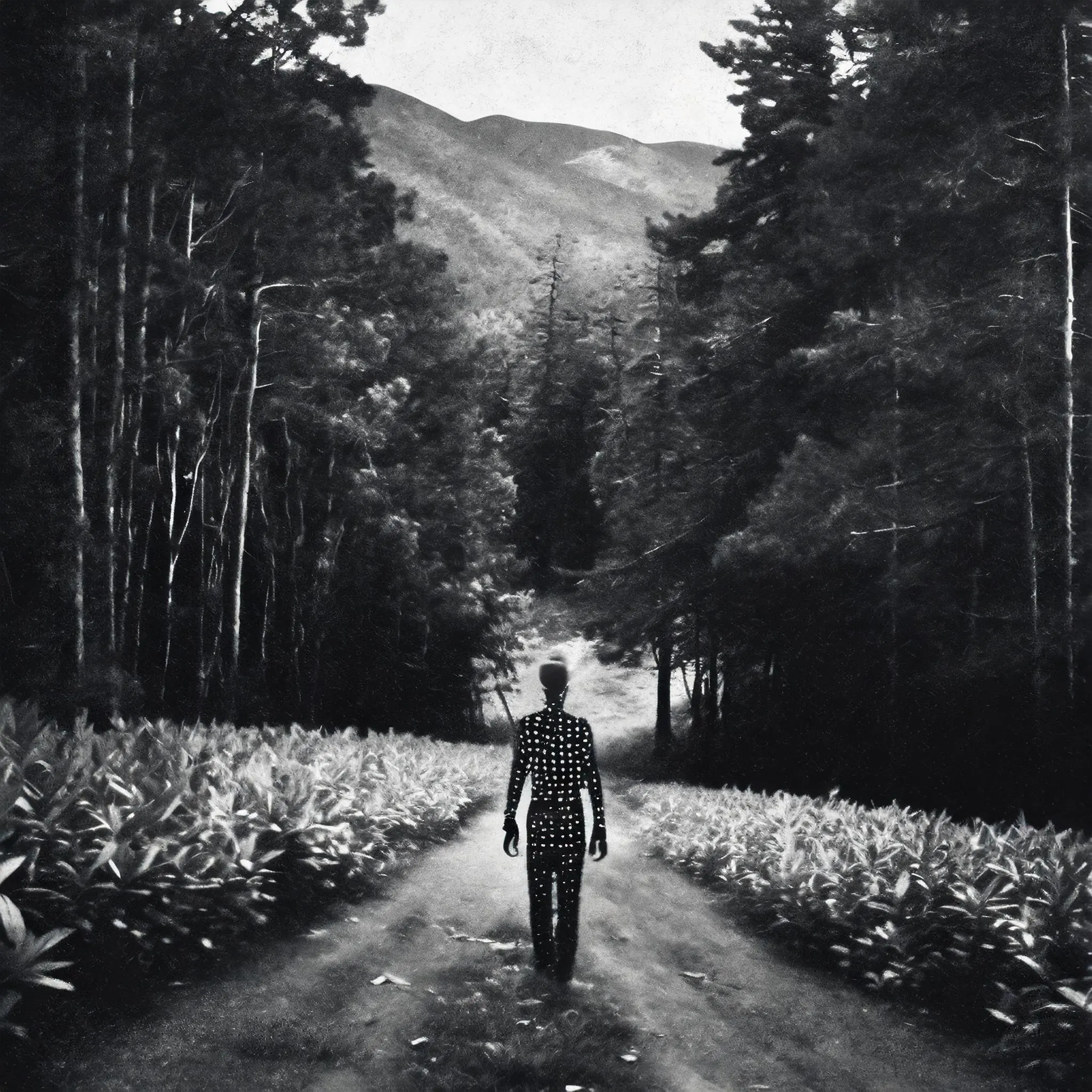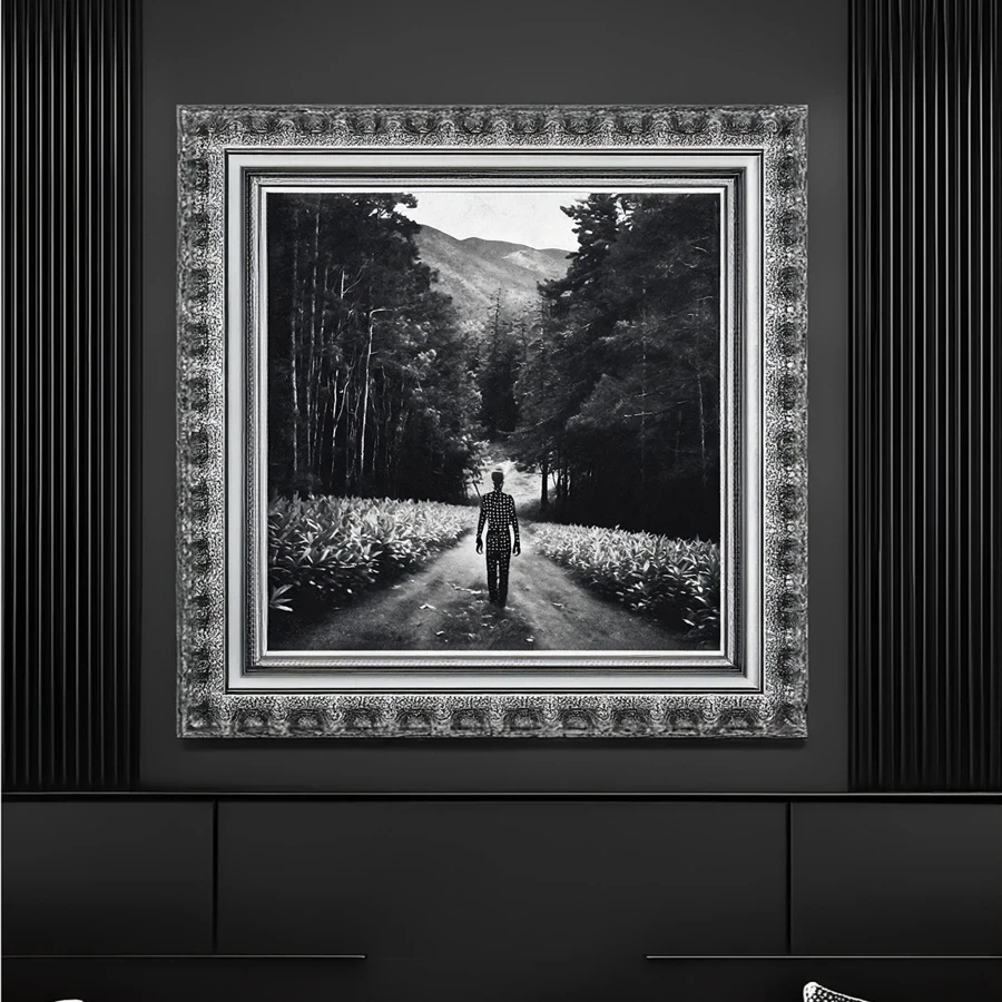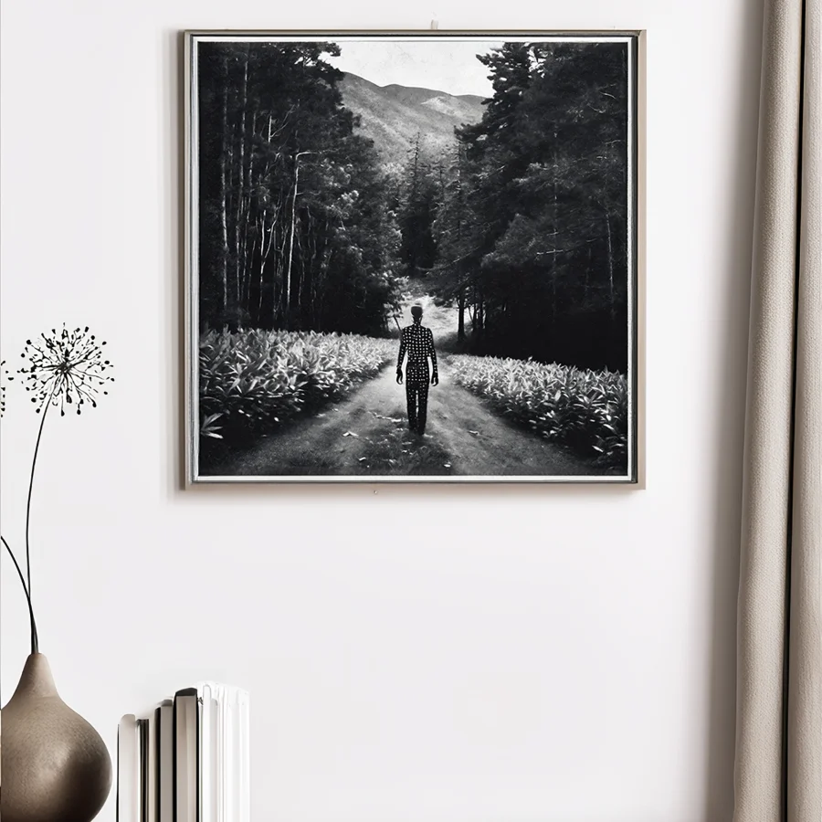 A solitary figure cloaked in swirling starlight drifts down a twisted forest path, their ethereal form seeming to float between the stark black trees like a cosmic hallucination made manifest. The monochromatic composition creates a dreamy liminal space where reality blurs, combining dark academia aesthetics with surreal fantasy elements in a way that would make del Toro slow clap in approval. Look, if you're not immediately plotting to hang this in your bedroom while burning black candles and pretending you're the main character in some haunted boarding school narrative, we probably can't be friends.
