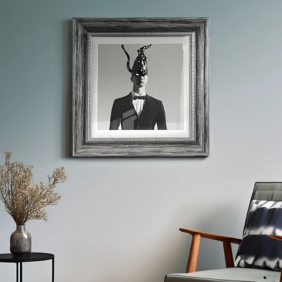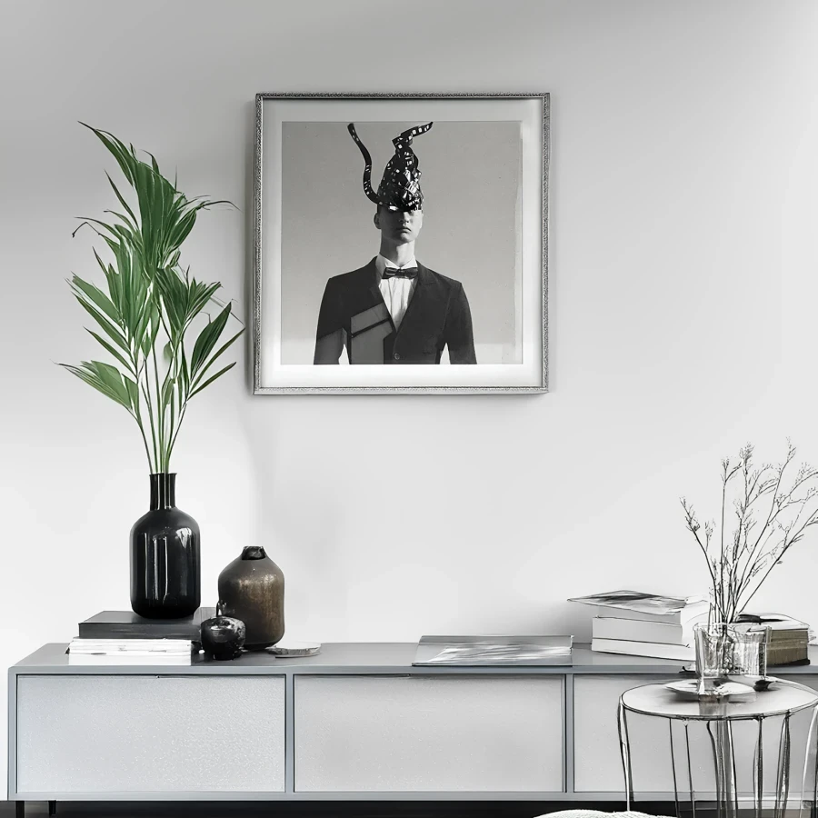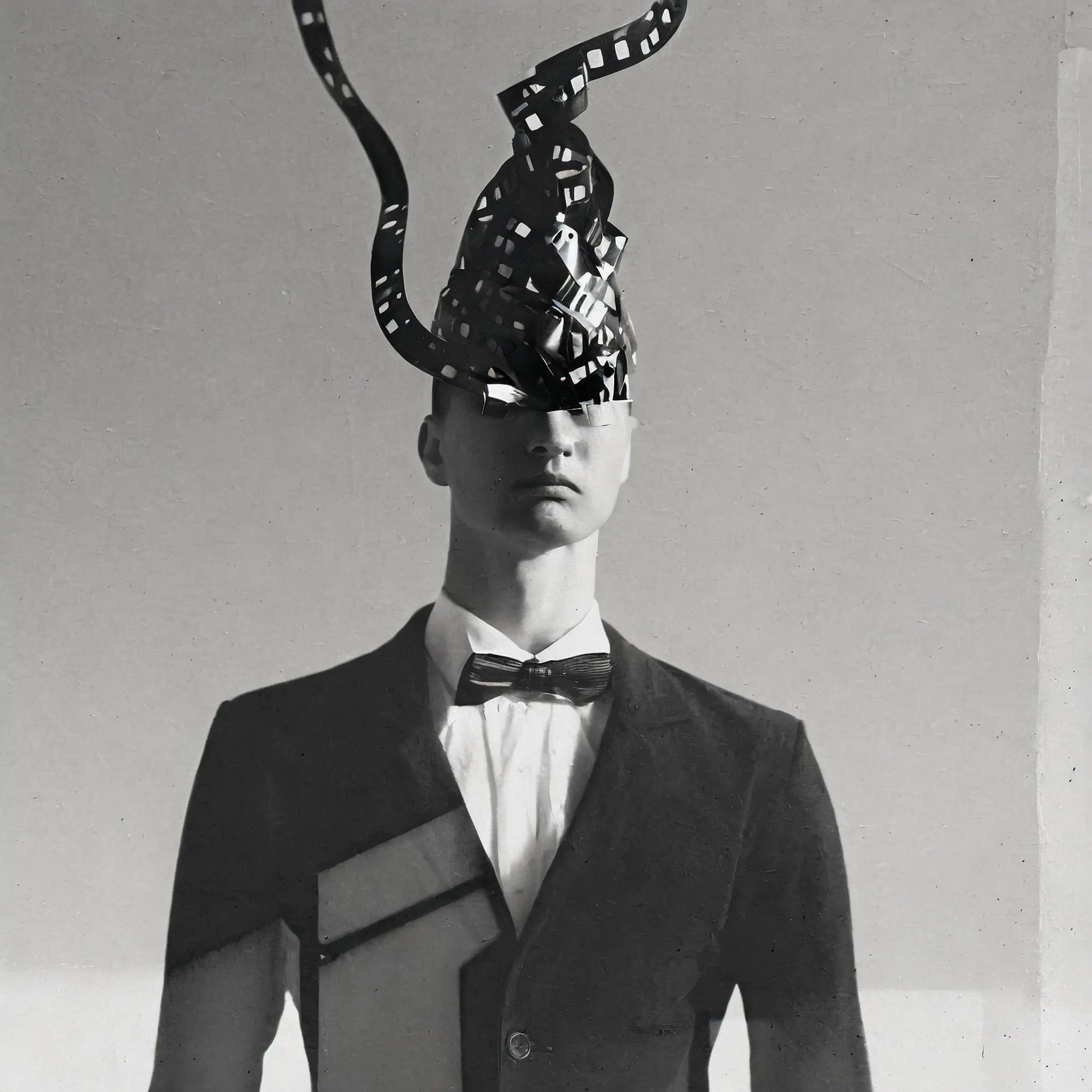 A mesmerizing crown of cascading film strips wraps around the subject's head like a dark halo, creating an unsettling fusion of Hollywood glamour and mechanical decay. The high-contrast black and white photography pulls from both classic fashion portraiture and experimental cinema, with each coil of celluloid catching light in a way that makes you question if you're looking at a still image or a moving picture. Look, if you're not planning to hang this in your pretentious indie film studio while loudly explaining to visitors how it "represents the death of analog cinema," I don't even know what you're doing with your life.